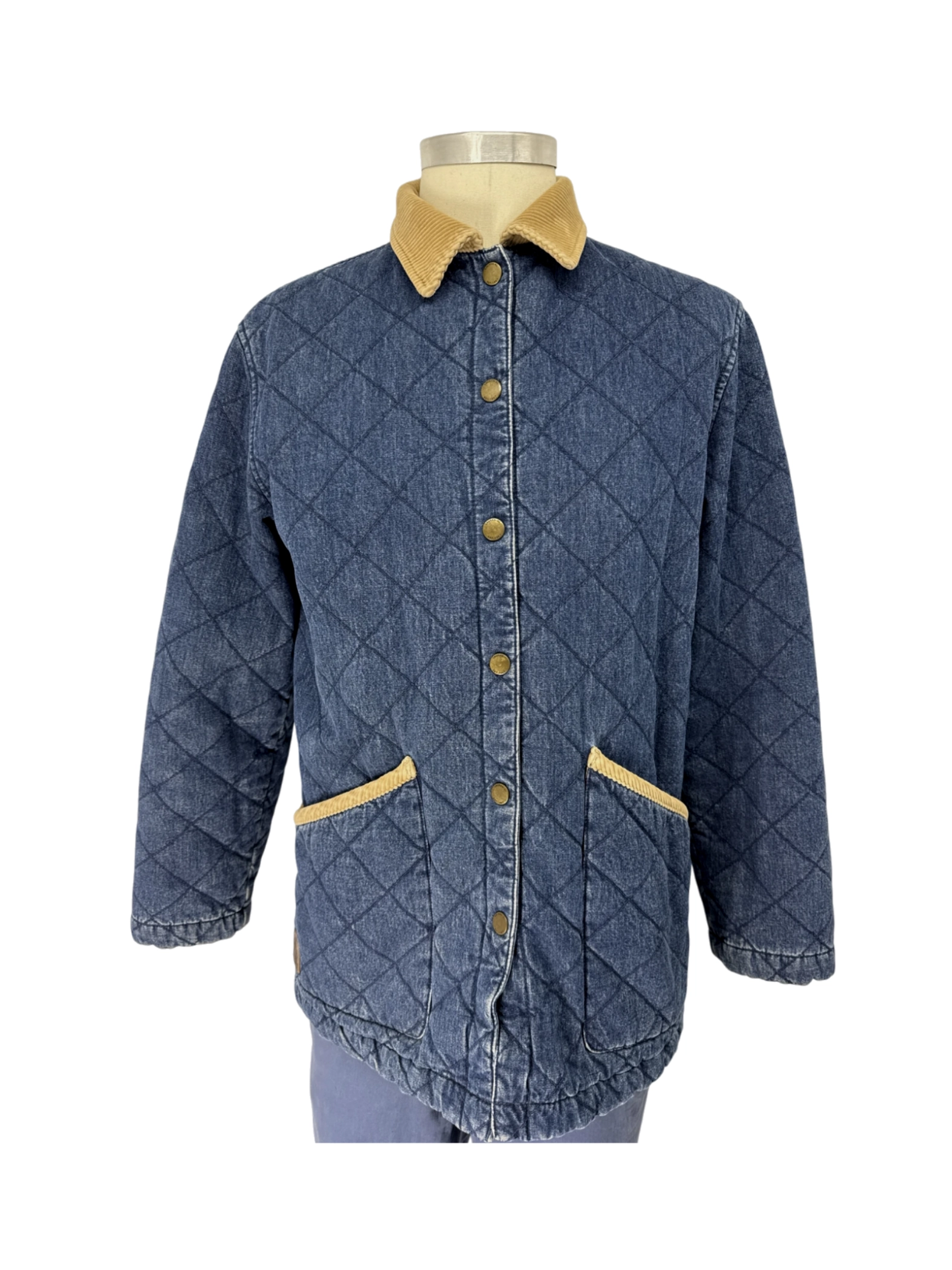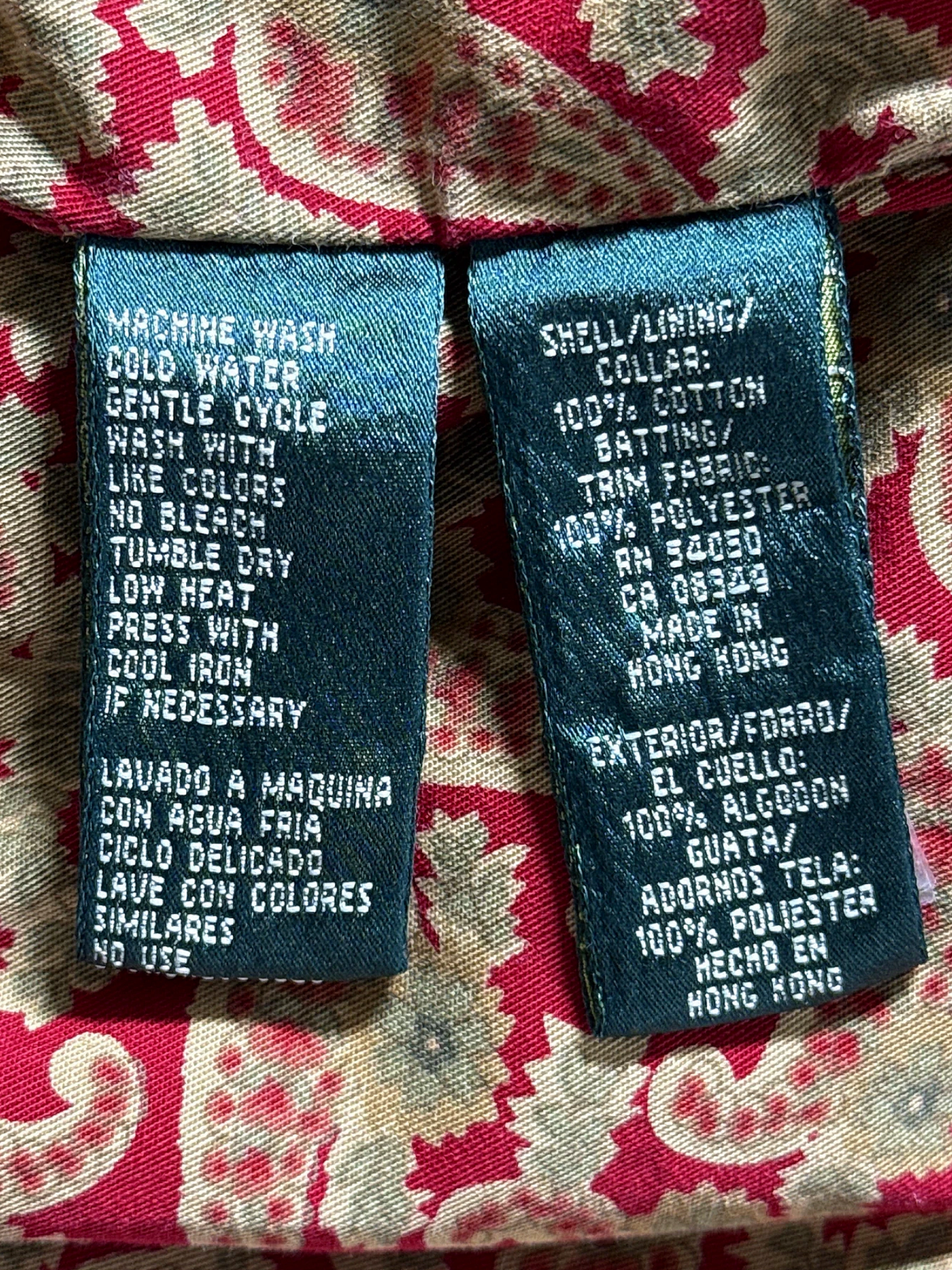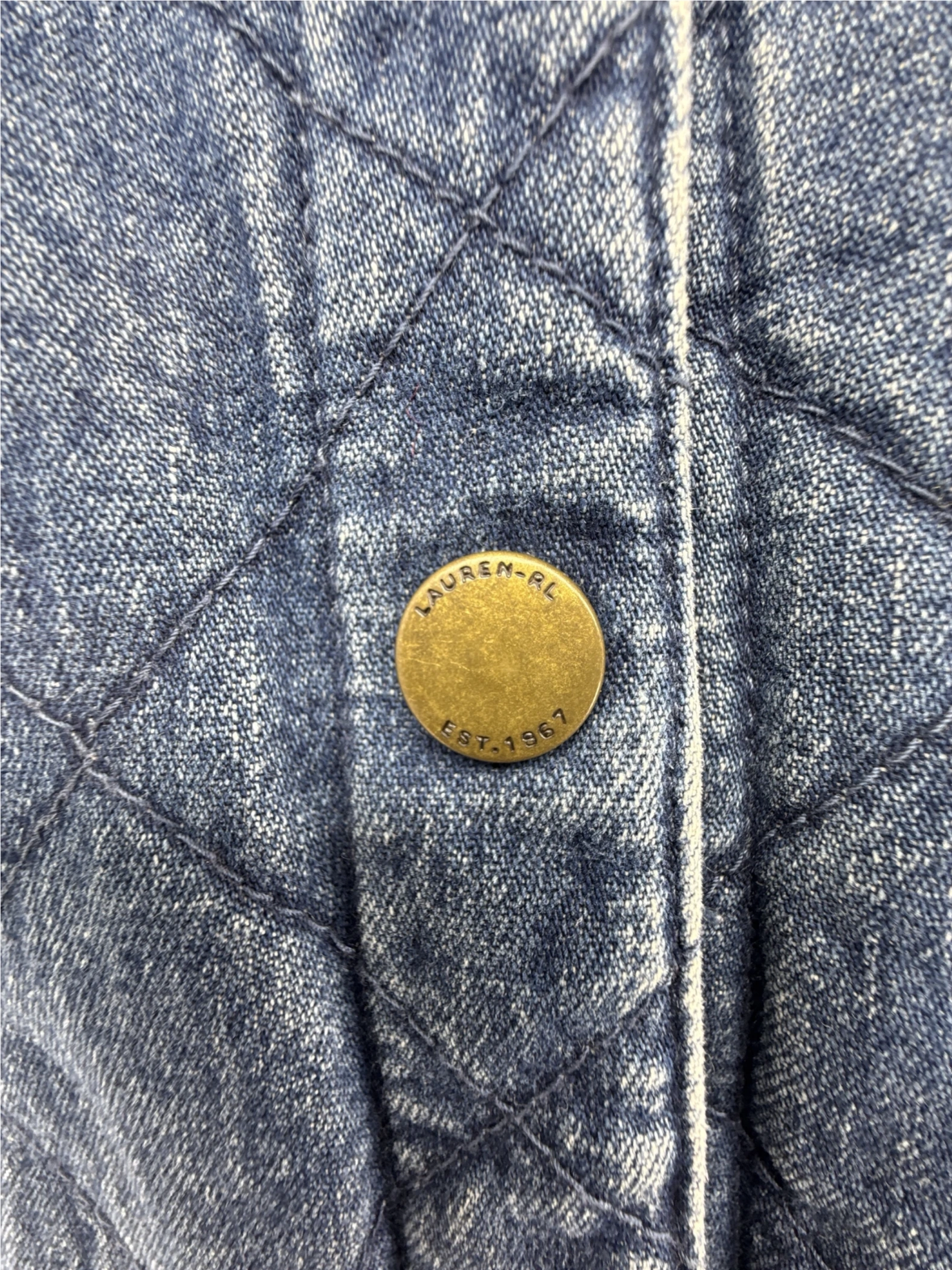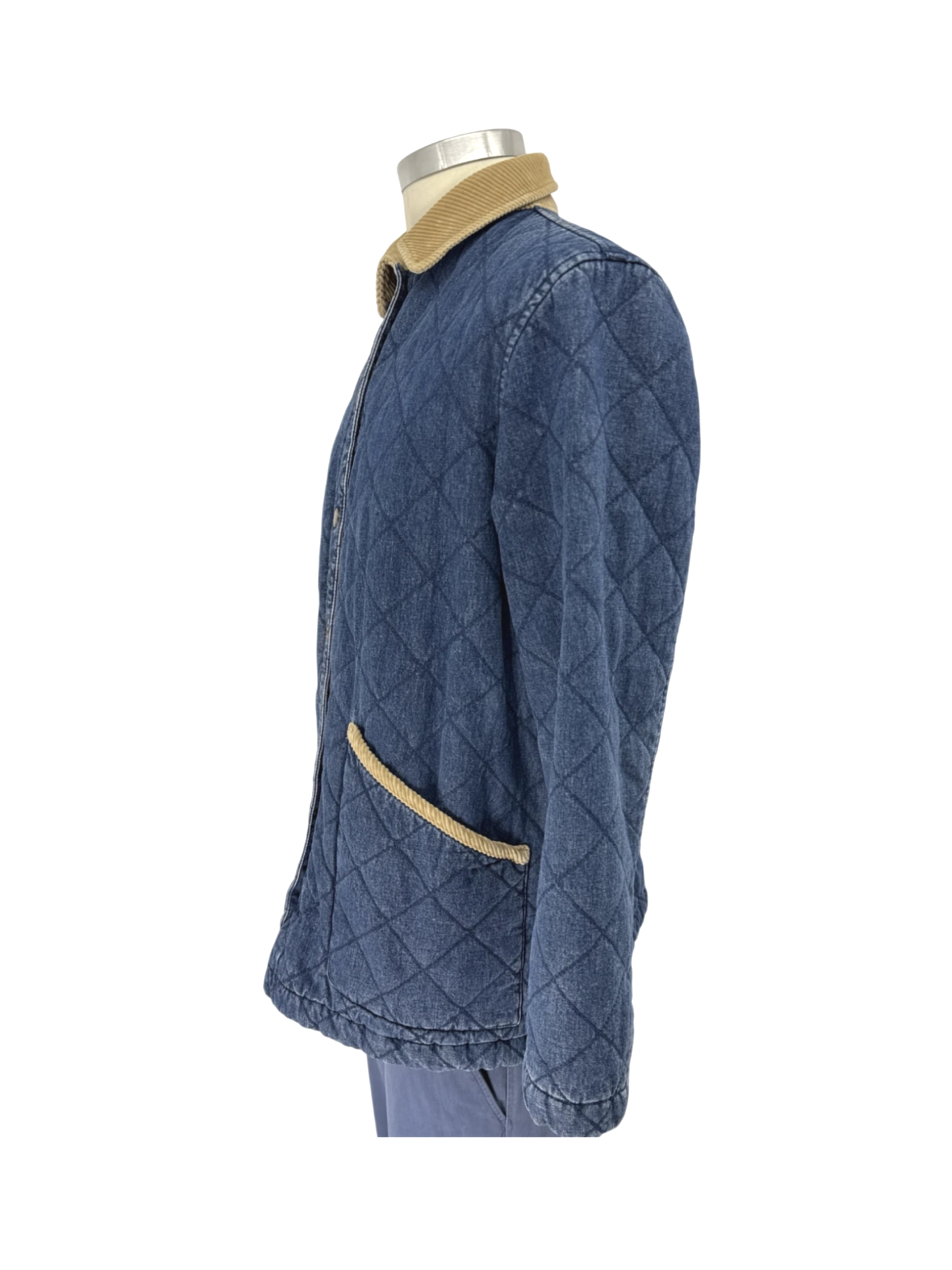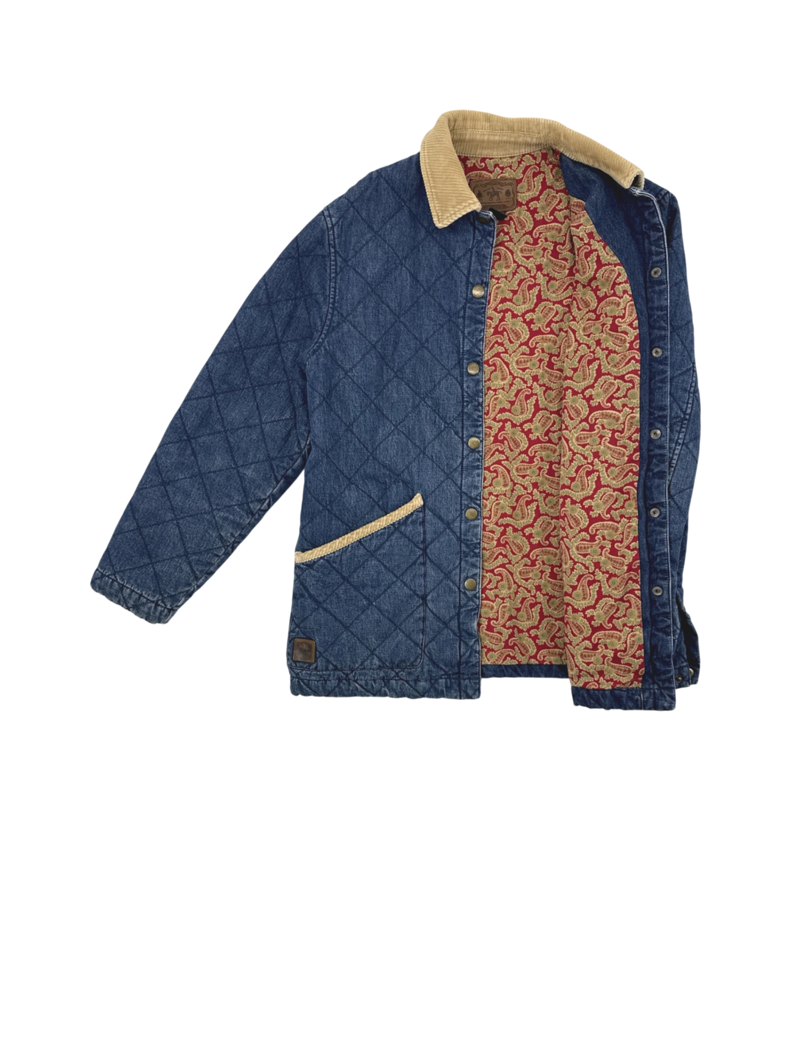 1990s Vintage Ralph Lauren Denim Jacket Paisley Lining Jean Jacket - This vintage Ralph Lauren jacket is a stylish and versatile addition to any wardrobe. Made from a durable cotton and polyester blend denim, it features a classic quilted design with a corduroy collar and unique paisley lining. This jacket is perfect for layering during the fall and winter seasons. With its timeless appeal and quality craftsmanship, it's a great find for those seeking a pre-owned, quality garment.