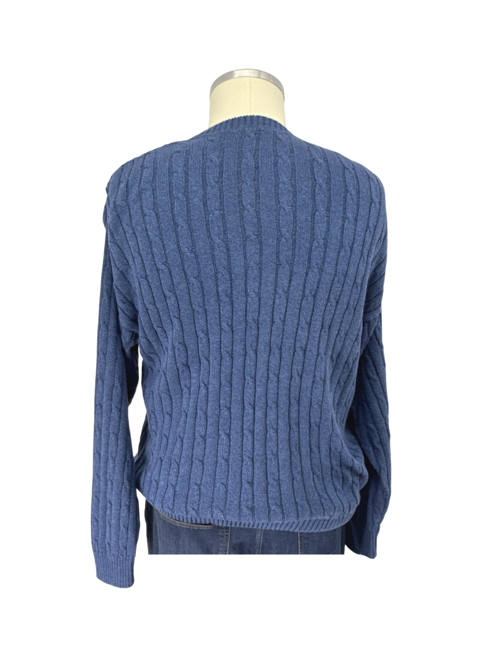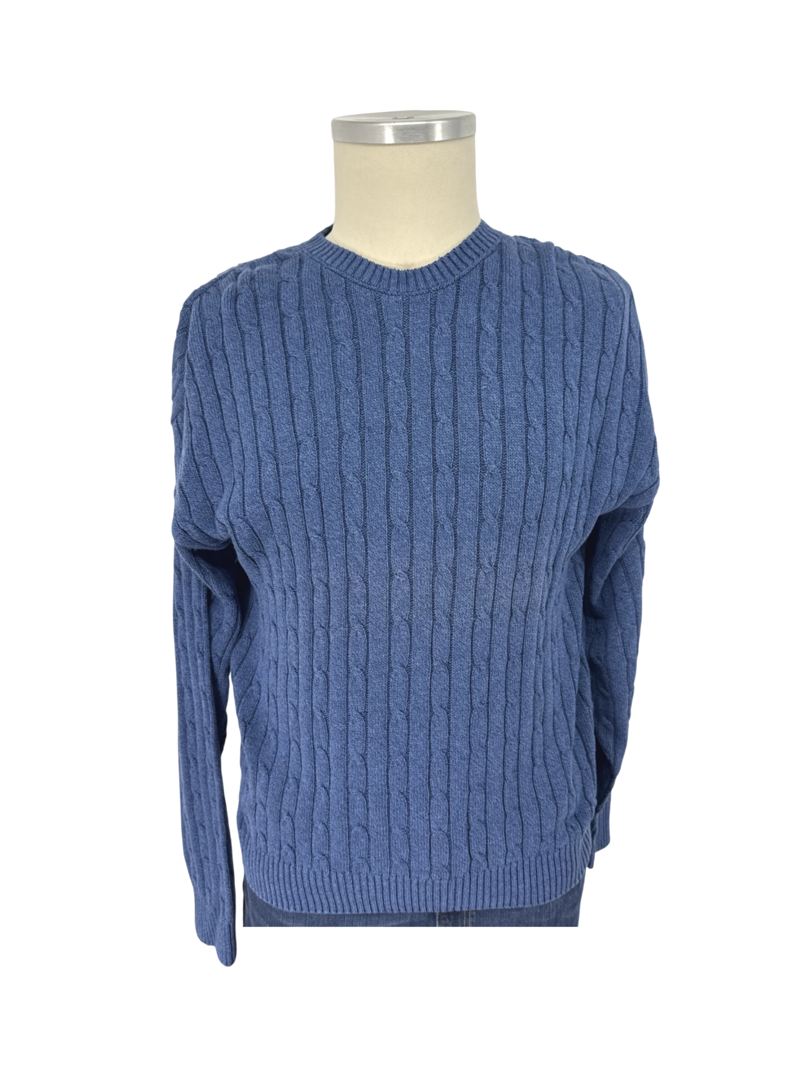 This Brooks Brothers cable knit sweater for men is a classic addition to any wardrobe. Made from 100% cotton, this pre-owned sweater offers a comfortable fit and timeless style. The crew neck and long sleeves make it perfect for layering during cooler months. The classic blue color is versatile and easy to pair with various outfits. A great choice for both casual and smart-casual occasions. Made in the USA. - Elevate your wardrobe with this pre-owned Brooks Brothers men's sweater. Crafted from 100% cotton, this classic blue crew neck sweater features a timeless cable-knit design. The long sleeves and comfortable fit make it perfect for layering in the colder months. A versatile addition to any man's closet, ideal for casual outings or slightly more formal settings. This sweater blends comfort, style, and quality. A great find for the discerning shopper!