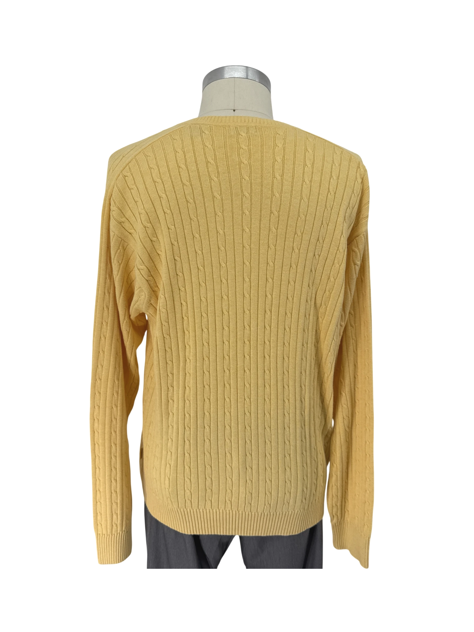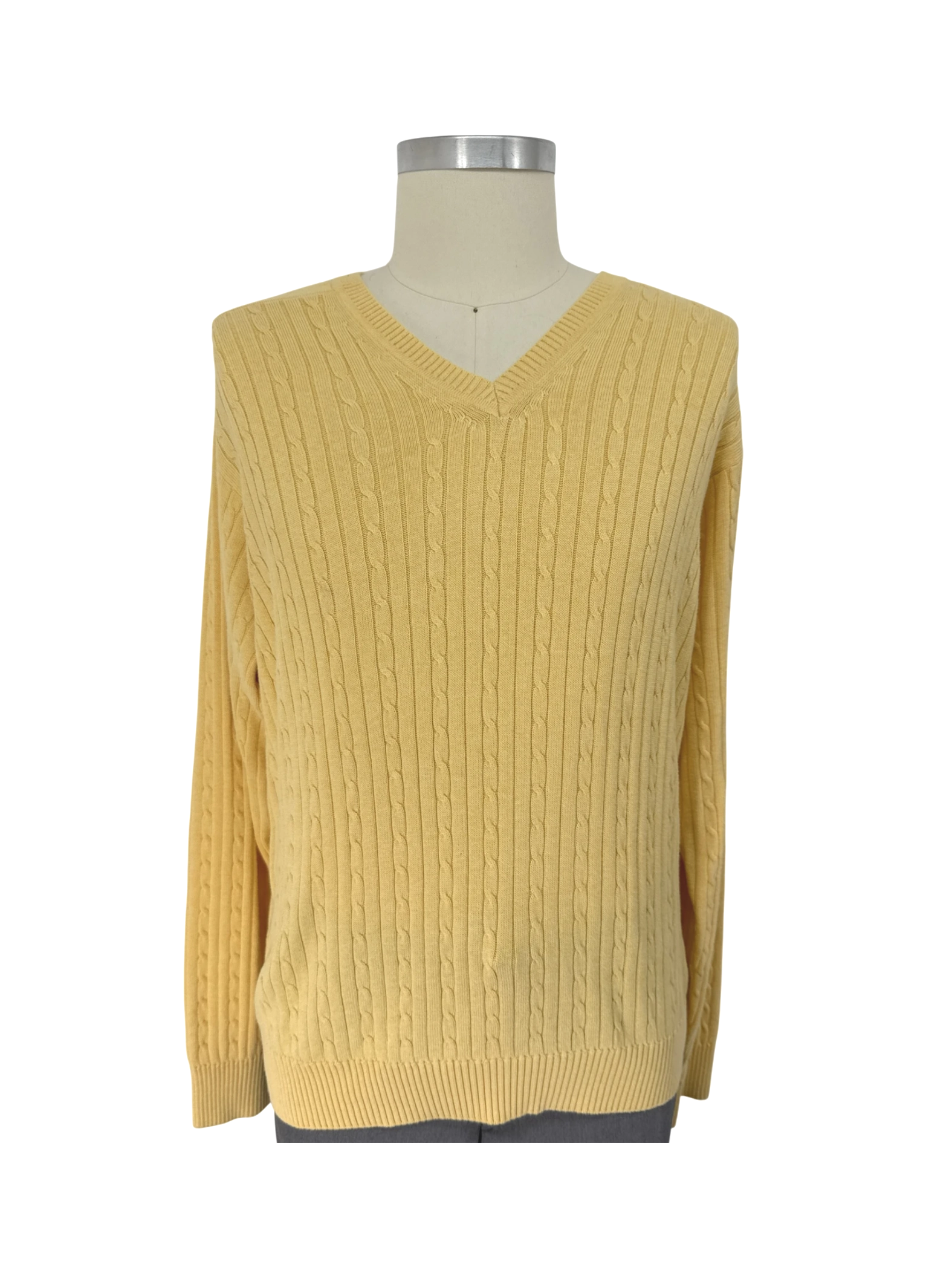 This IZOD cable knit sweater is a classic addition to any wardrobe. Crafted from 100% cotton, it offers a comfortable and warm feel, perfect for cooler days. Featuring a flattering V-neck and long sleeves, this sweater is suitable for both casual and semi-formal occasions. The bright yellow hue makes it a versatile piece, easily paired with jeans or trousers for a polished look. Pre-owned, offering both style and value.