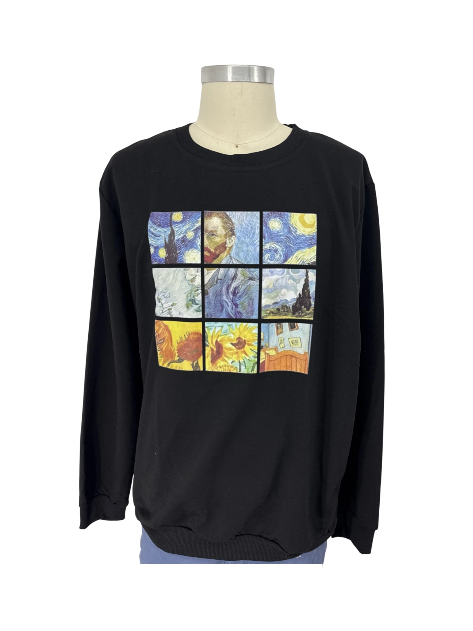 Elevate your casual style with this unique, pre-owned black sweater featuring a vibrant collage inspired by Van Gogh's iconic artworks. This comfortable pullover, crafted from a blend of cotton and polyester, is perfect for art lovers and anyone looking to add a touch of artistic flair to their wardrobe. The classic crew neck and long sleeves ensure a timeless look, making it a versatile piece for any season.