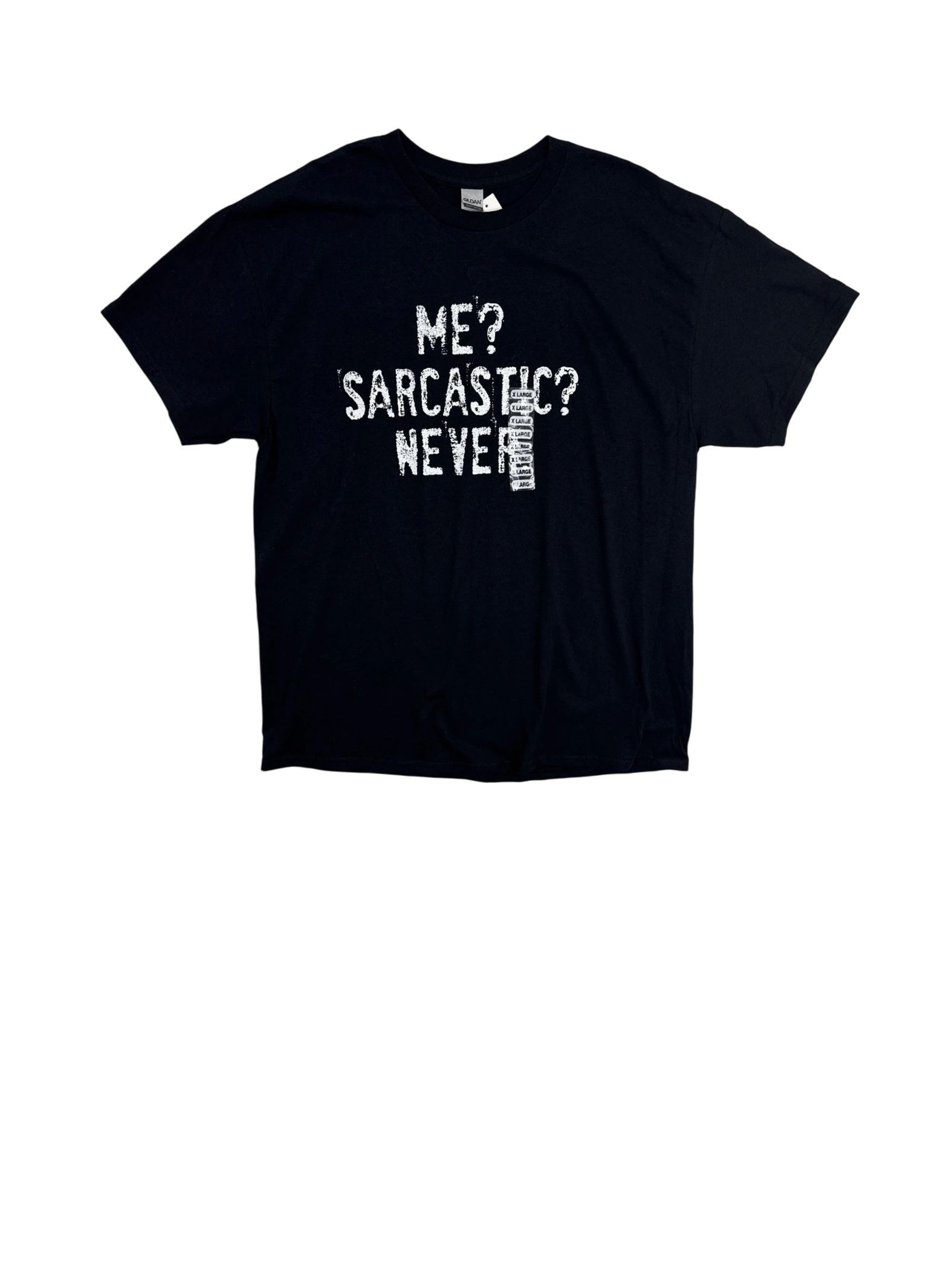 This Gildan t-shirt is a perfect addition to any wardrobe, featuring a bold and witty "ME? SARCASTIC? NEVER" graphic. Made from heavy cotton, this pre-owned black tee offers both comfort and durability. Ideal for casual wear, it's suitable for any season and a great way to express your personality with a touch of humor. A stylish and fun piece for everyday wear.