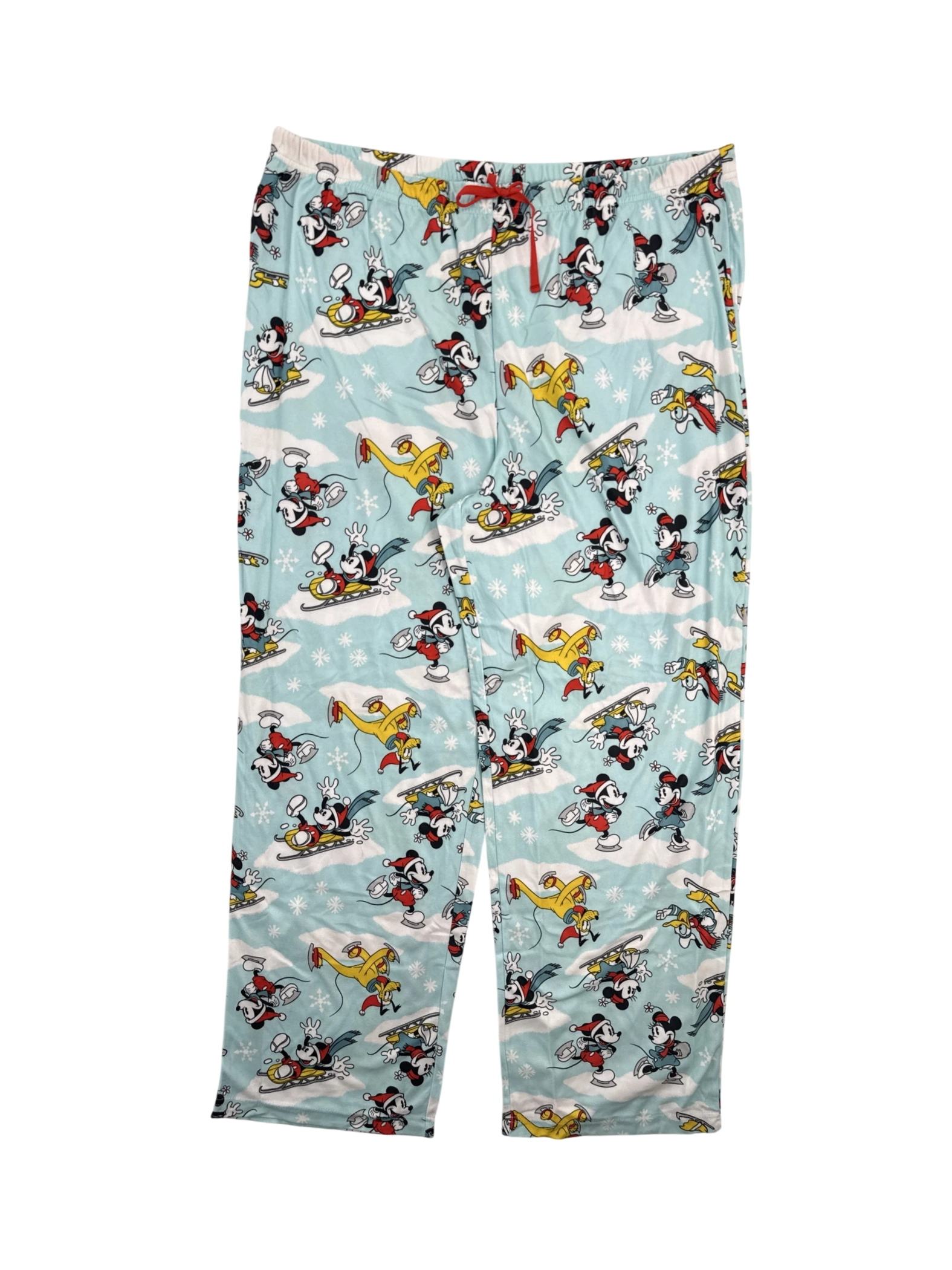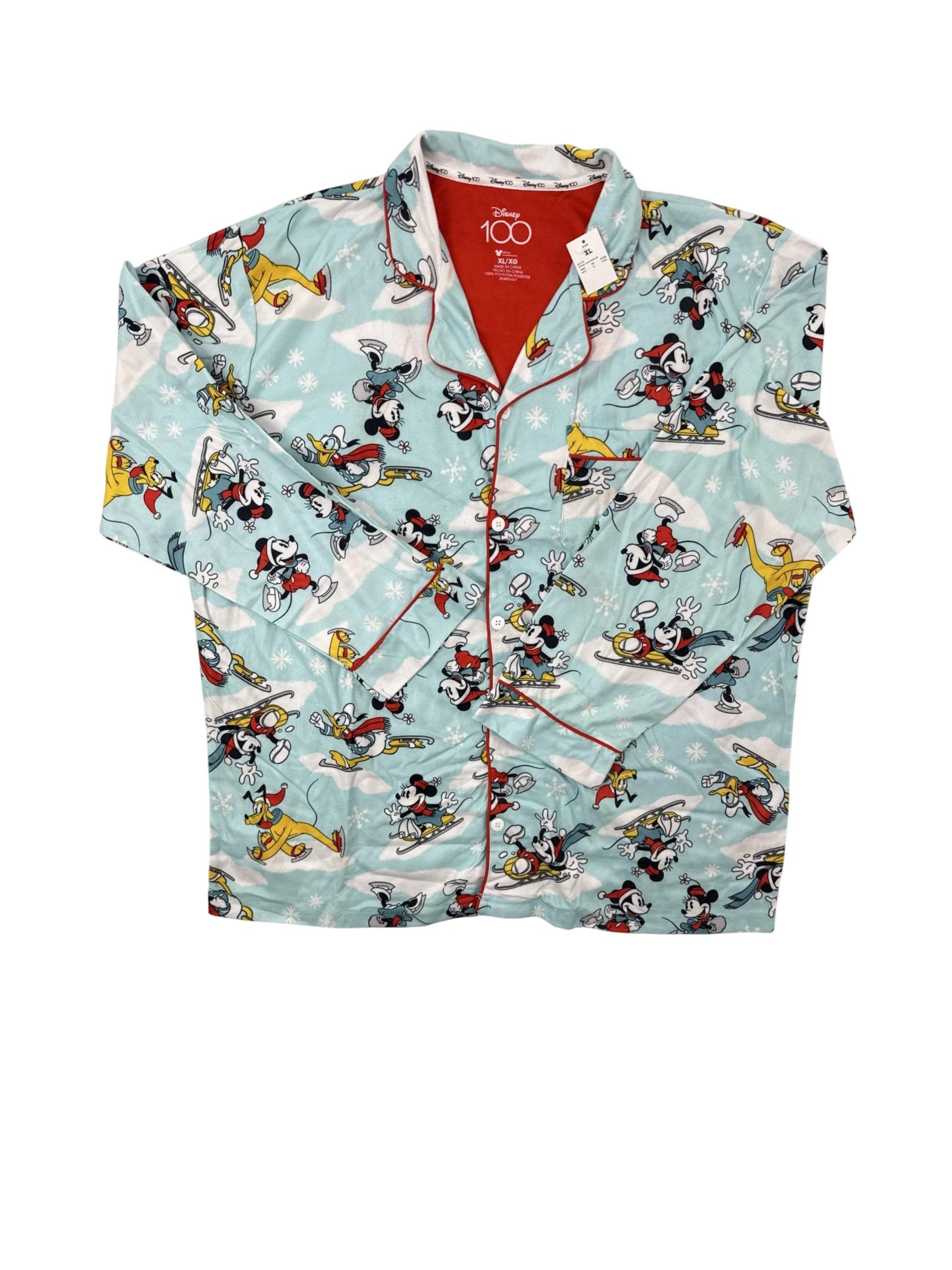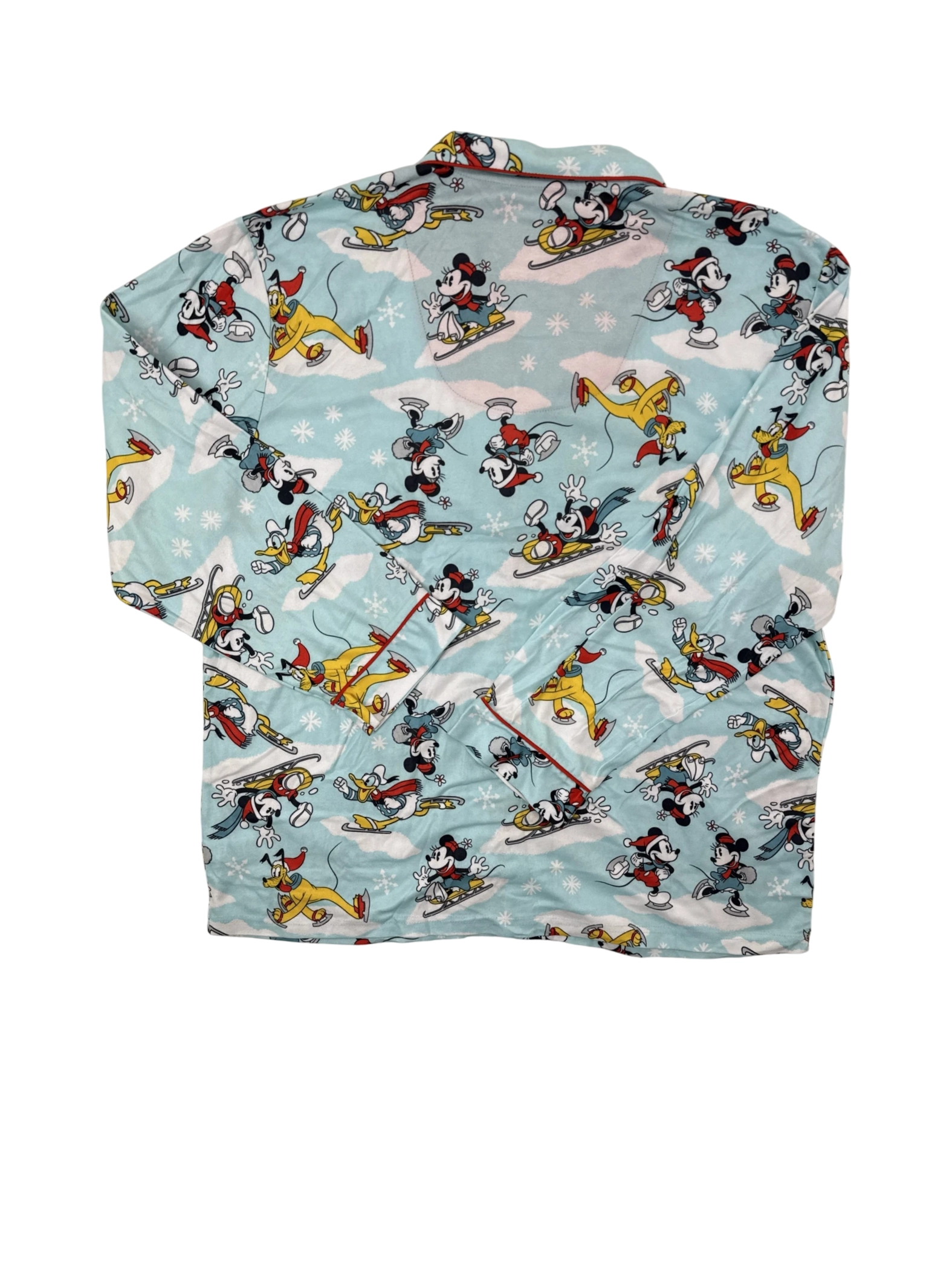 Cozy up in style with this pre-owned Disney 100th Anniversary pajama set for men! Featuring a fun print, this set includes a long-sleeved top and matching pajama pants. Made from comfortable polyester, these pajamas are perfect for chilly winter nights. The set features iconic Disney characters enjoying winter activities, making it a festive and fun addition to your sleepwear collection. Great for Disney fans and cozy nights in alike.