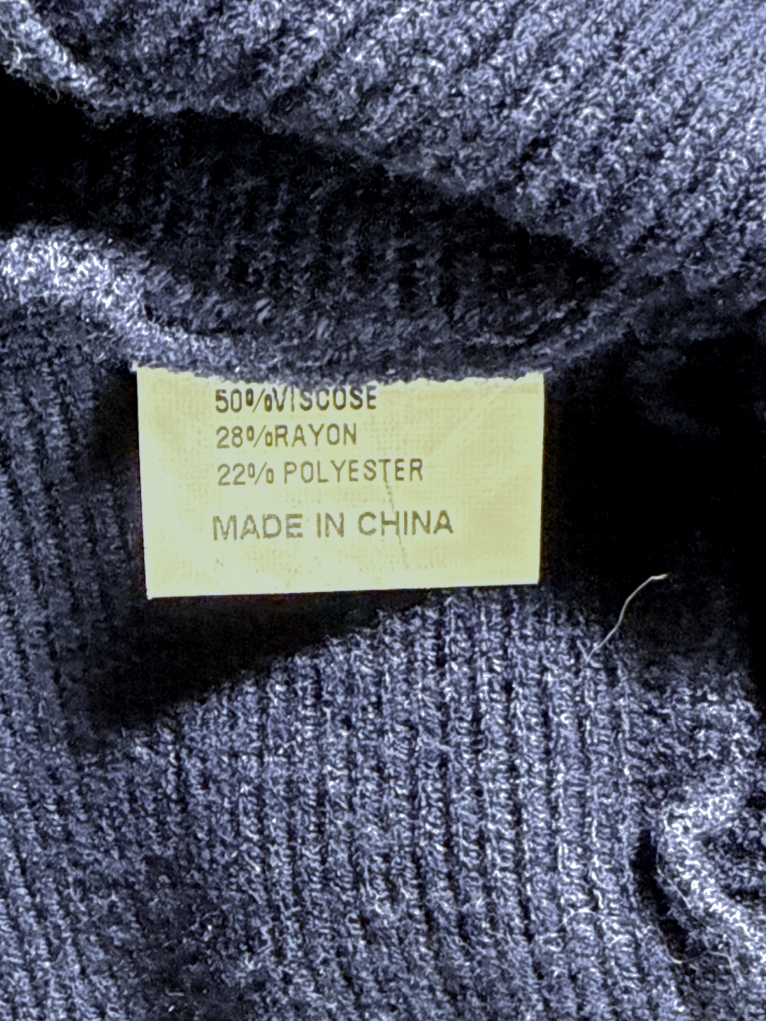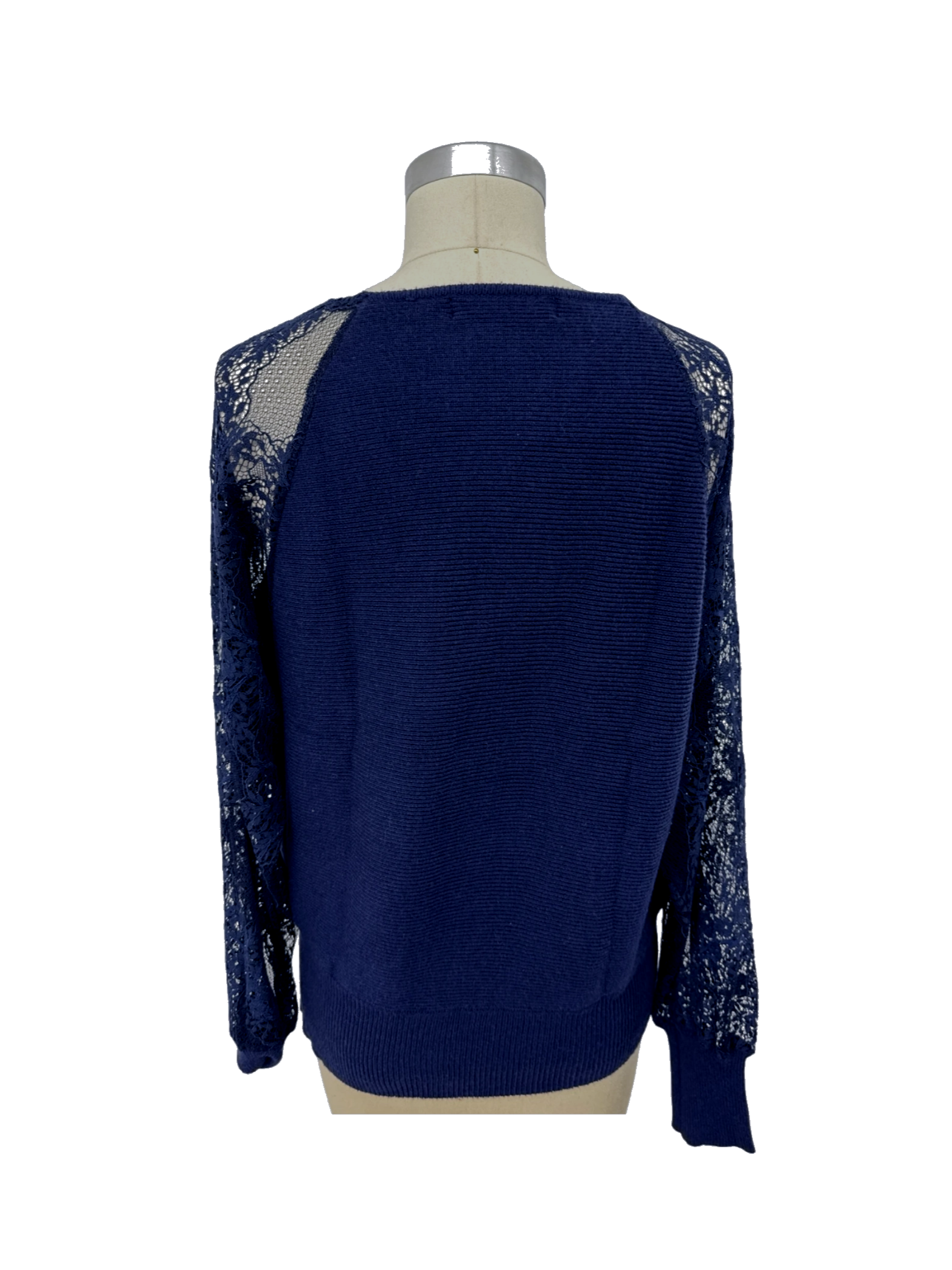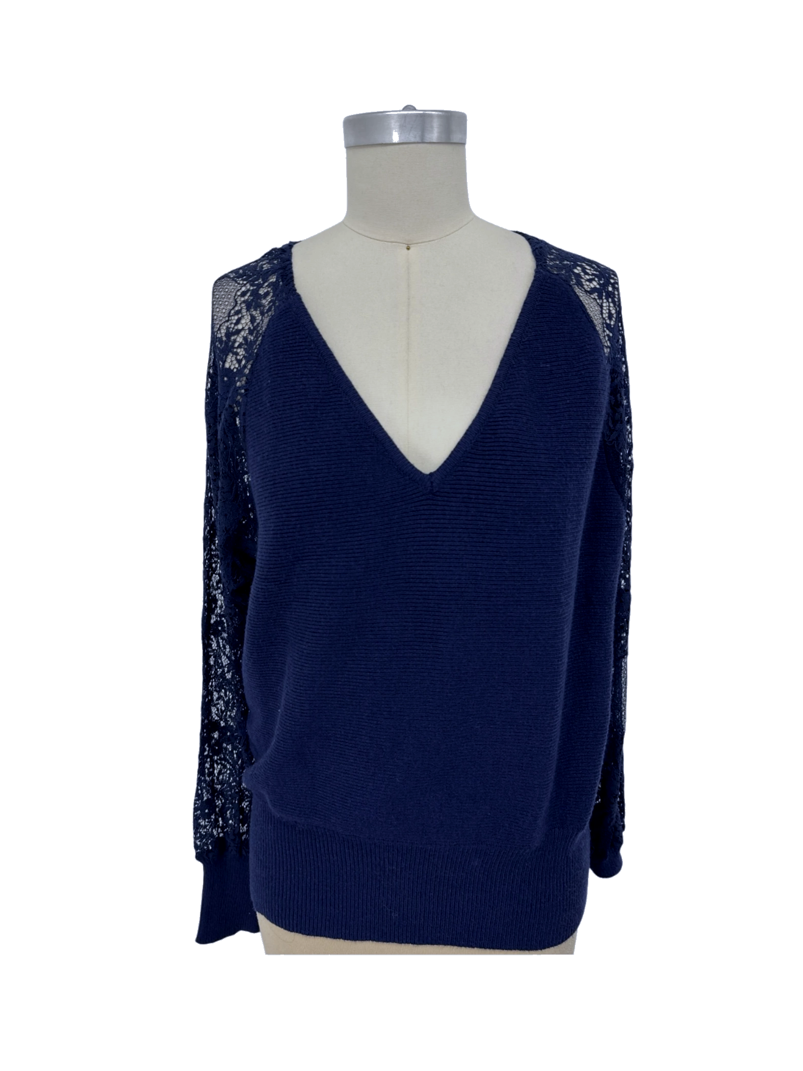 This pre-owned MEROKEETY sweater is a stylish and versatile addition to any wardrobe. Featuring a flattering V-neck and beautiful lace sleeves, this sweater is perfect for layering during the fall and winter seasons. The sweater's navy blue color makes it easy to pair with jeans, skirts, or trousers. Crafted with a blend of viscose, rayon, and polyester, offering both comfort and durability. A must-have piece for those who value comfort, style, and a touch of elegance.
