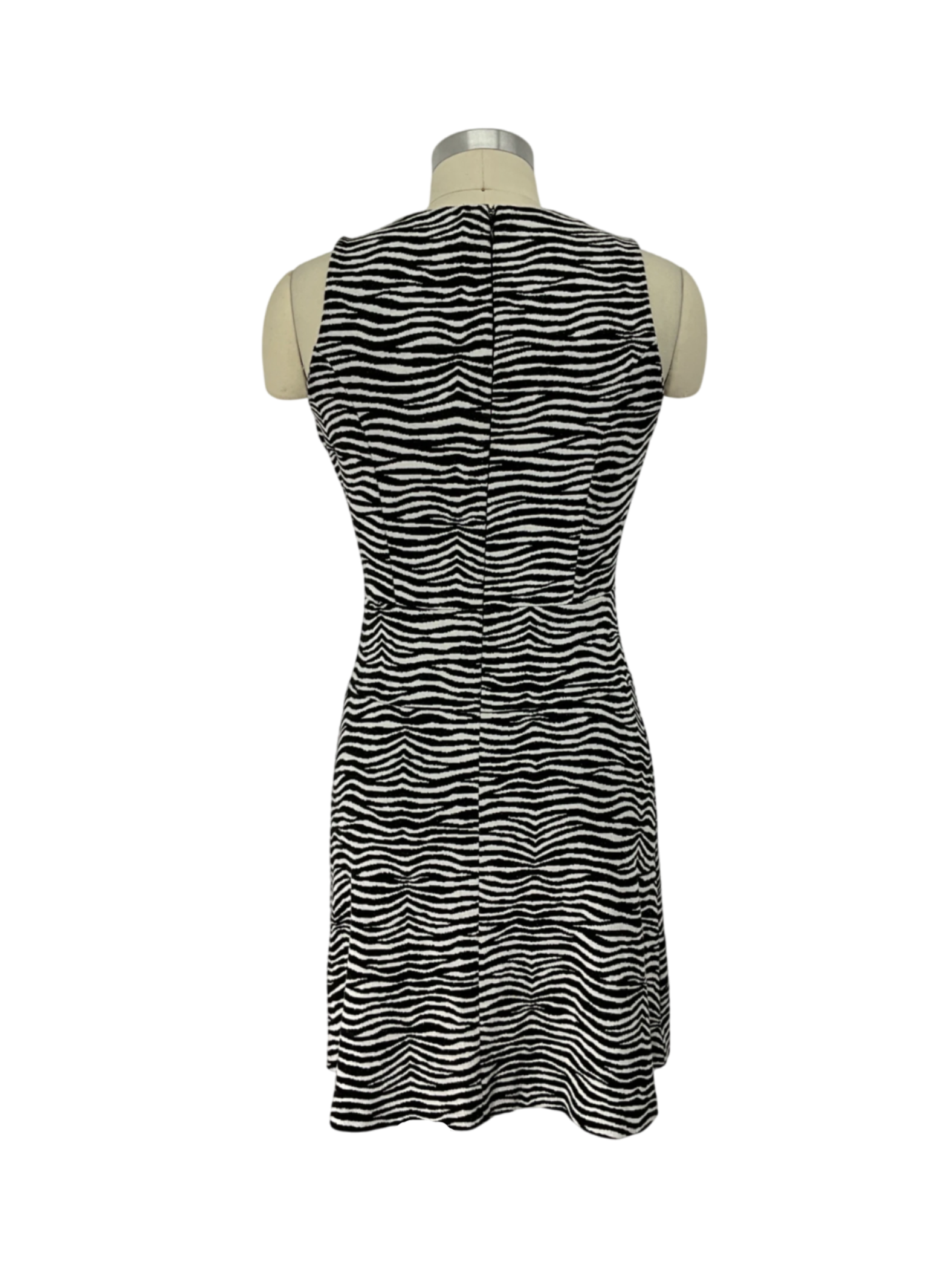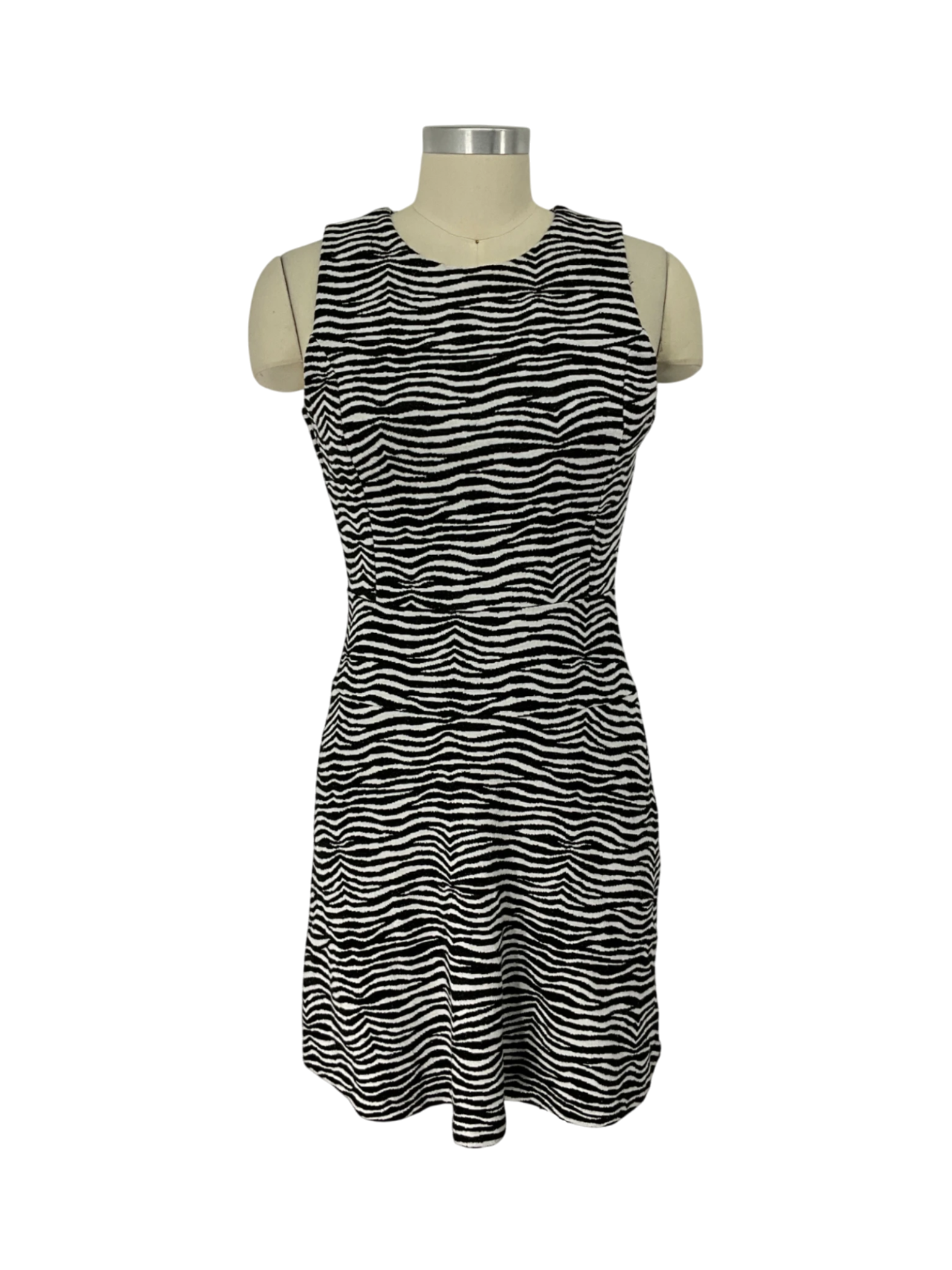 Women's sleeveless round neck dress in black and white animal print, size 4.
