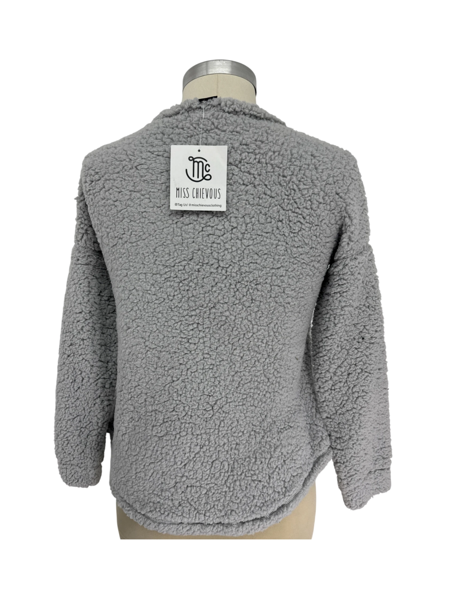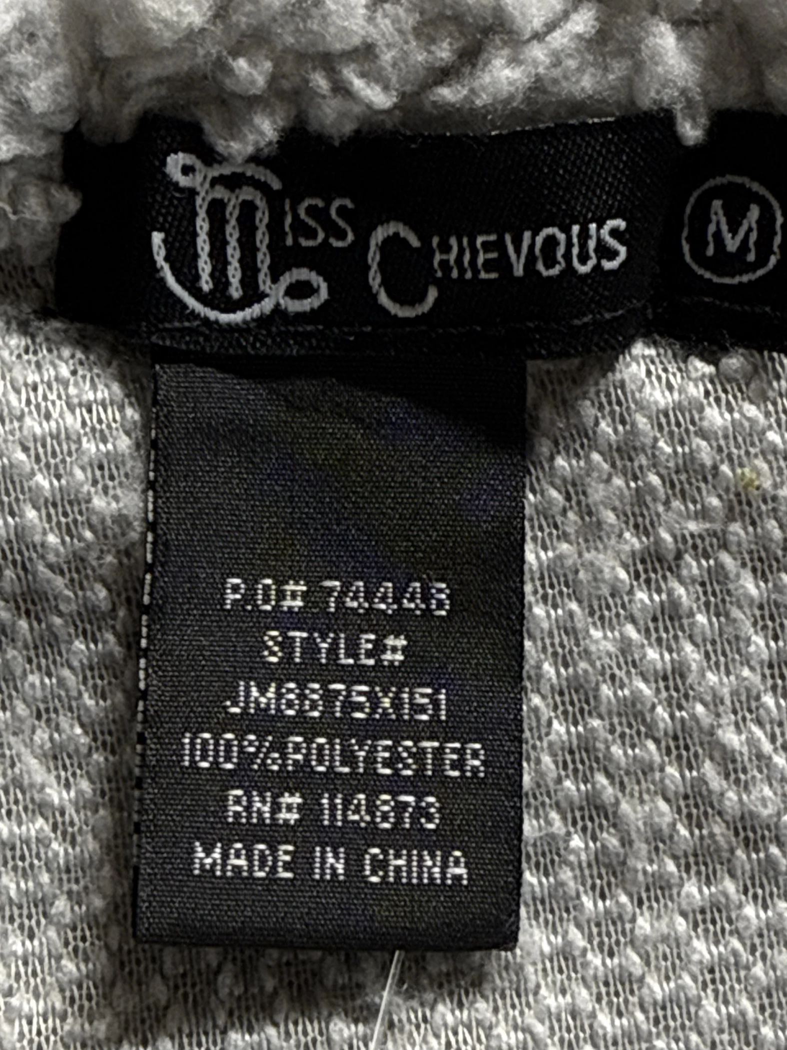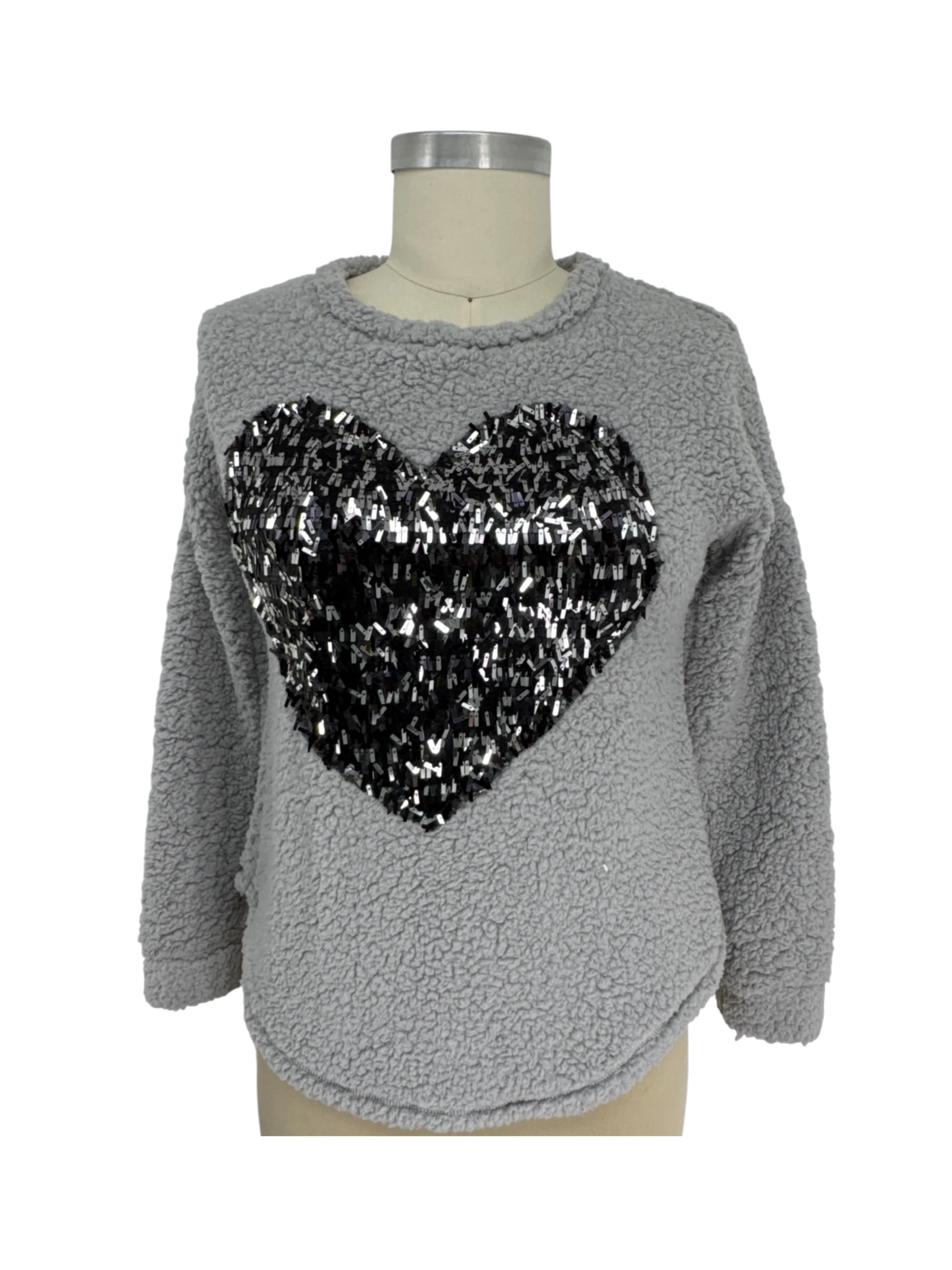 Cozy up in this gently used Miss Chievous sweater, perfect for the fall and winter seasons. This stylish sweater features a unique sequin heart design on a soft, gray teddy-bear fleece. Made from 100% polyester, it's designed for comfort and warmth. Ideal for adding a touch of personality to your casual outfits. This pre-loved sweater offers a fun and trendy look without breaking the bank.