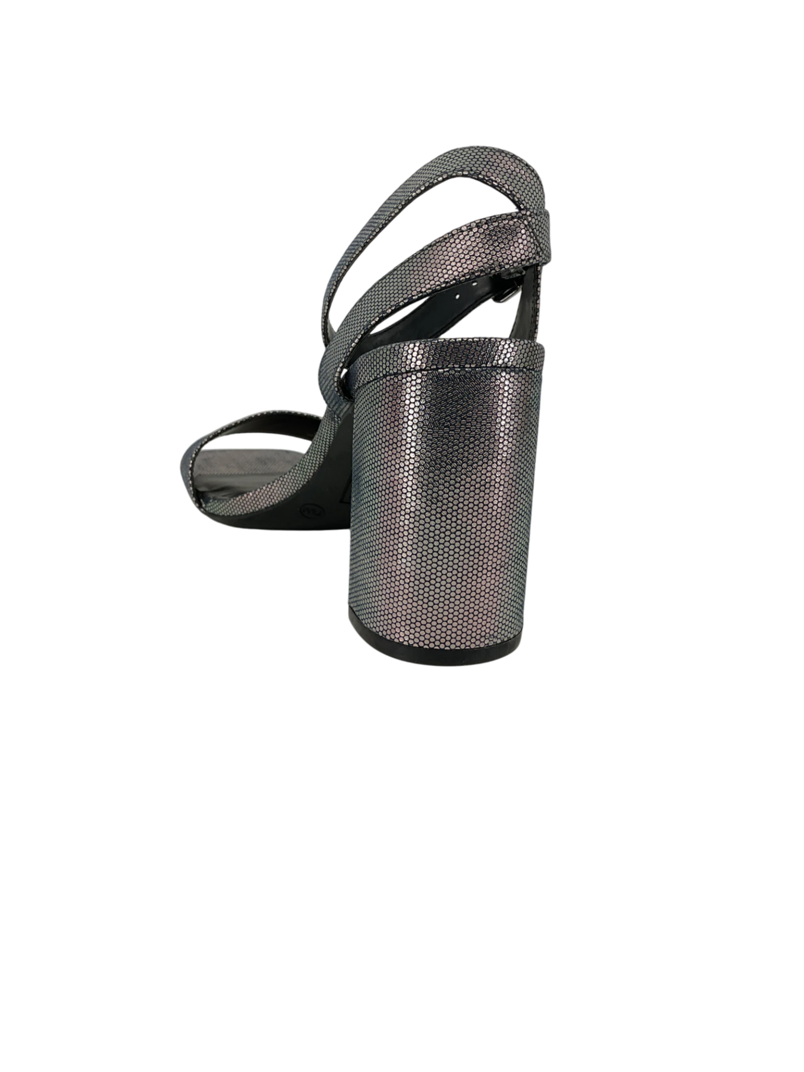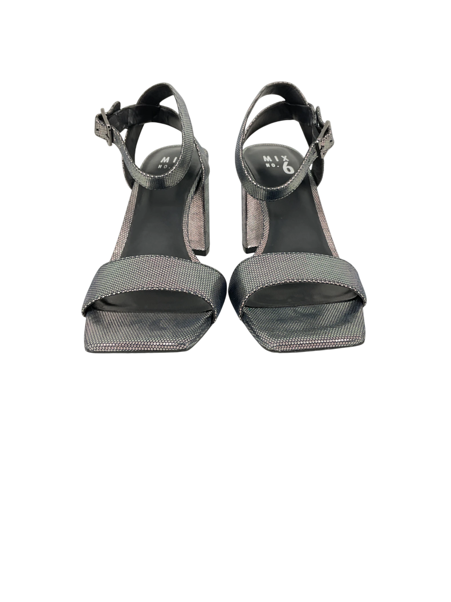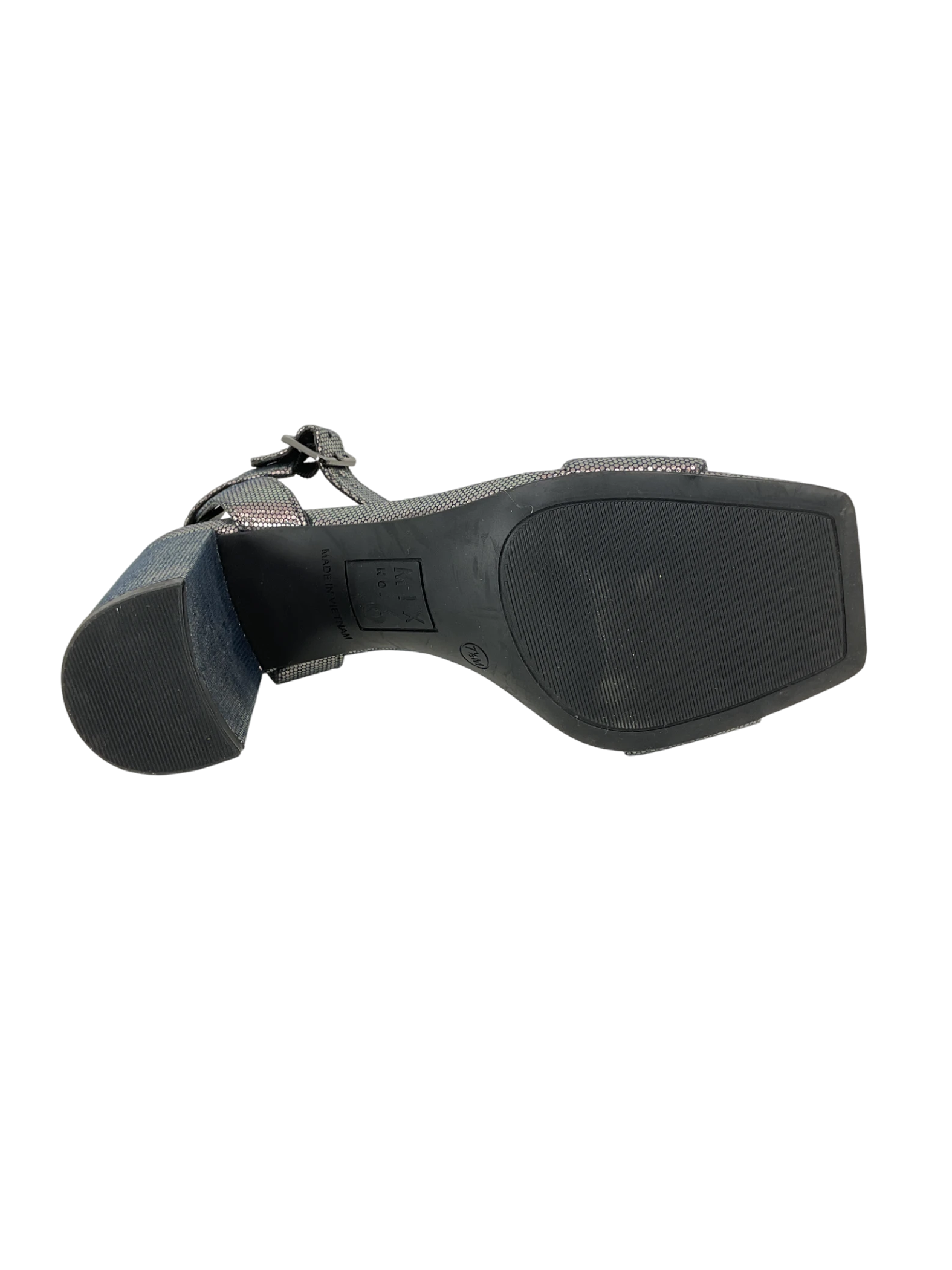 The shoe is a periwinkle blue chunky heel sandal with foil detailing, from the brand Mix No. 6. It has an ankle strap and is in women's size 7.5.