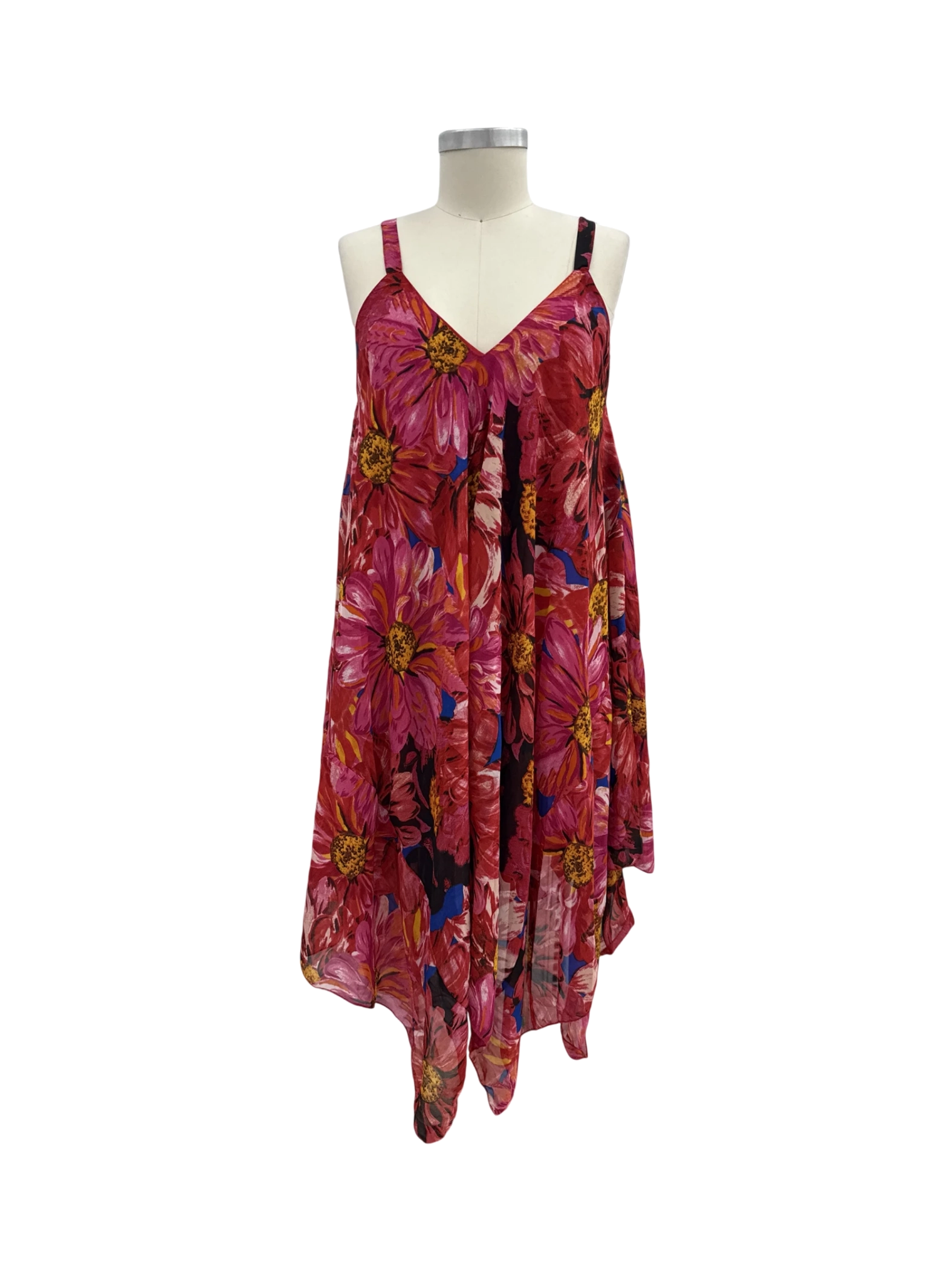Embrace summer with this pre-owned mlie gabrielle dress, a vibrant floral print A-line dress perfect for warm days. The flowy design and lightweight fabric offers comfort and style. Featuring a flattering V-neck, sleeveless cut, and a unique asymmetrical hem. This dress is a great addition to any wardrobe, easy to dress up or down.