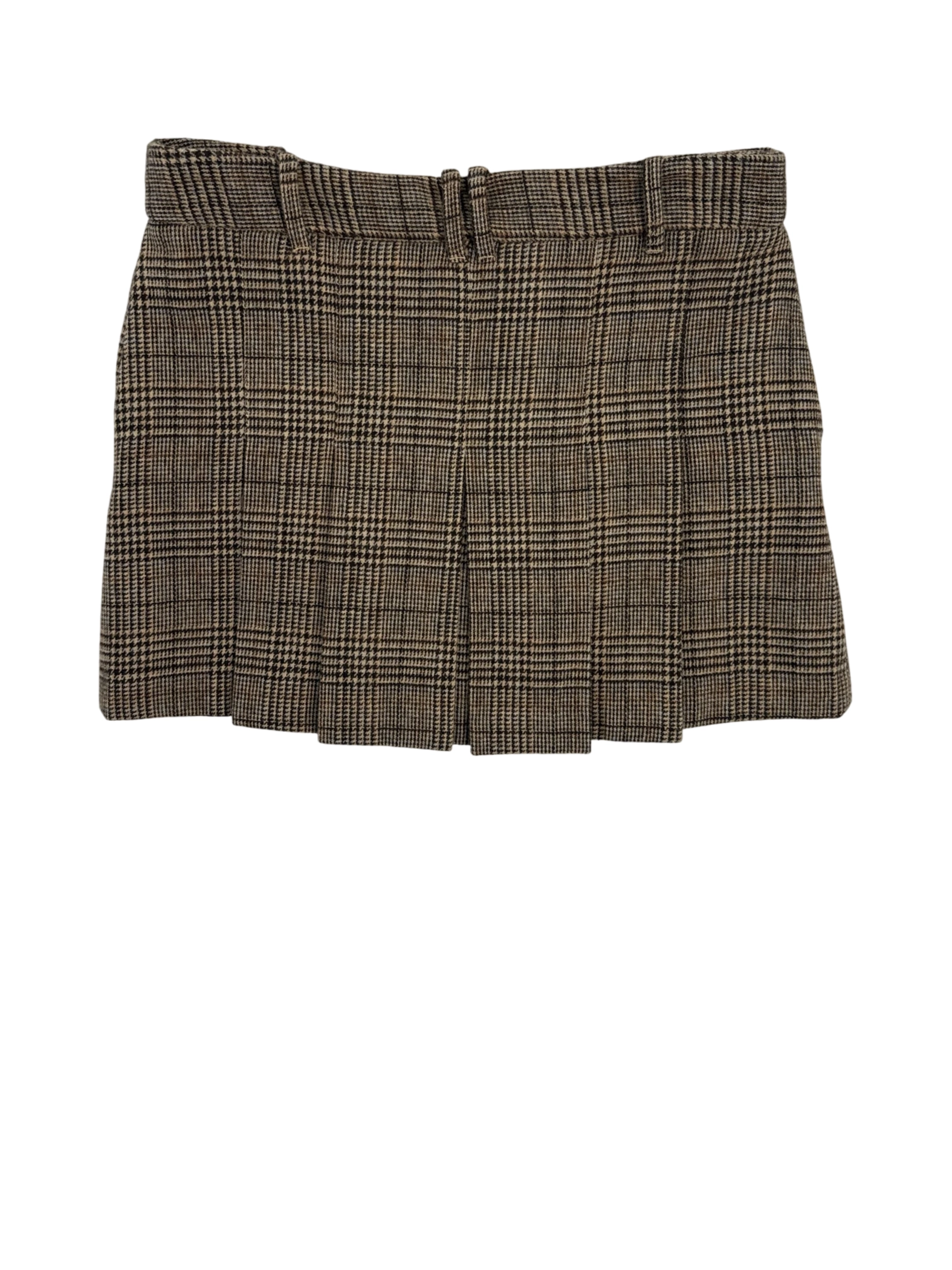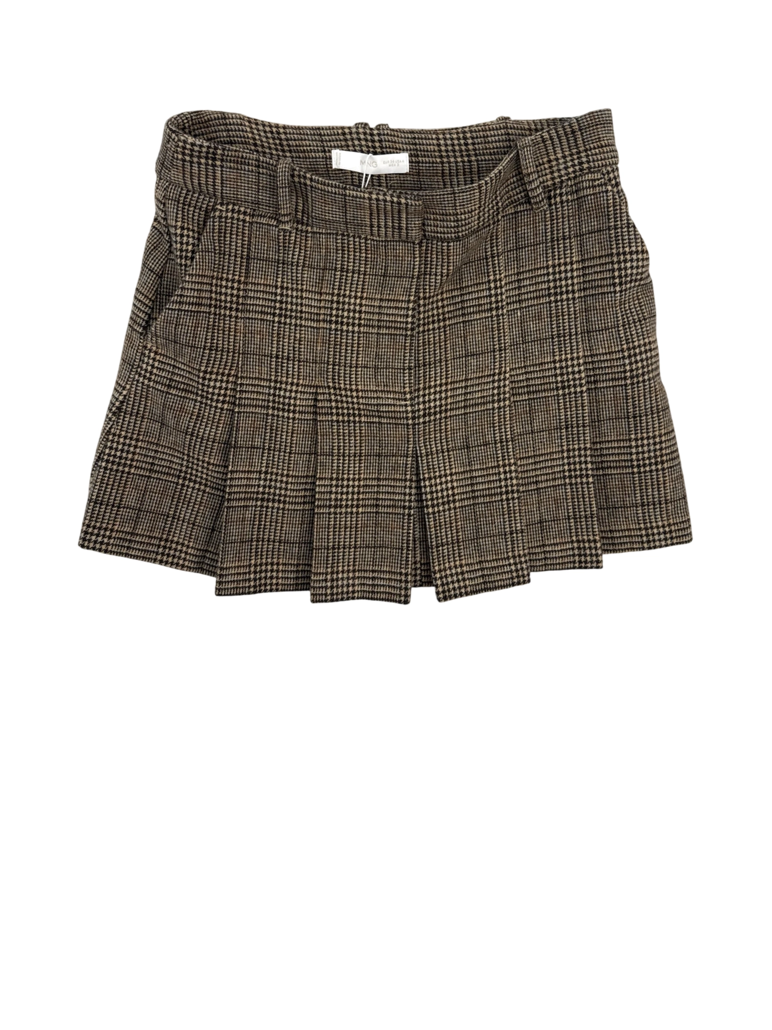 This pre-owned MNG skirt is a stylish addition to any wardrobe. Featuring a classic plaid pattern in shades of brown, it exudes sophistication. The pleated design and mini length create a flattering silhouette, perfect for the fall and winter seasons. Made from a blend of polyester and viscose, it offers both comfort and durability. A versatile piece that can be dressed up or down for various occasions.