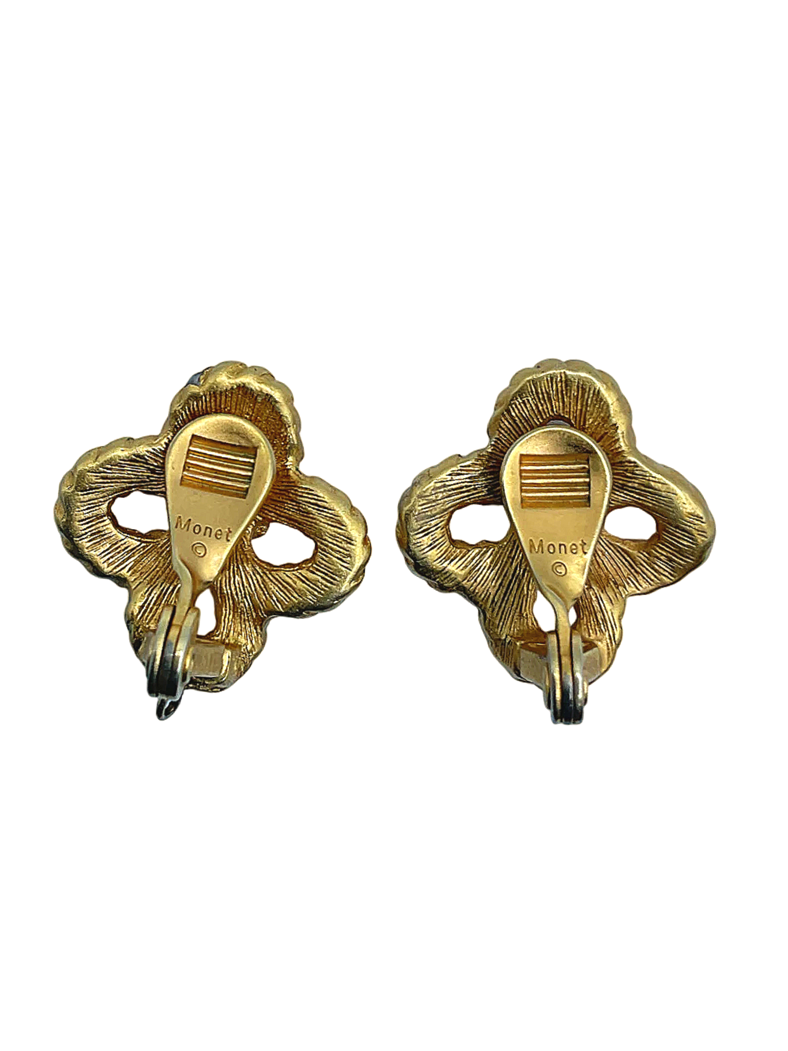 Vintage clip-on earrings made by Monet, designed in a quatrefoil shape with a textured gold-tone finish. They are labeled "Monet" on the clip. These earrings are a timeless and fashionable addition, ideal for enhancing the vintage appeal of any outfit.