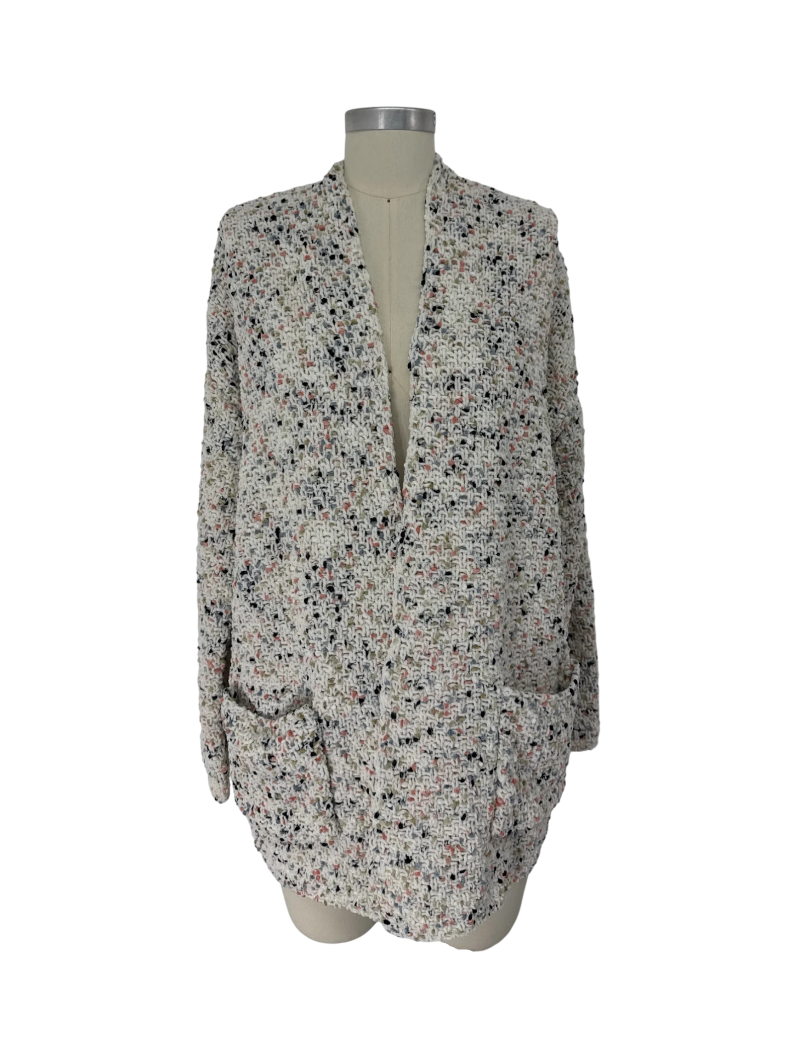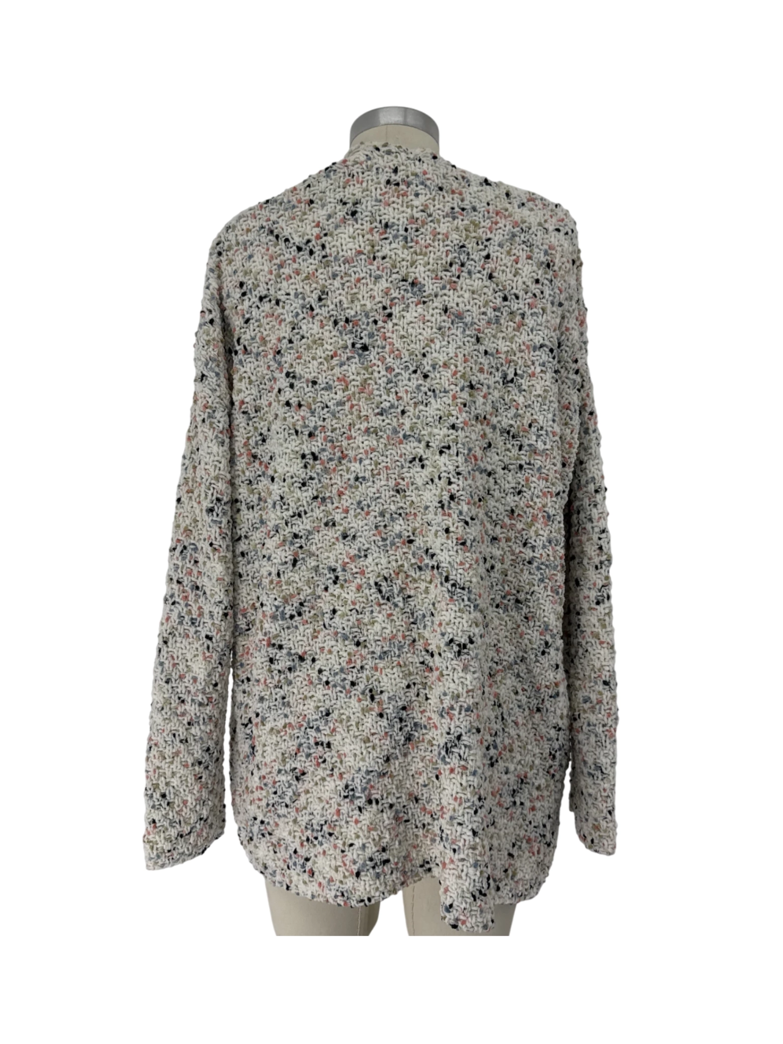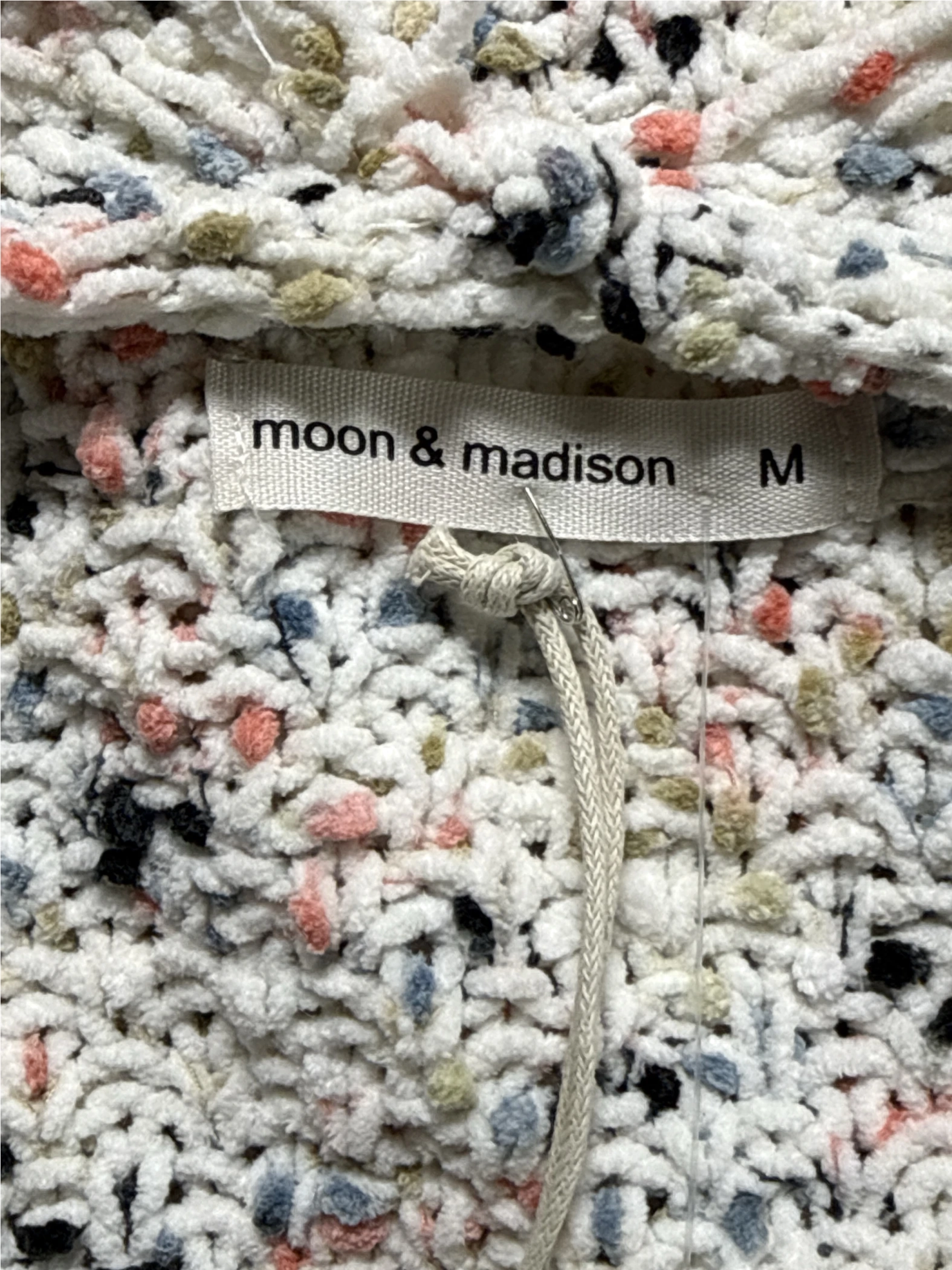 This moon & madison cardigan is a perfect blend of comfort and style. It features a unique multicolor pattern that adds a touch of flair to any outfit. Made from soft polyester, this cardigan is ideal for fall and winter seasons. The open closure design allows for easy layering, making it a versatile addition to your wardrobe. With its stylish V-neck and a medium size, it offers a flattering fit. This pre-owned cardigan is a great find for those seeking a chic and cozy piece.