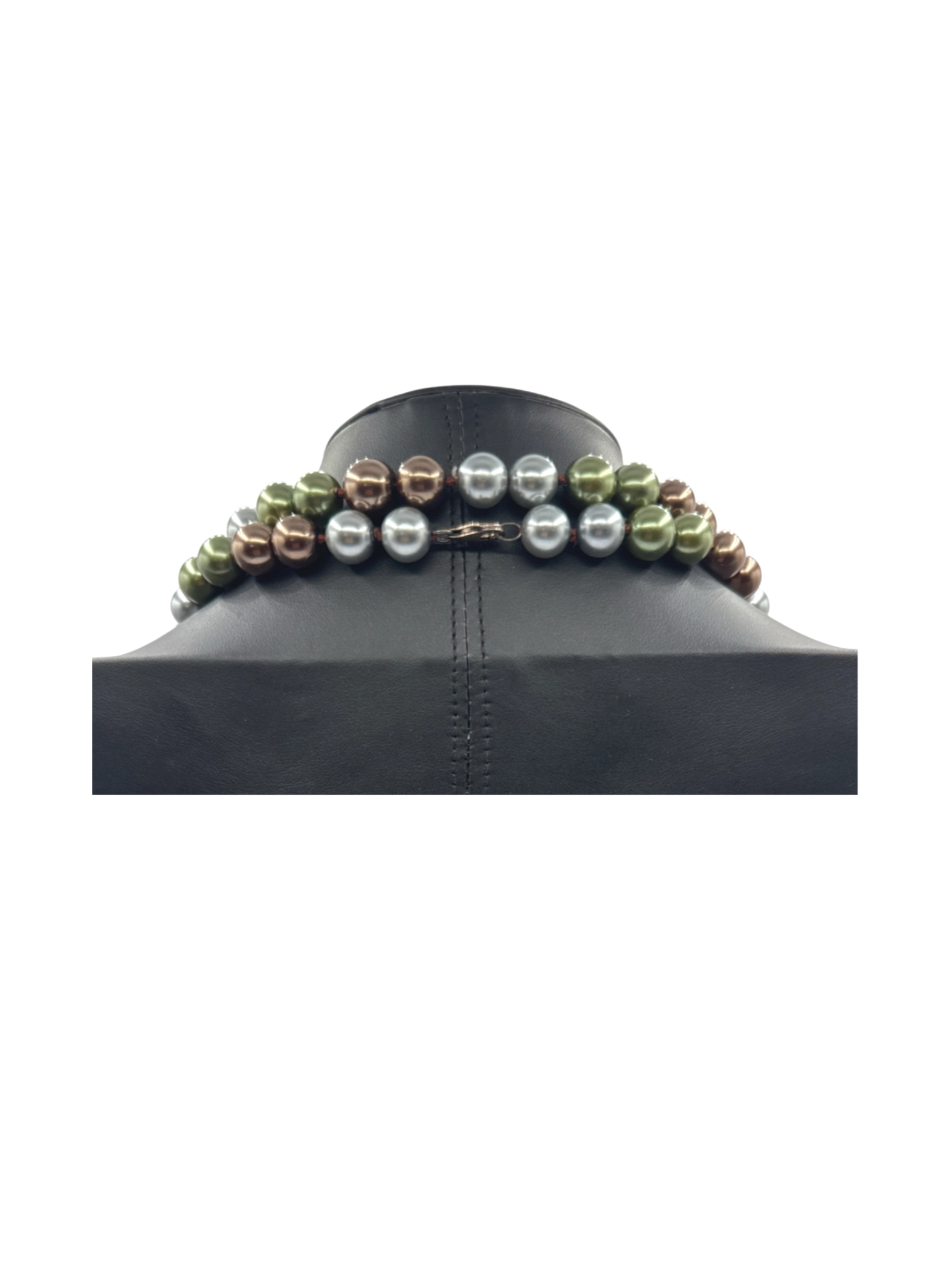 This stunning pre-owned necklace is a statement piece, featuring a layered design of shimmering faux pearls in shades of bronze, green, and silver. The opera-length chain adds elegance, making it ideal for various occasions. This necklace effortlessly elevates any outfit, providing a touch of vintage charm. It's a versatile accessory that adds a unique flair to your jewelry collection. Perfect for those who appreciate timeless beauty with a touch of modern style.