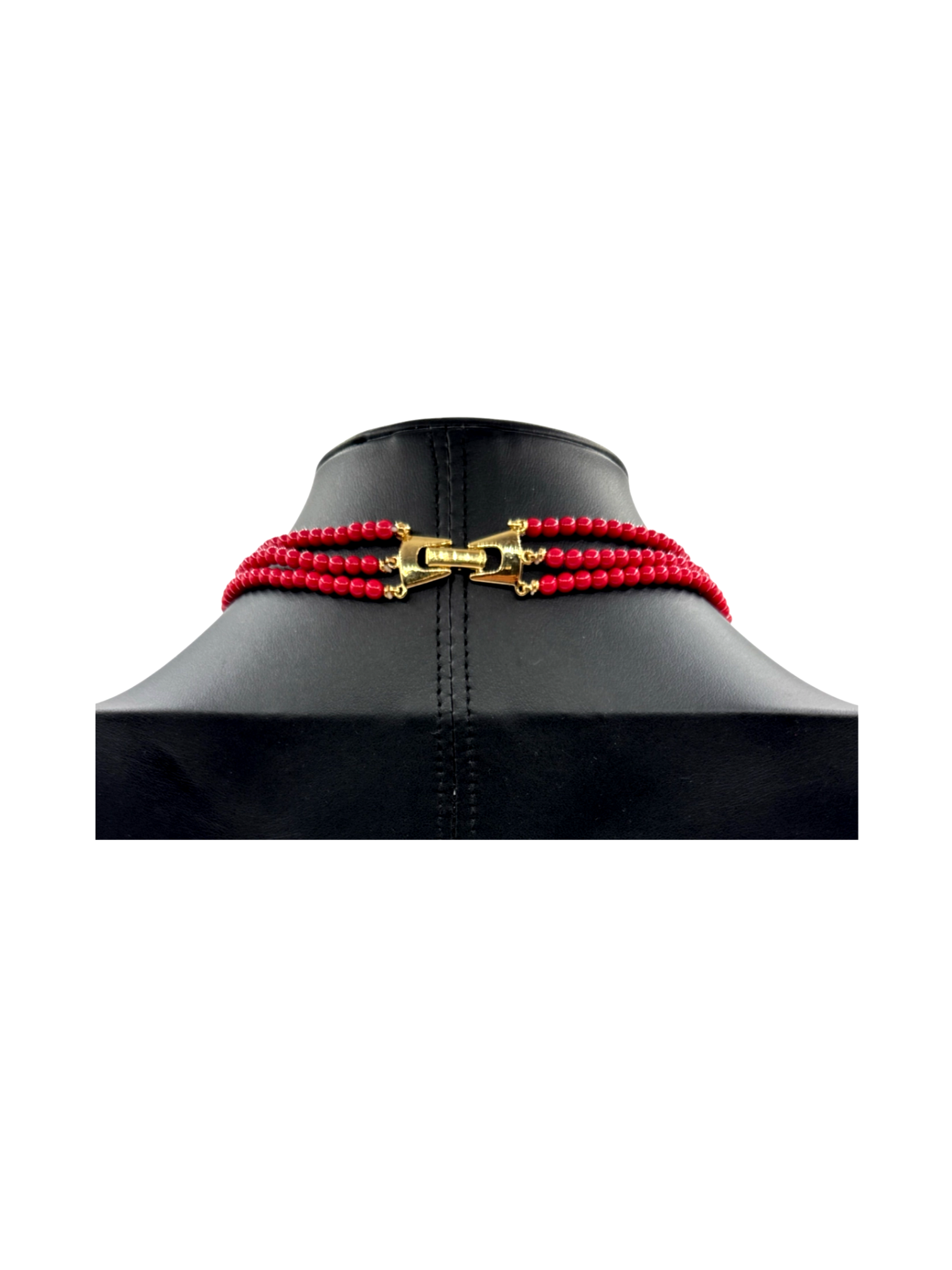 This stunning pre-owned necklace is a vibrant statement piece, perfect for adding a pop of color to any outfit. The necklace features a multi-strand design with red beads, complemented by gold accents and faux pearl beads, and ornate beads, creating a rich, layered look. Its a versatile accessory suitable for both casual and formal occasions. Make a fashion statement with this charming necklace.
