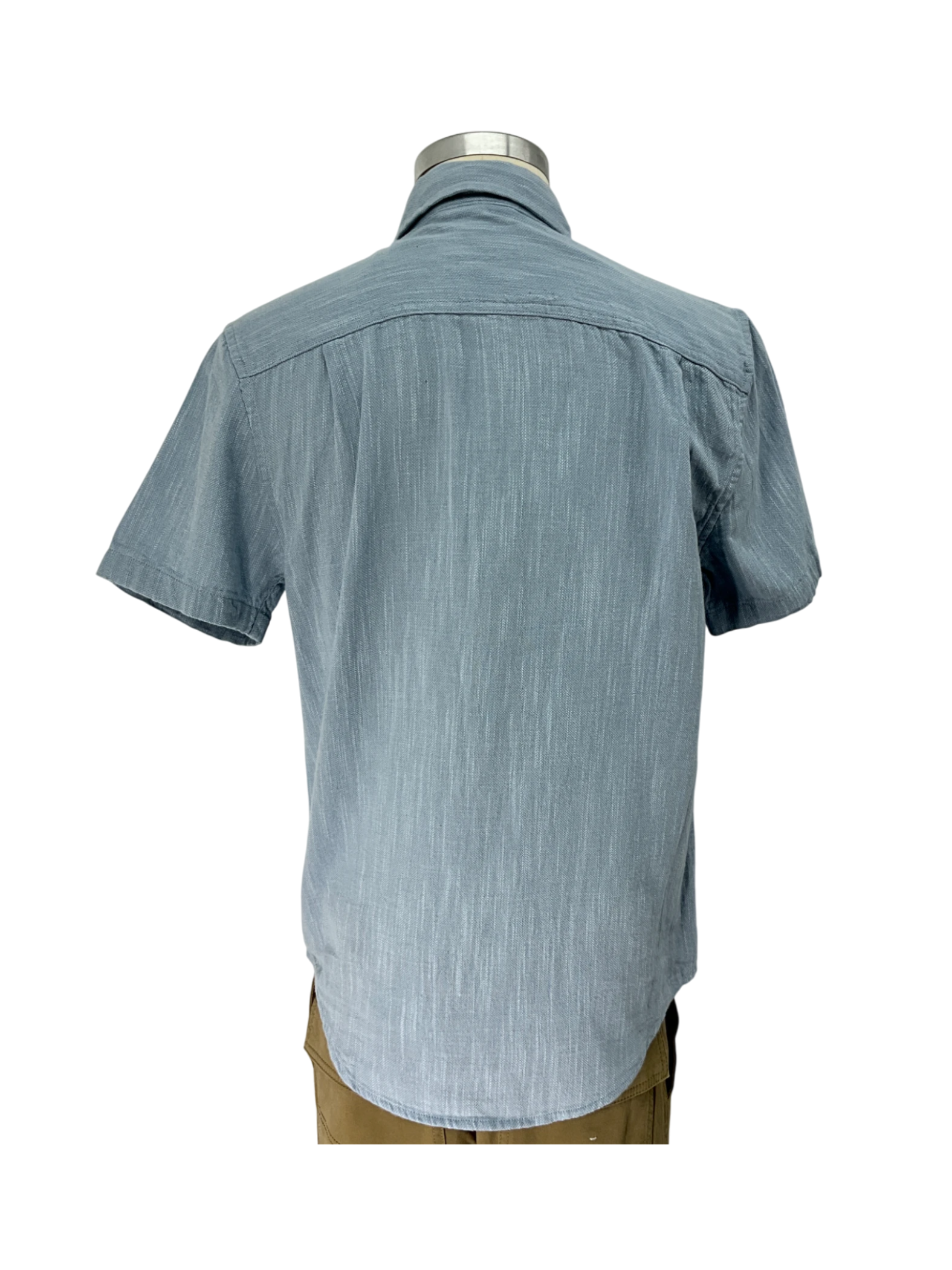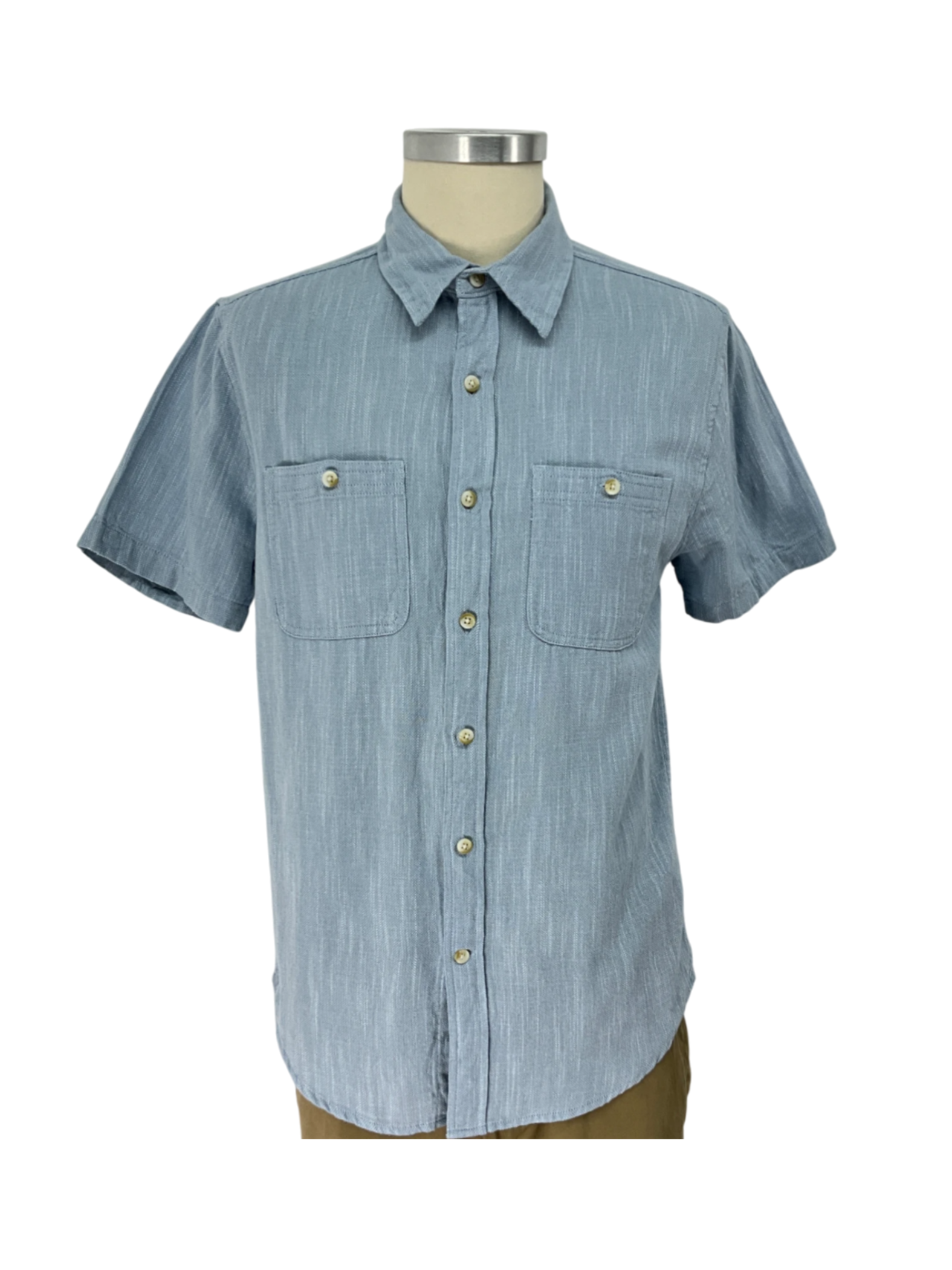 Men's Mutual Weave light blue button-down front, two chest pockets with button closures, and short sleeves.