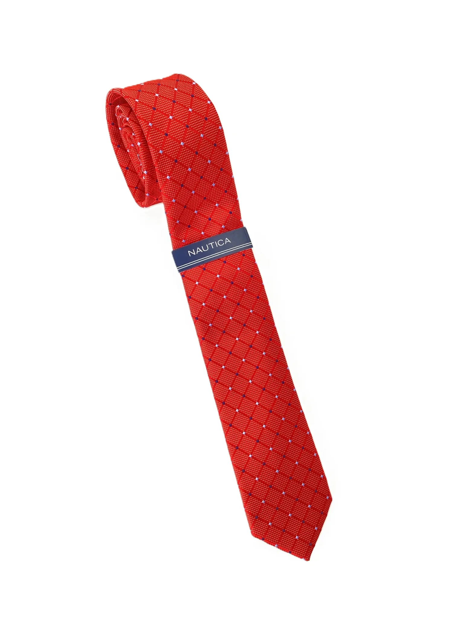 This is a Nautica Red Diamond Print Tie. It is narrow, measuring 3 inches wide and 57.5 inches long.