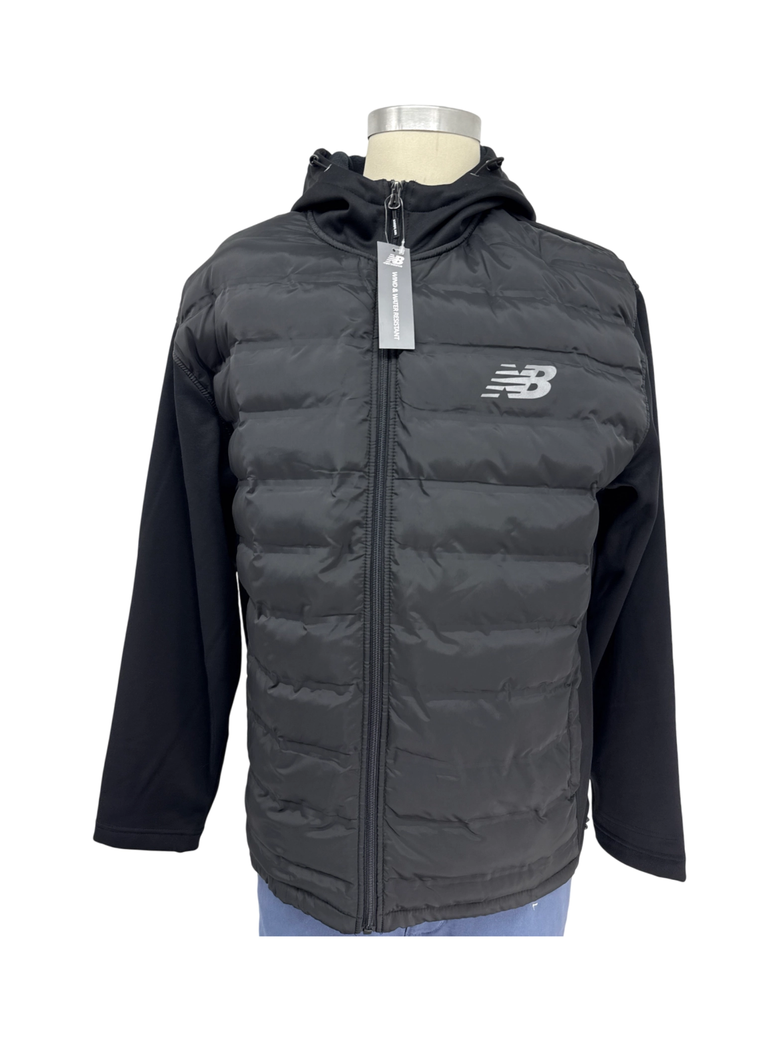 This pre-owned New Balance men's jacket is a versatile outerwear piece perfect for colder weather. Featuring a sleek black design, this jacket combines a puffer vest front with a hoodie back and sleeves for added warmth and style. Constructed with 100% polyester, it offers durability and easy care. Ideal for layering, this jacket transitions seamlessly from casual outings to active pursuits. It's a practical and stylish choice for those seeking comfort and performance in their wardrobe.