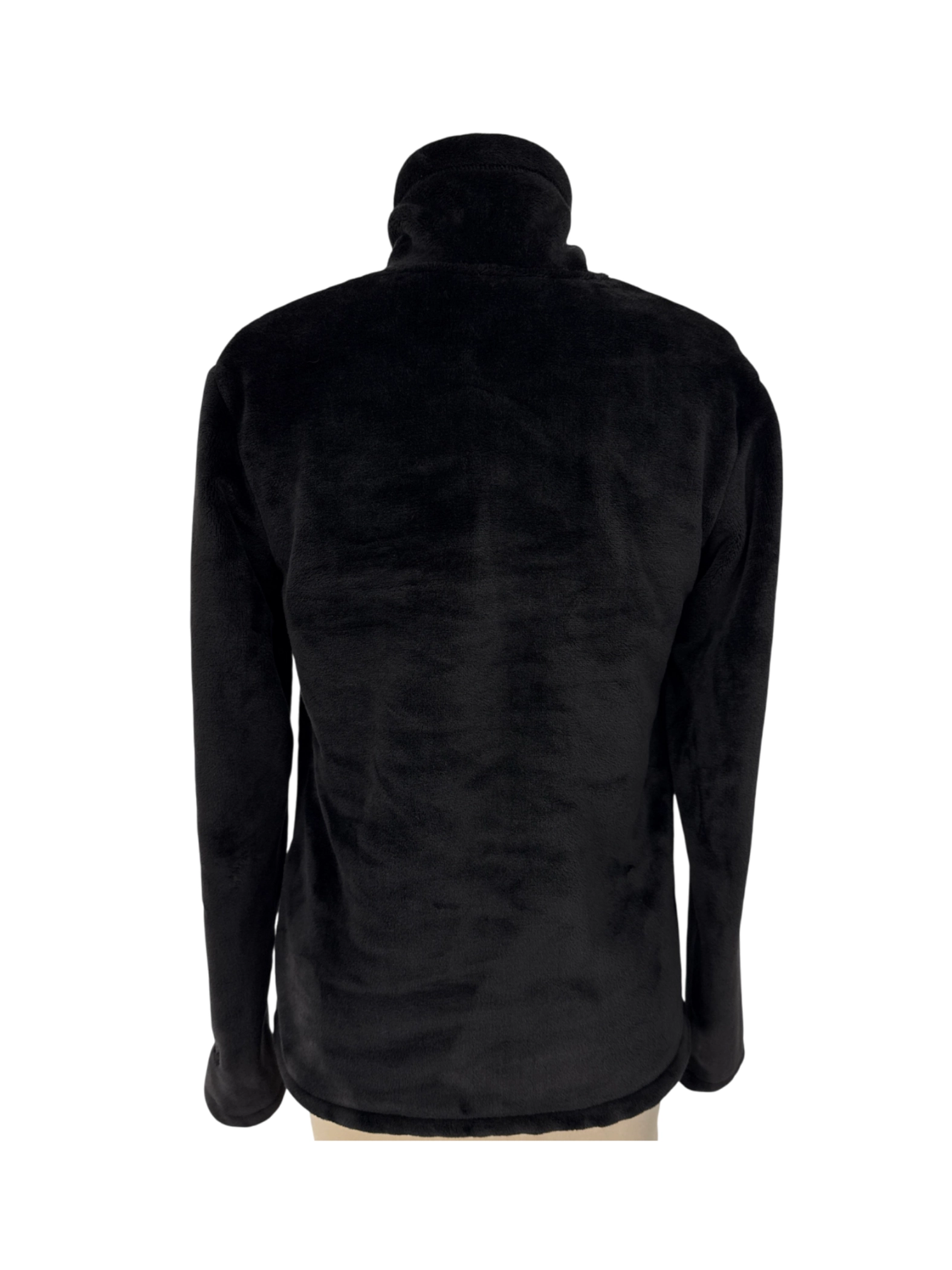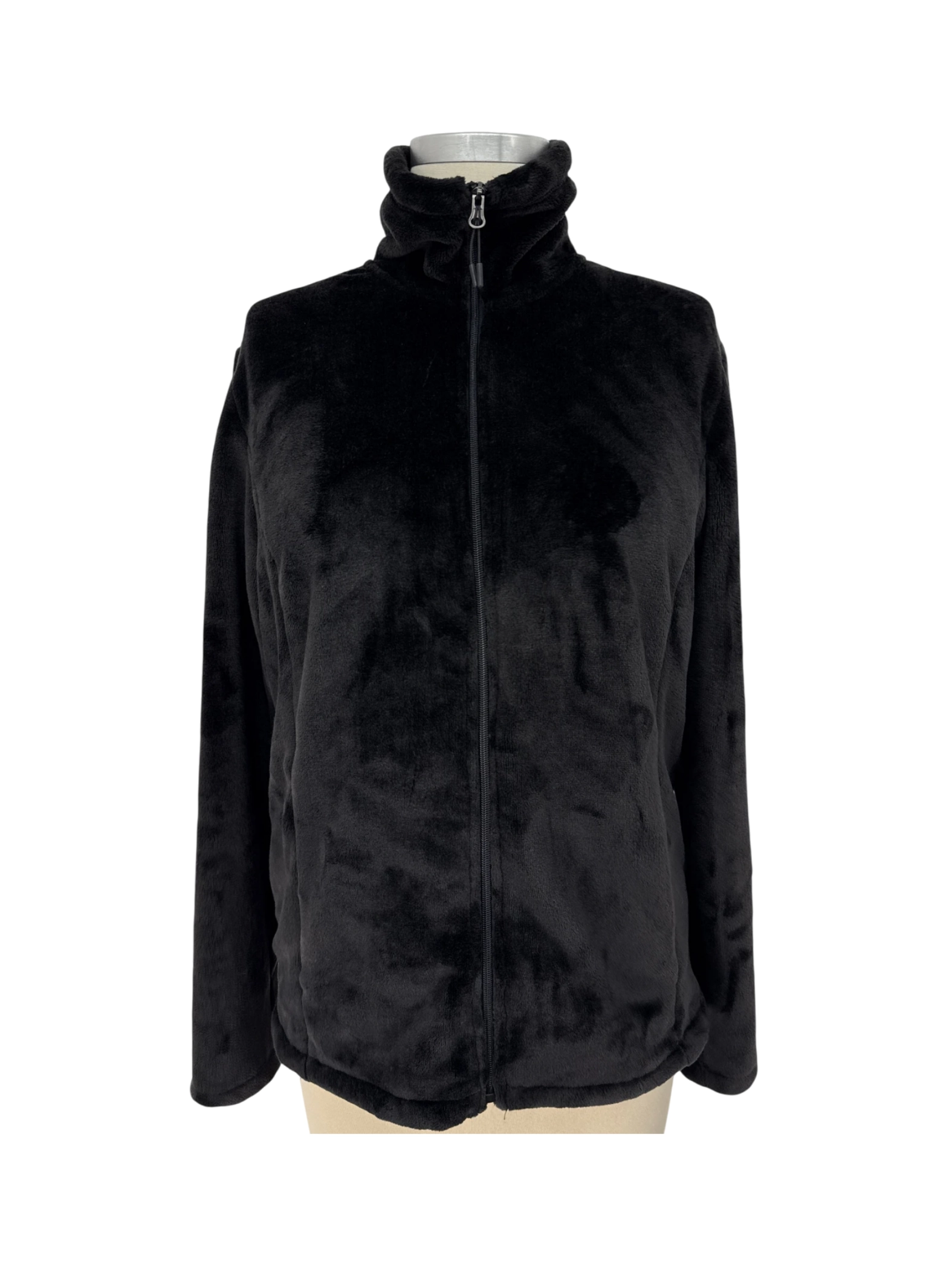 Stay warm and cozy in this pre-owned New Balance black jacket. Crafted from 100% polyester, this jacket features a full zip closure and a soft, plush texture for ultimate comfort. Its versatile design makes it perfect for layering during cooler months. This jacket is a stylish and practical addition to any wardrobe. This jacket is perfect for casual outings or active wear.