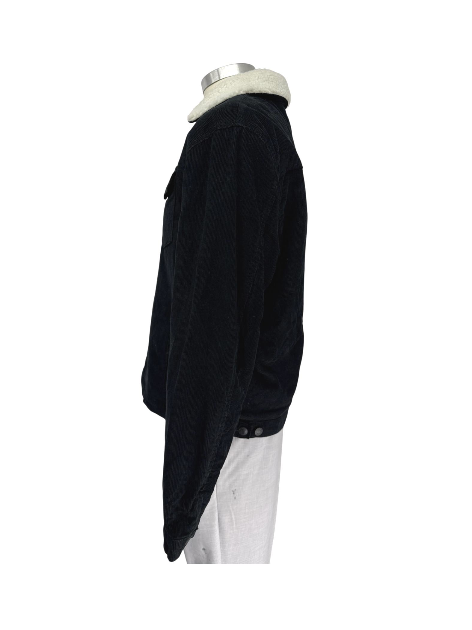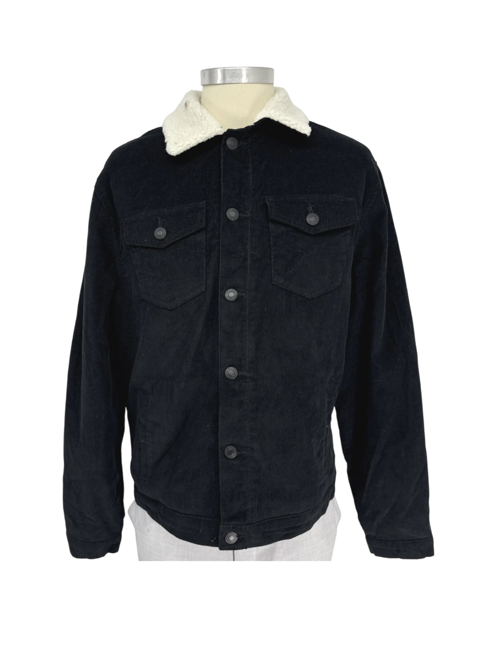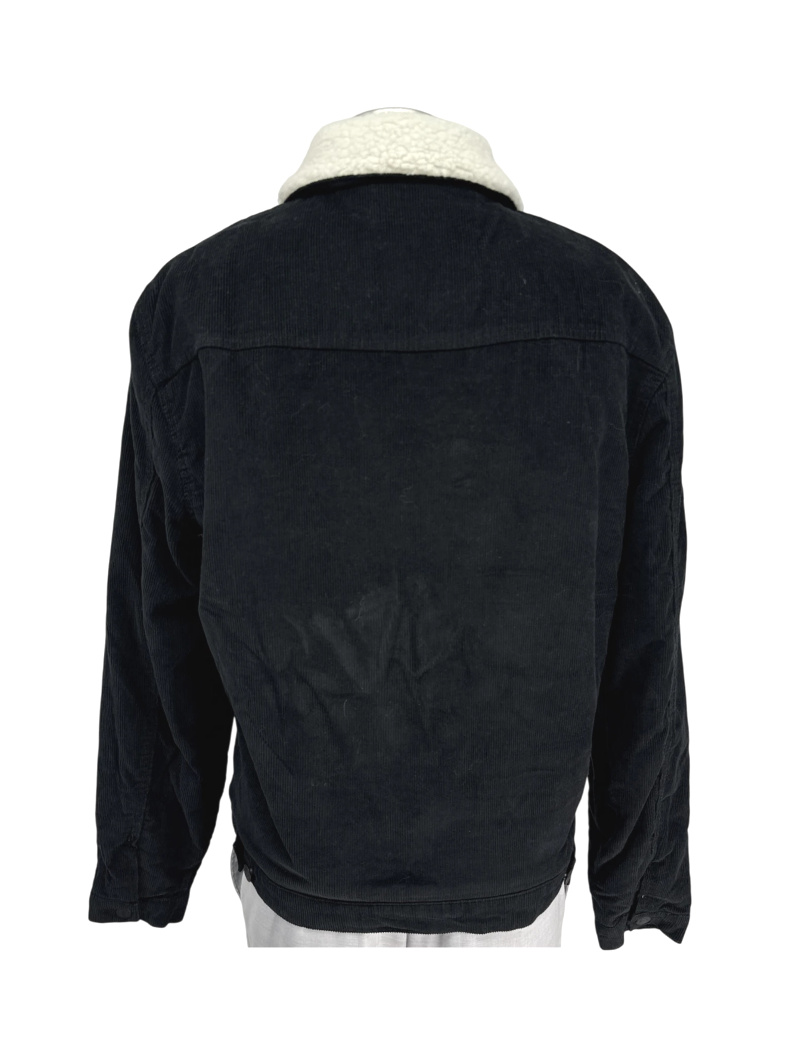 This pre-owned New Look men's jacket is a stylish and warm addition to any wardrobe. It features a classic design with a corduroy exterior in a sleek black color, perfect for a versatile look. The jacket includes a cozy faux shearling collar and lining, making it ideal for colder seasons. It has a button-down closure and pockets for practicality. This jacket is a fashionable and functional piece that combines comfort and style, offering a timeless look at a great value.