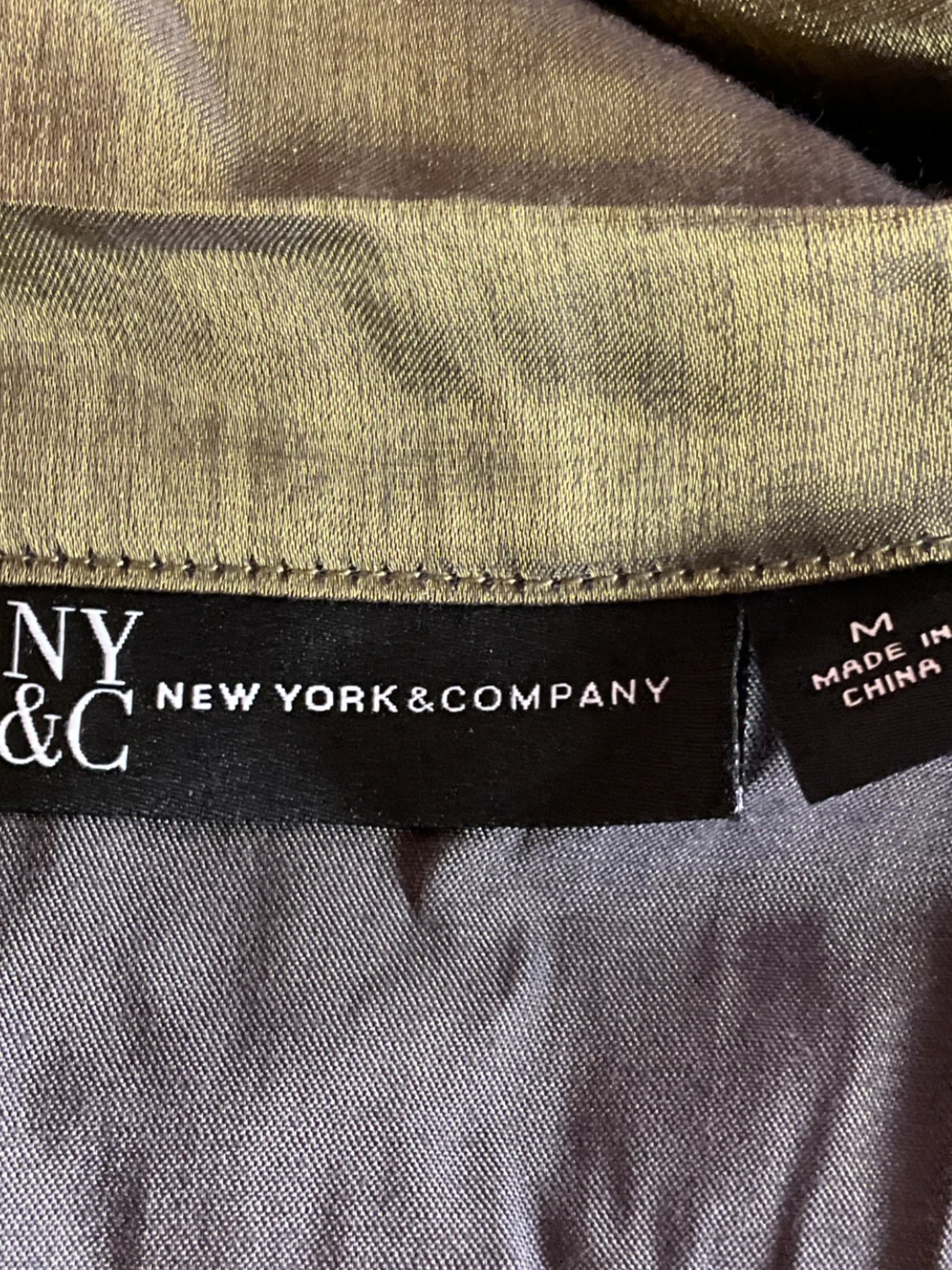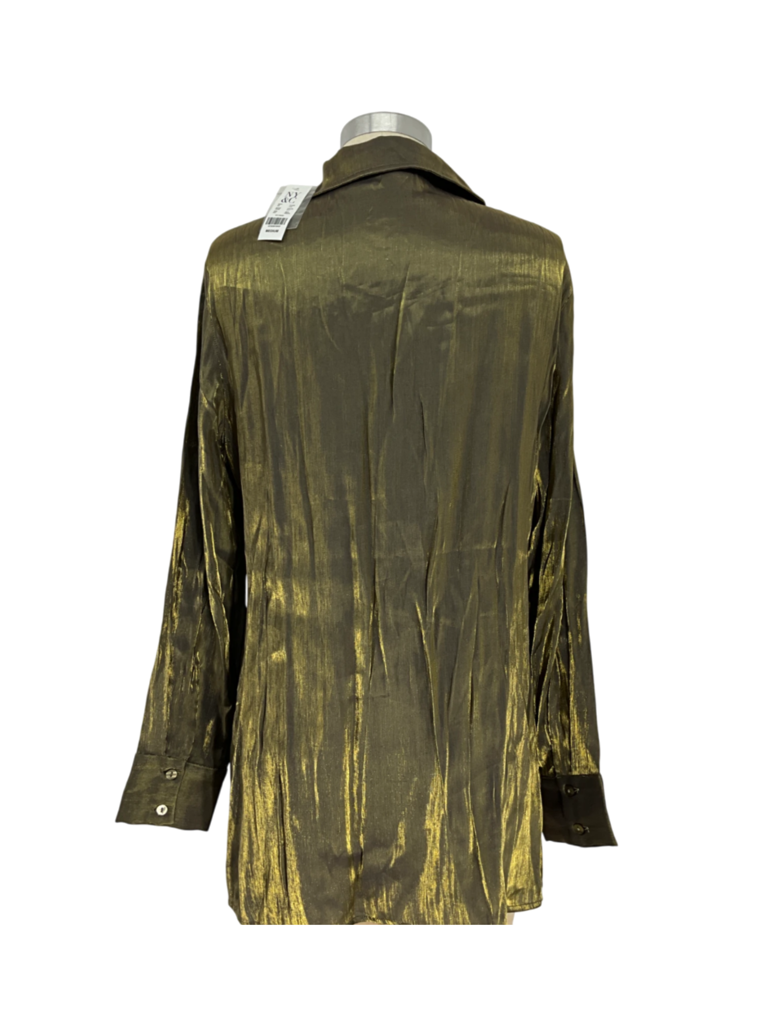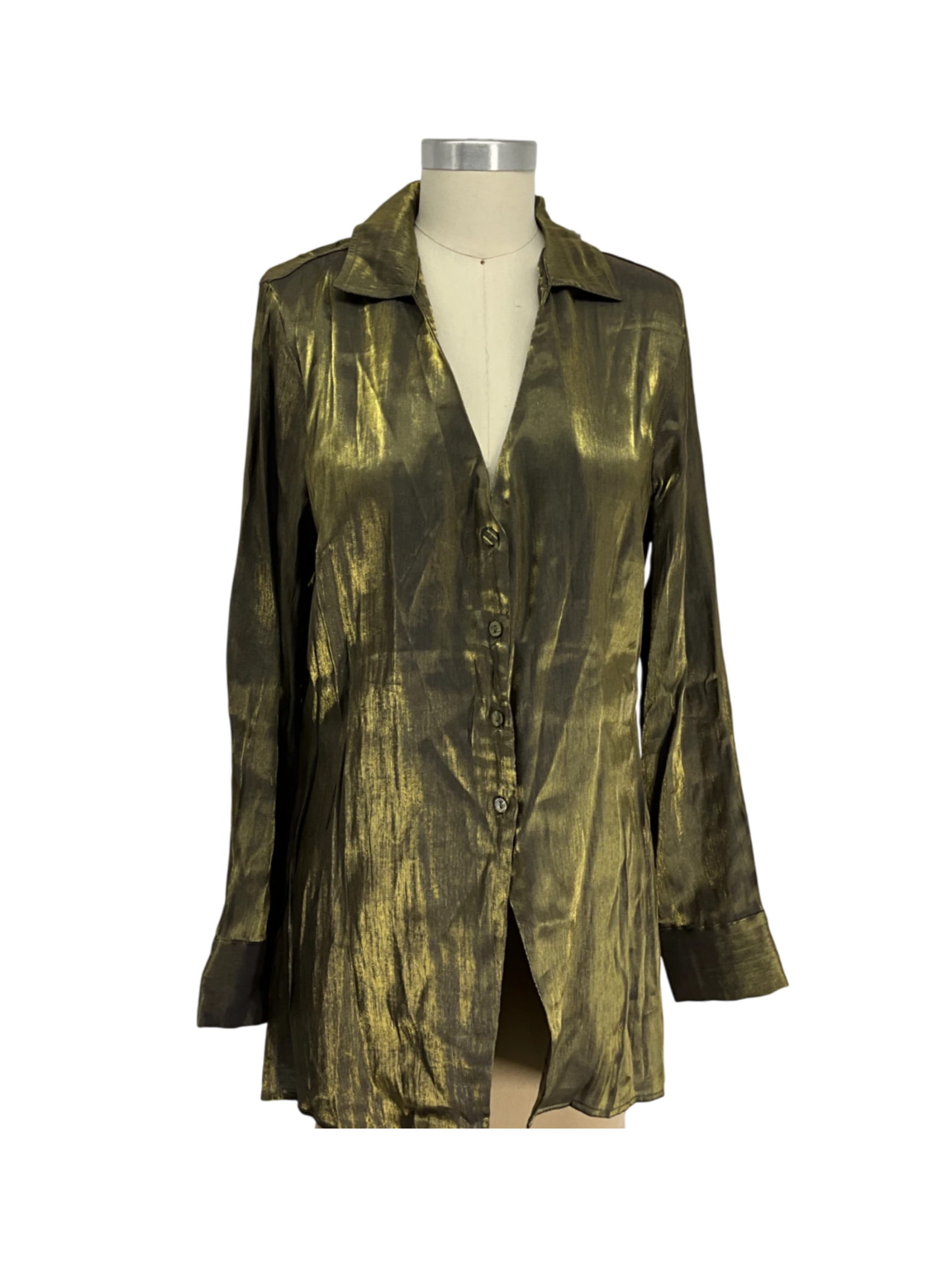 This elegant button-down blouse from New York & Company has a striking shimmering gold fabric that catches the light beautifully. It has a classic collar, long sleeves, and a flattering silhouette, making it perfect for dressing up or down.
