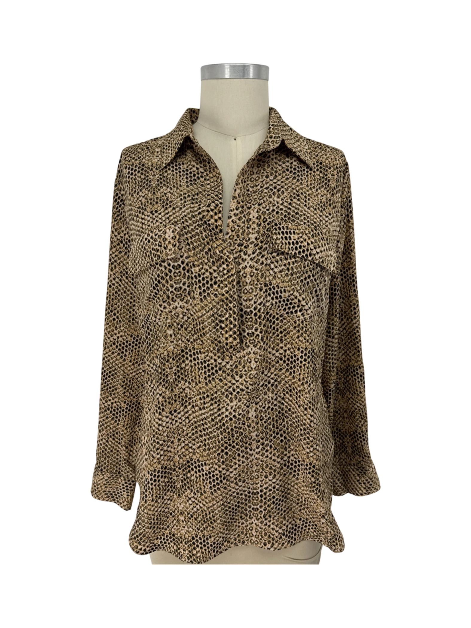 Elevate your wardrobe with this stylish pre-owned NEW YORK & COMPANY blouse. Featuring a chic animal print design in shades of brown, this blouse is perfect for adding a touch of sophistication to any outfit. Crafted from a comfortable polyester material, it offers a flattering fit and is ideal for both casual and formal occasions. Its timeless design ensures it complements any style. Excellent condition and a great addition to your closet!