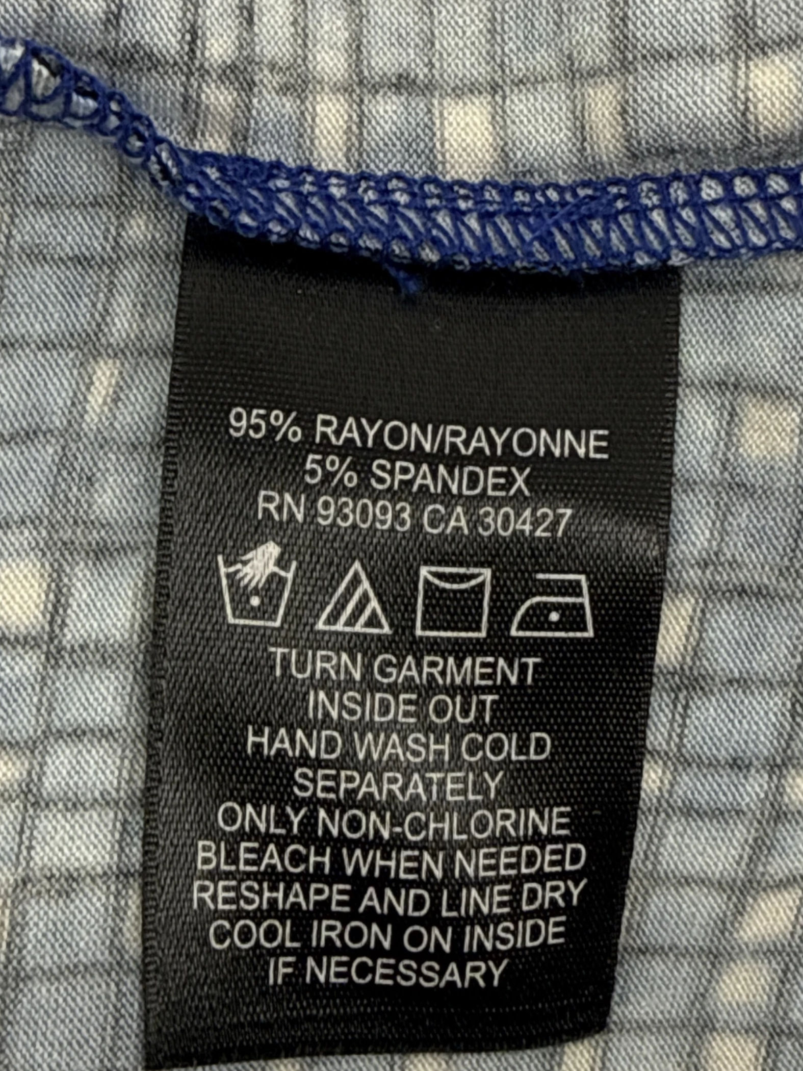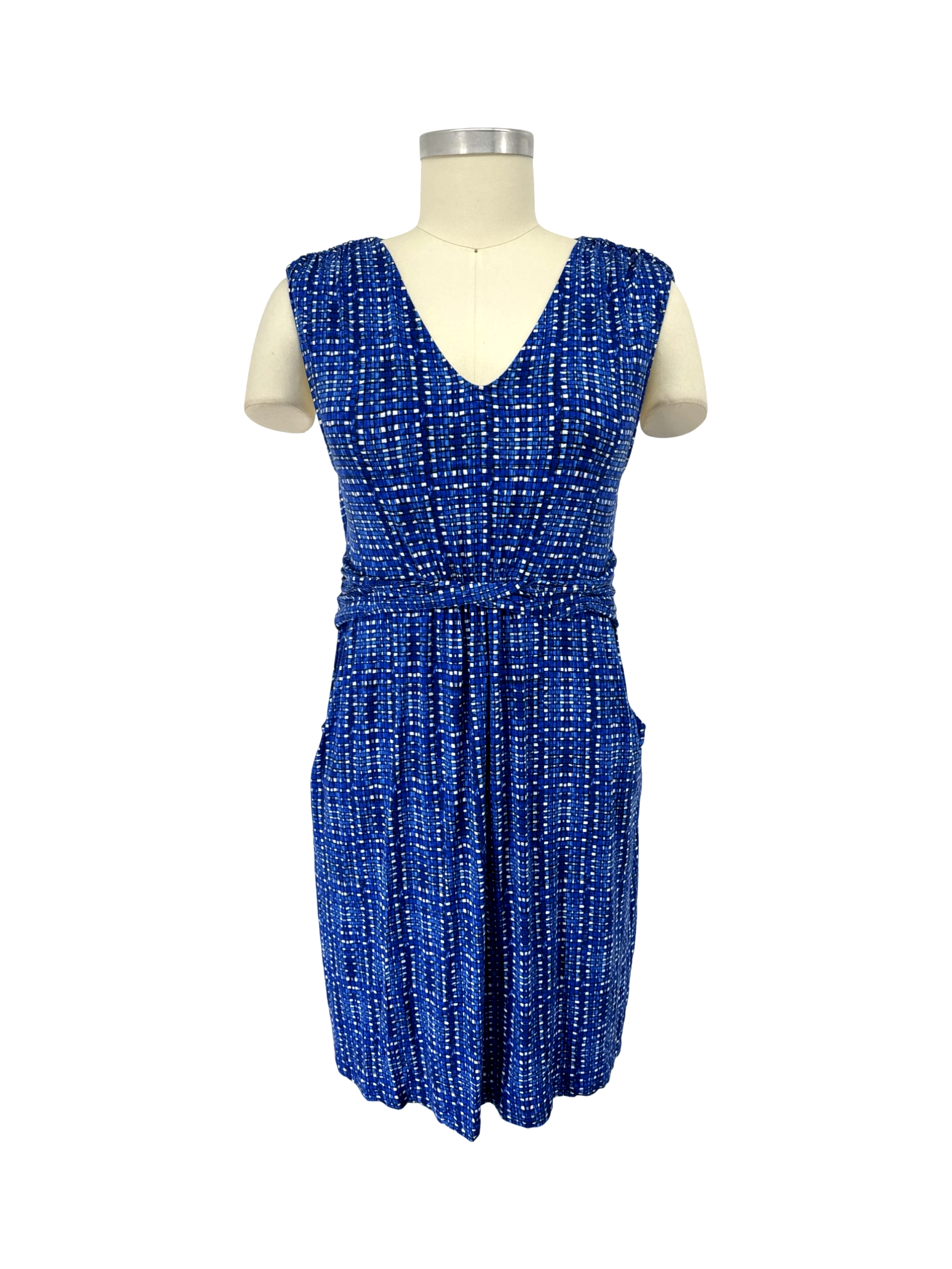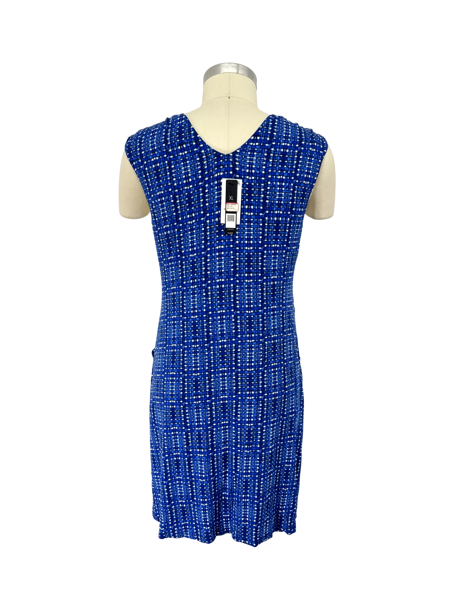 This stylish pre-owned Nic + Zoe dress is a must-have for your summer or spring wardrobe. Featuring a flattering A-line silhouette and V-neckline, this dress is perfect for casual outings. The geometric blue pattern adds a touch of sophistication, while the soft rayon and spandex blend ensures all-day comfort. Size XL, this dress is a great addition to any woman's collection.