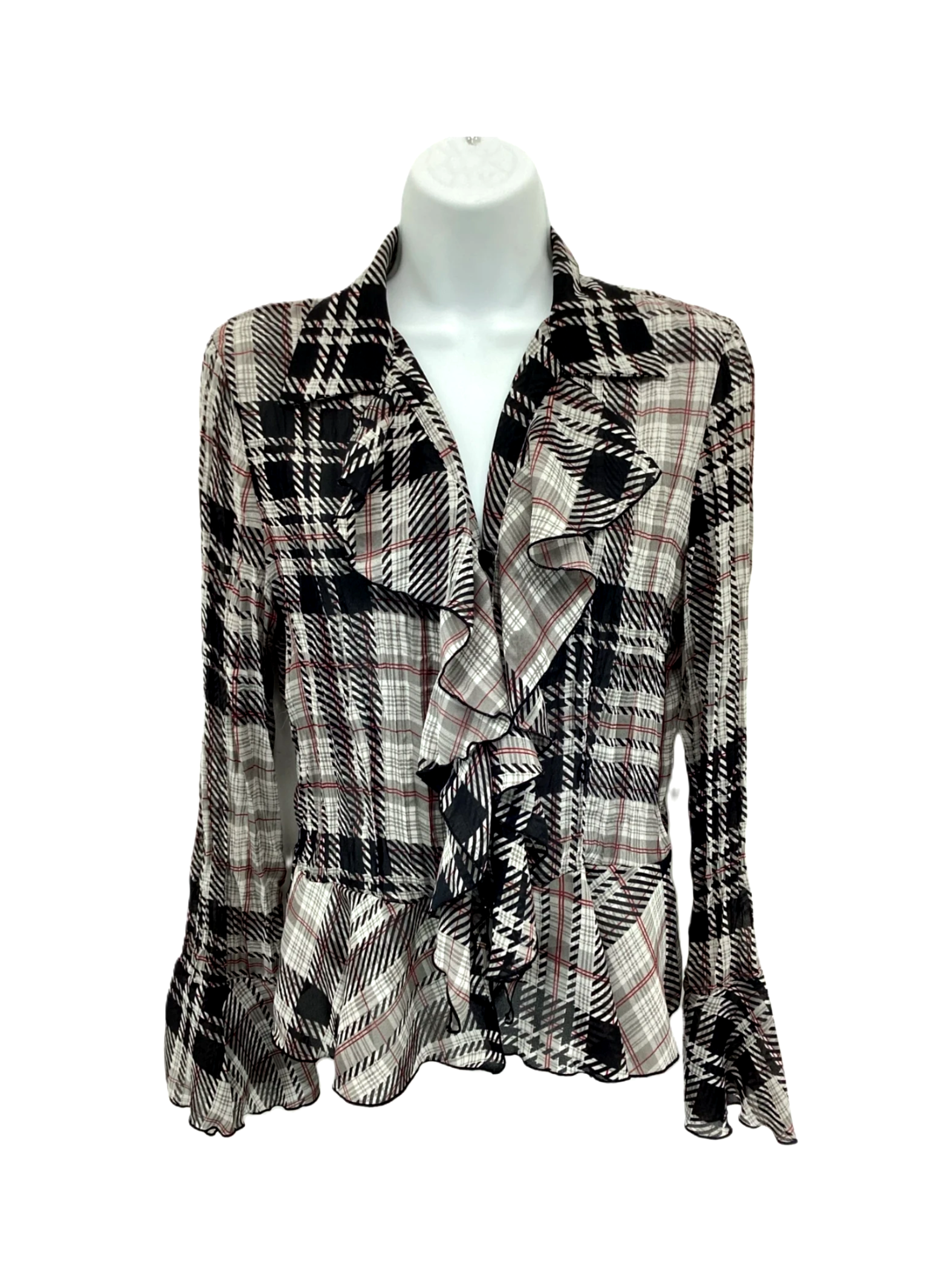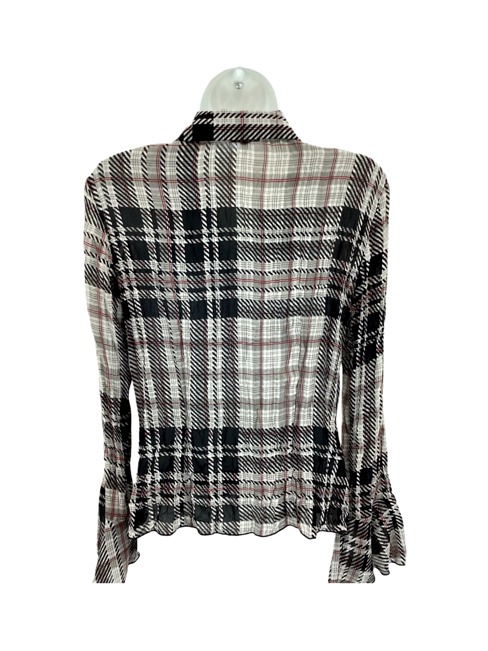 Elevate your wardrobe with this stylish pre-owned NICOLA plaid blouse. This blouse features a chic plaid pattern in black, gray, and red, perfect for fall and winter seasons. Made from comfortable polyester, it offers a flattering fit with a V-neck and long sleeves. Ideal for any occasion. A great addition to any woman's closet