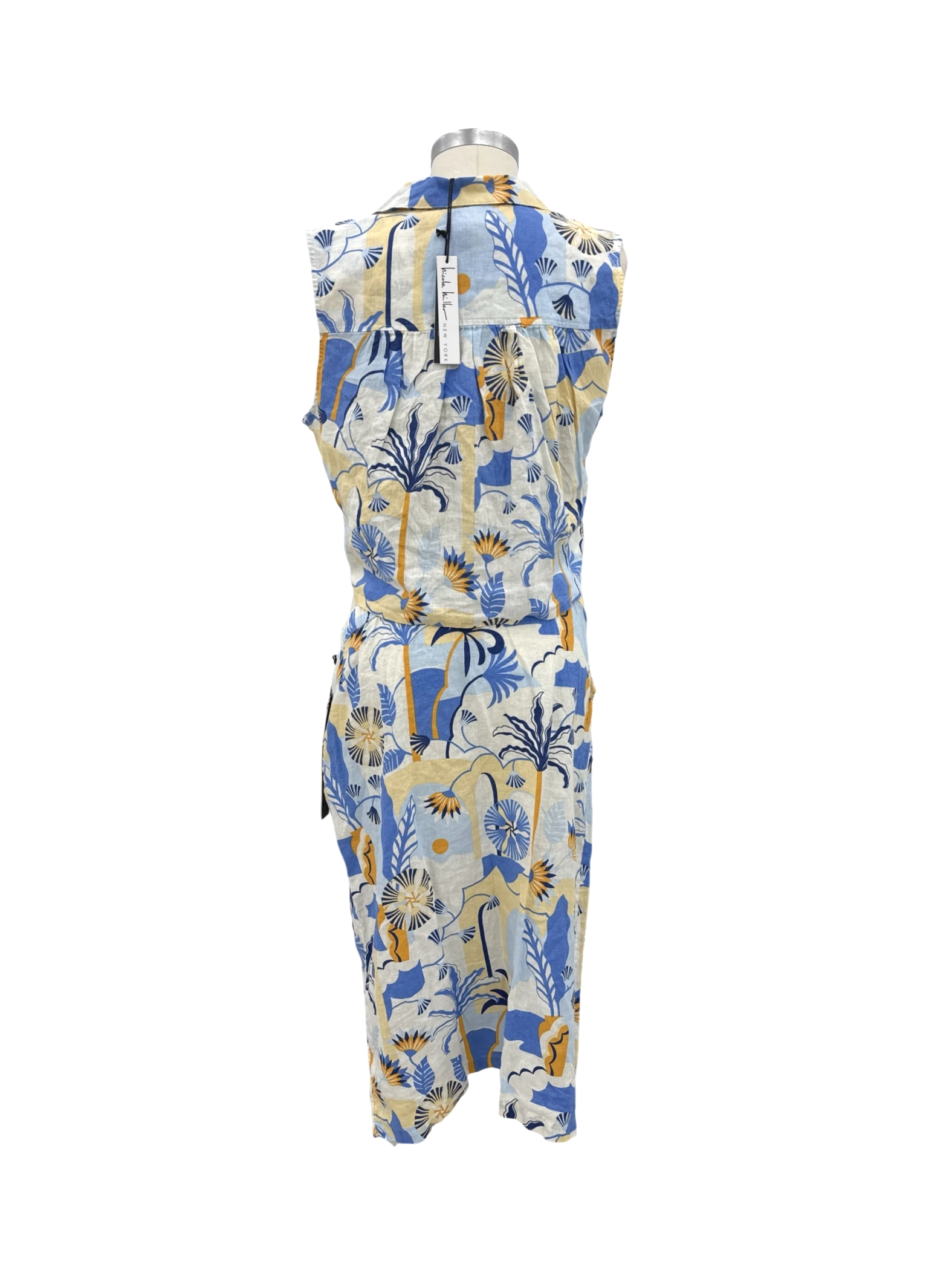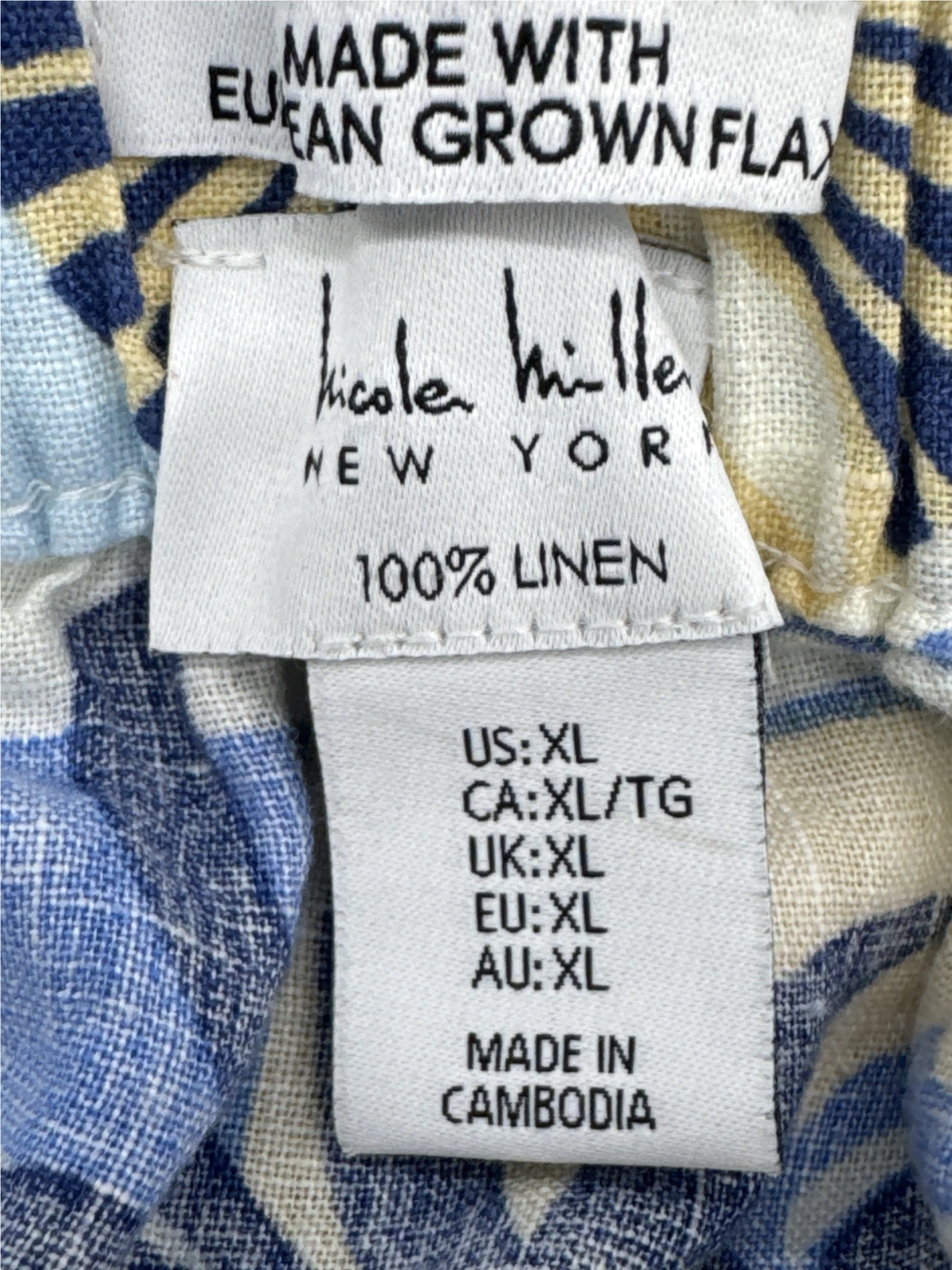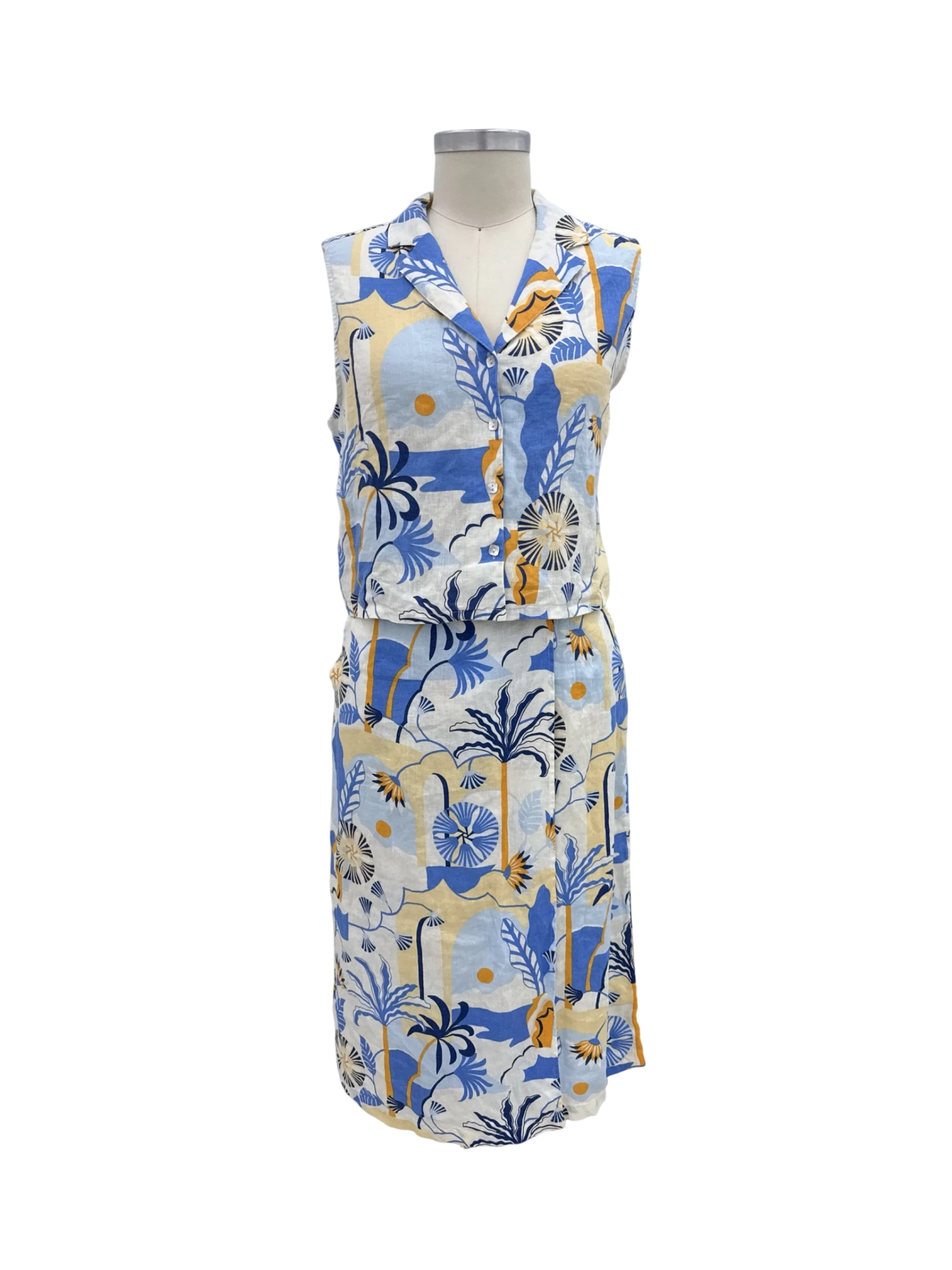 Embrace summer in this pre-owned Nicole Miller set. Crafted from 100% linen, this vibrant set features a sleeveless top and a skirt, perfect for a breezy, stylish look. The set showcases a tropical floral pattern in shades of blue and white, ideal for warm weather outings. This set is a comfortable and eco-friendly choice. Get ready to turn heads with this unique and chic two-piece ensemble that is sure to make a statement.
