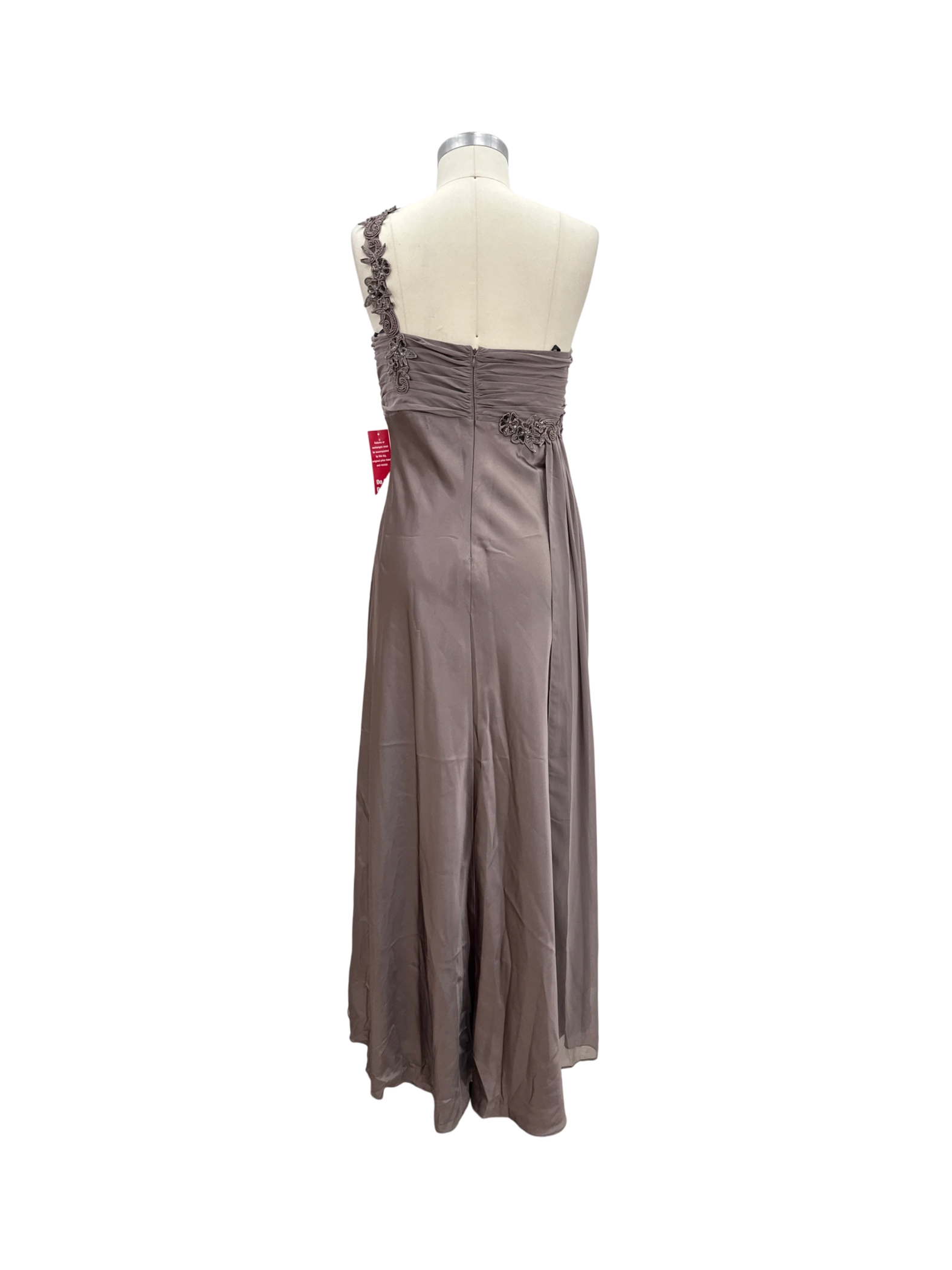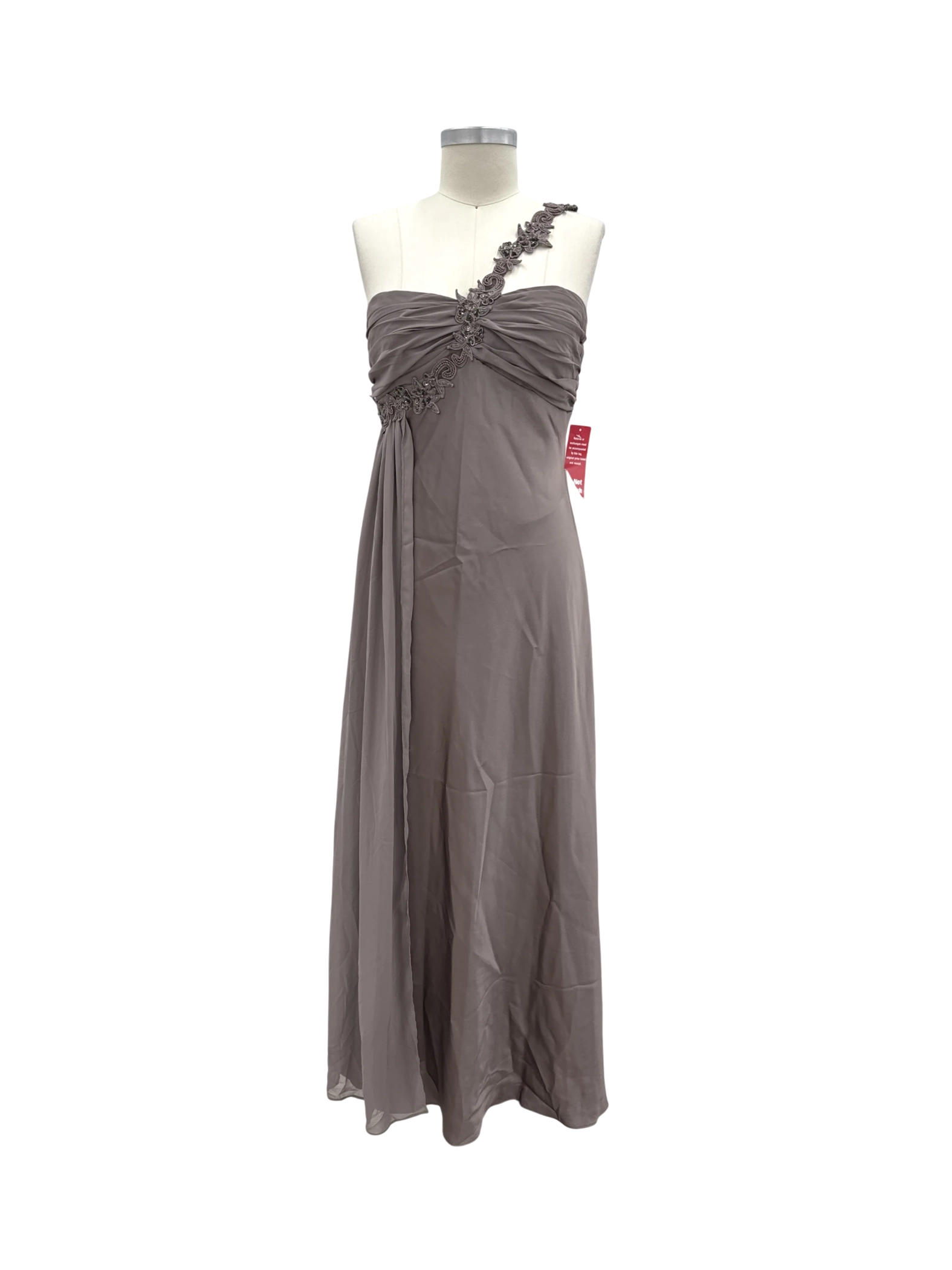 Elegant and sophisticated NIGHTWAY maxi dress, perfect for a special occasion. This pre-owned gown features a flattering one-shoulder design and a flowing silhouette, crafted from luxurious polyester material. The dress is a size 16 and features a stunning brown hue. Ideal for evening events, this dress exudes grace and style, making it a timeless addition to any wardrobe. This dress is perfect for cocktail parties and other festive occasions.