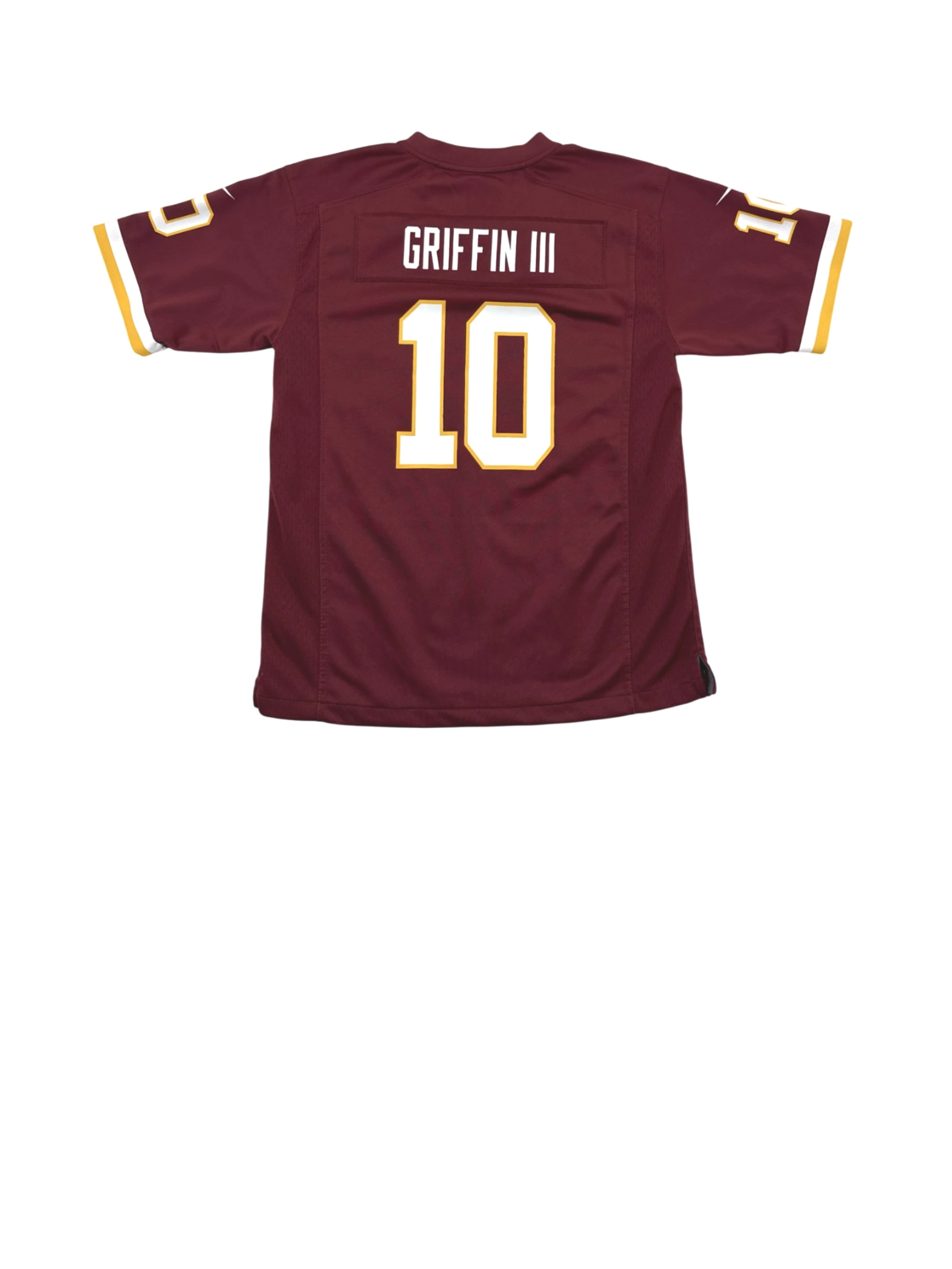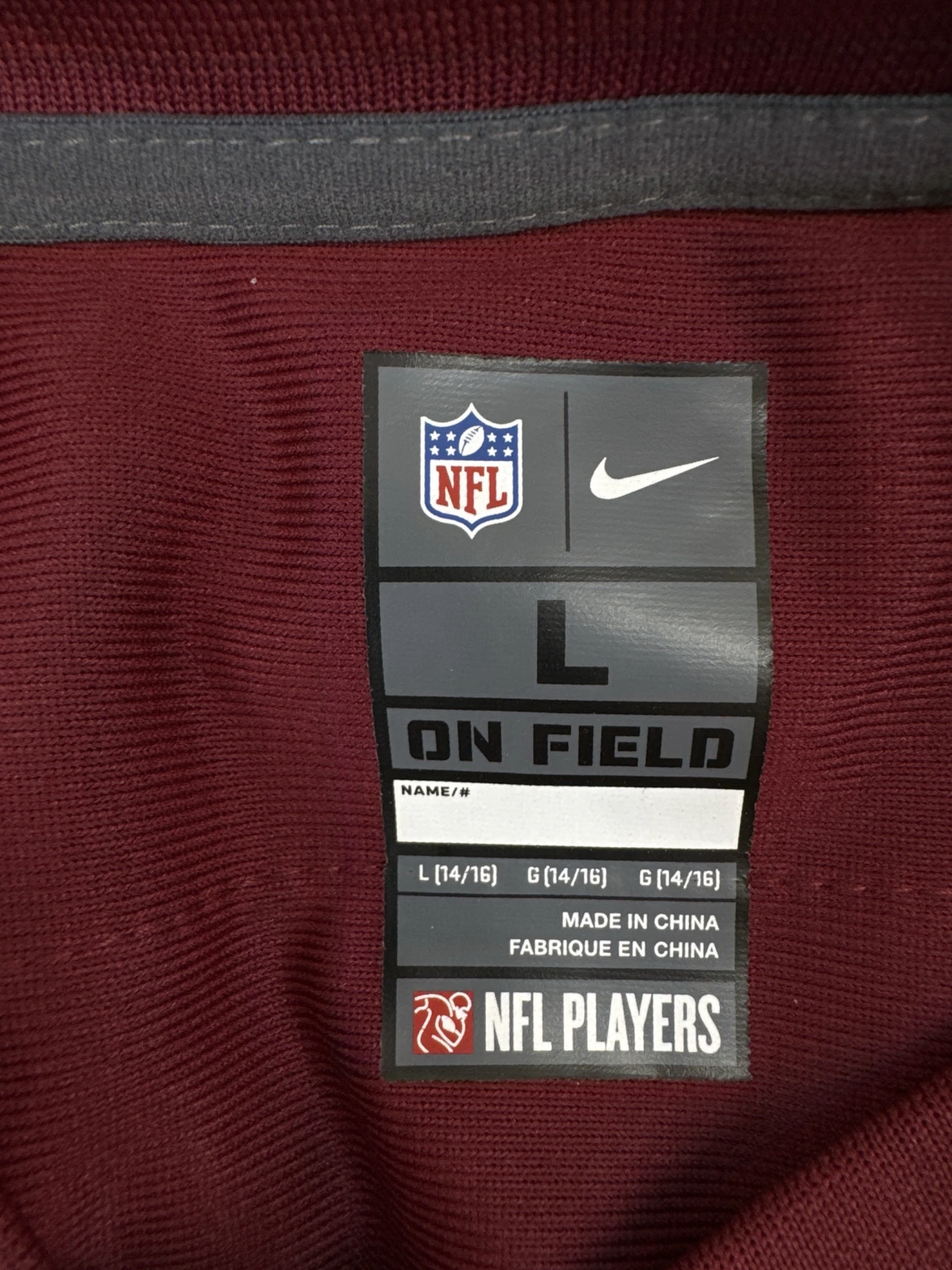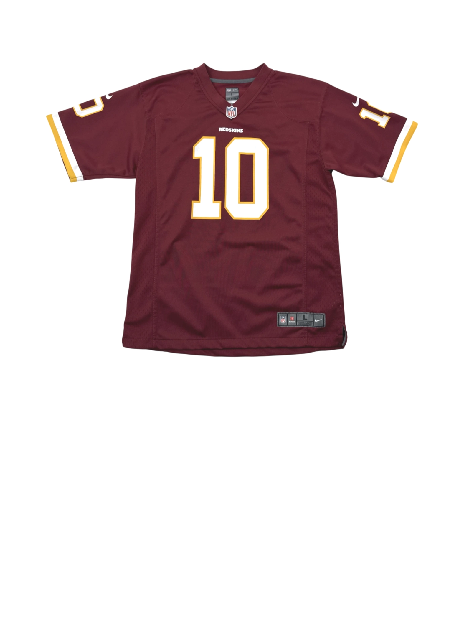 Elevate your fan game with this pre-owned Nike NFL Washington Commanders football jersey. This officially licensed jersey, featuring the iconic number 10, is perfect for any die-hard fan. Crafted from durable polyester, it offers both comfort and style. Ideal for game day or casual wear, this jersey lets you proudly represent your team. Get yours today and show your support for the Commanders!