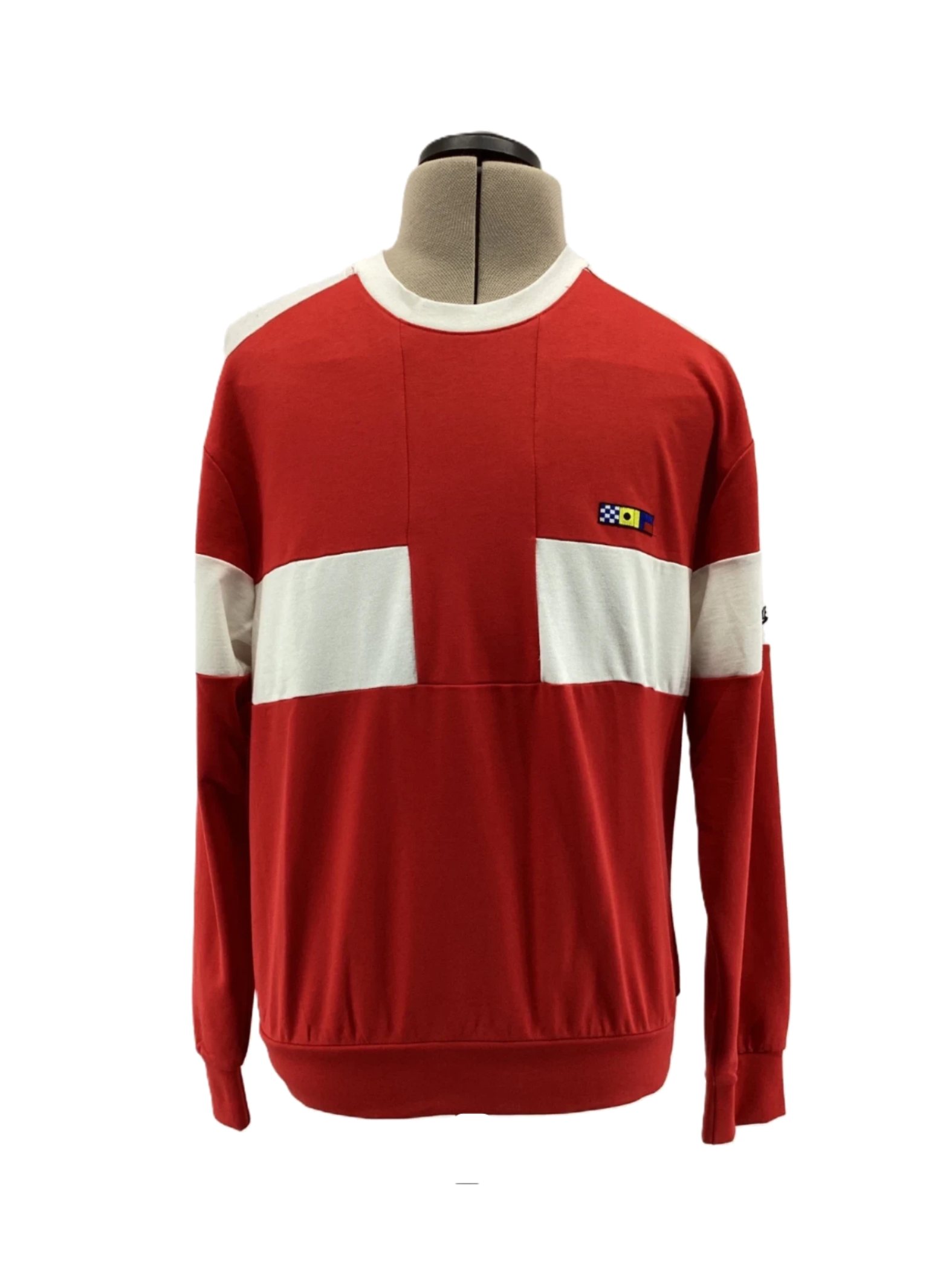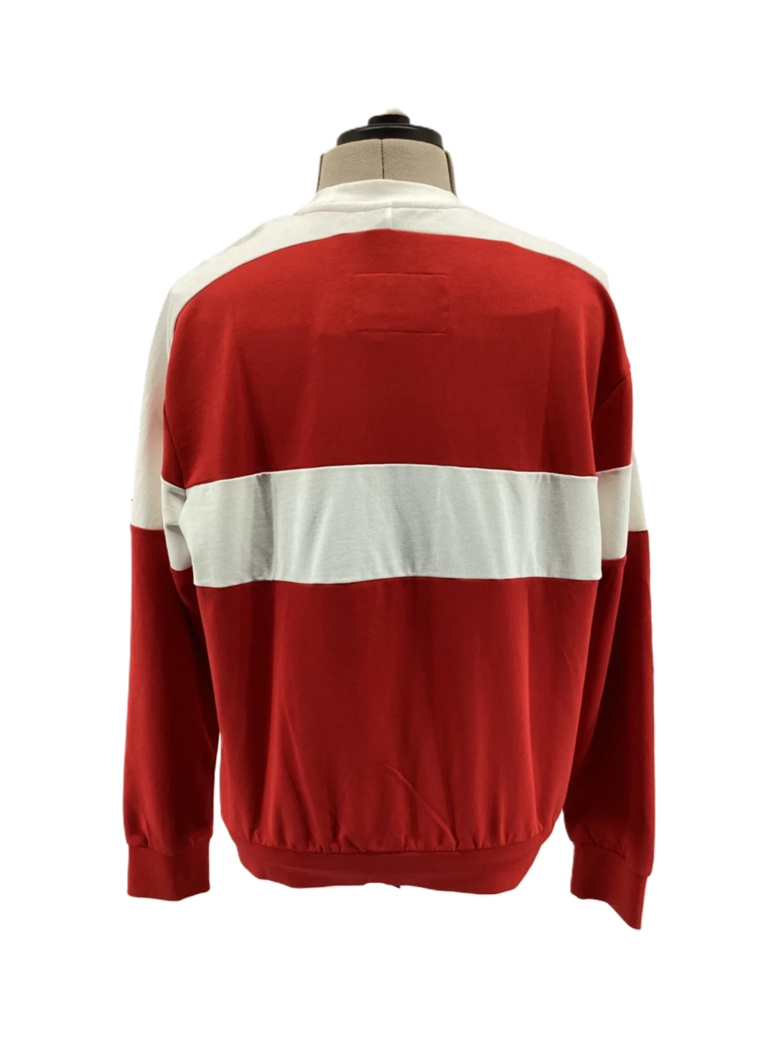 Pre-owned Nike men's casual sweater. This stylish sweater features a classic crew neck and long sleeves. The bold red and white color combination with horizontal stripe details make it perfect for casual wear. Crafted from a comfortable blend of cotton and polyester, it offers both style and durability. This sweater is a great addition to any wardrobe, providing warmth and a sporty aesthetic. Ideal for cooler seasons.