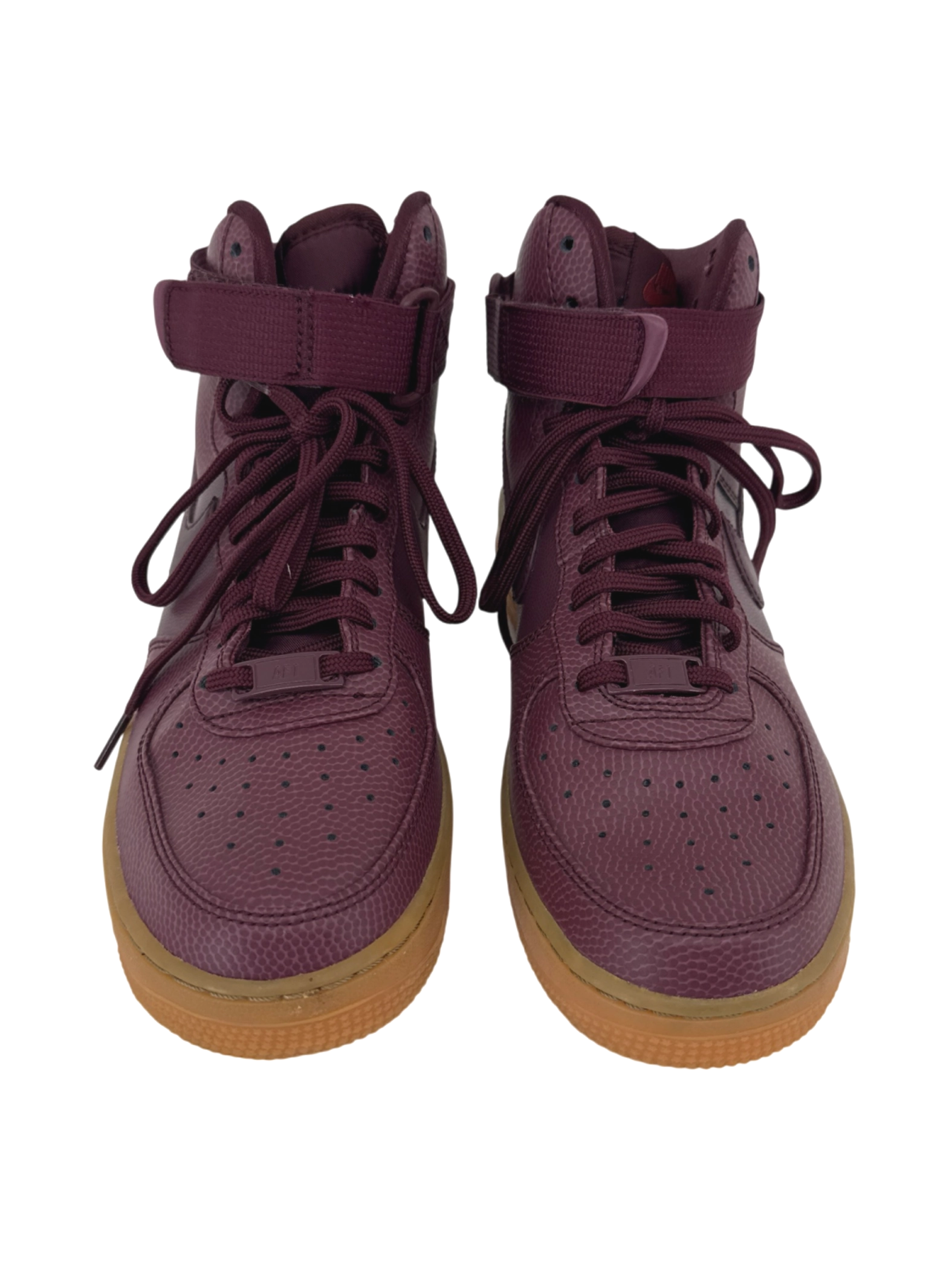 Elevate your street style with these pre-owned Nike Air Force 1 High-Top sneakers. Crafted with a rich burgundy leather upper, these shoes feature a classic high-top design and a durable brown sole. The iconic Nike swoosh and Air branding add a touch of heritage. These sneakers are a versatile addition to your wardrobe, perfect for casual wear or adding a sporty edge to any outfit. They're in excellent condition, offering both style and comfort for everyday use.