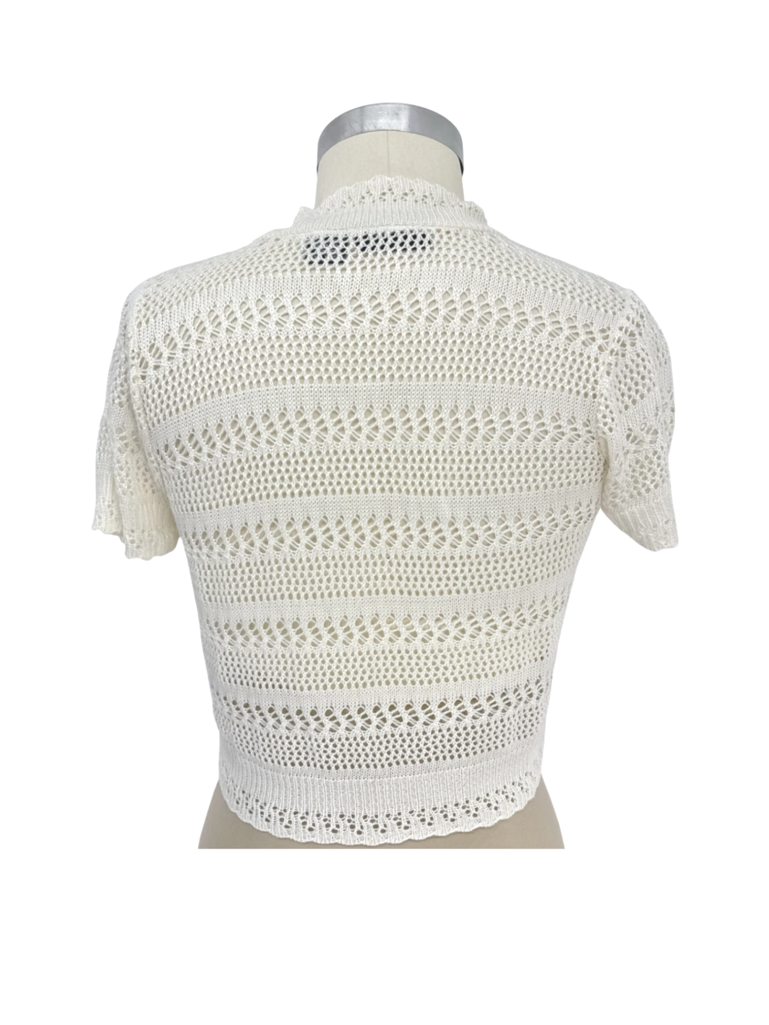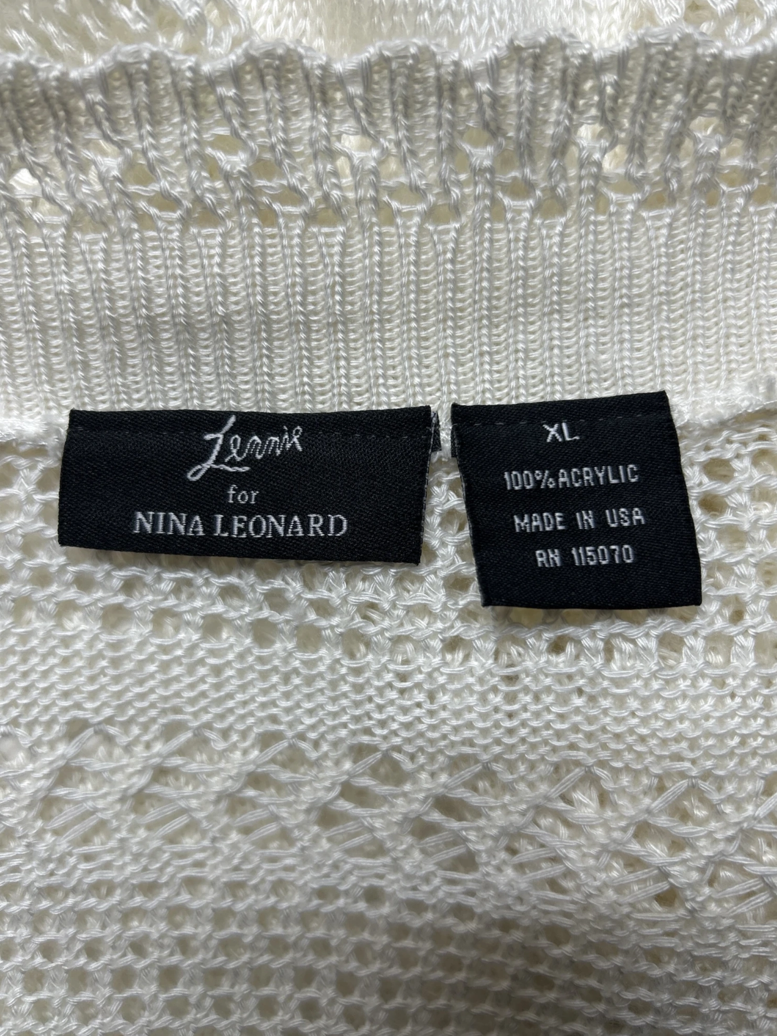 This pre-owned Nina Leonard blazer is a delightful addition to any wardrobe. Crafted from 100% acrylic, it features a delicate openwork design in a versatile white hue. The short sleeves and cropped silhouette make it perfect for layering over dresses or tops during warmer months. A stylish piece made in the USA, this blazer combines comfort with chic elegance, offering a vintage charm.