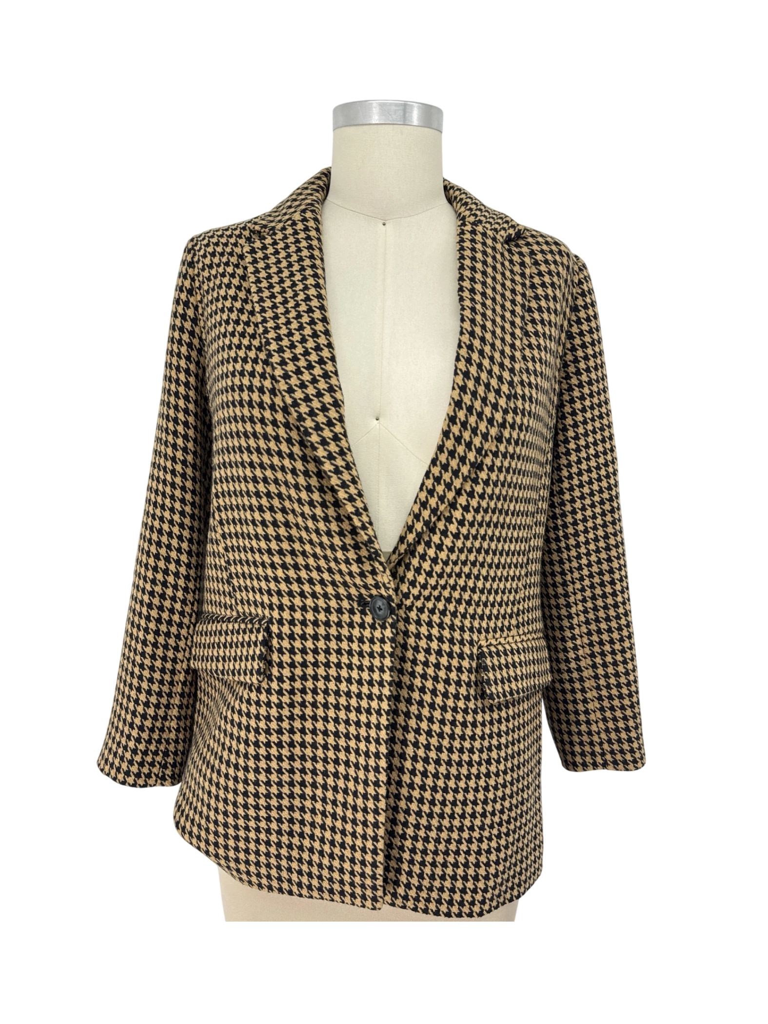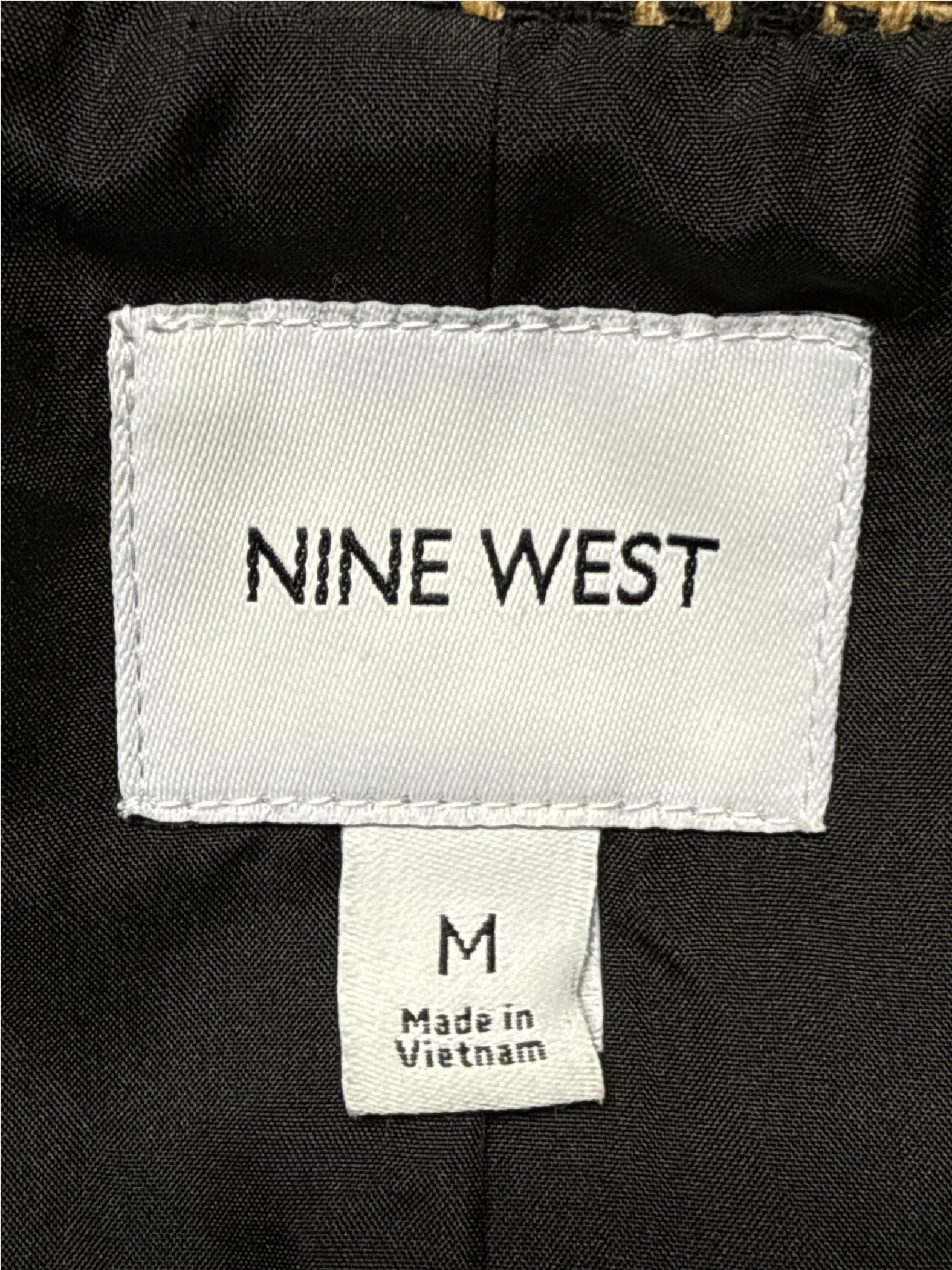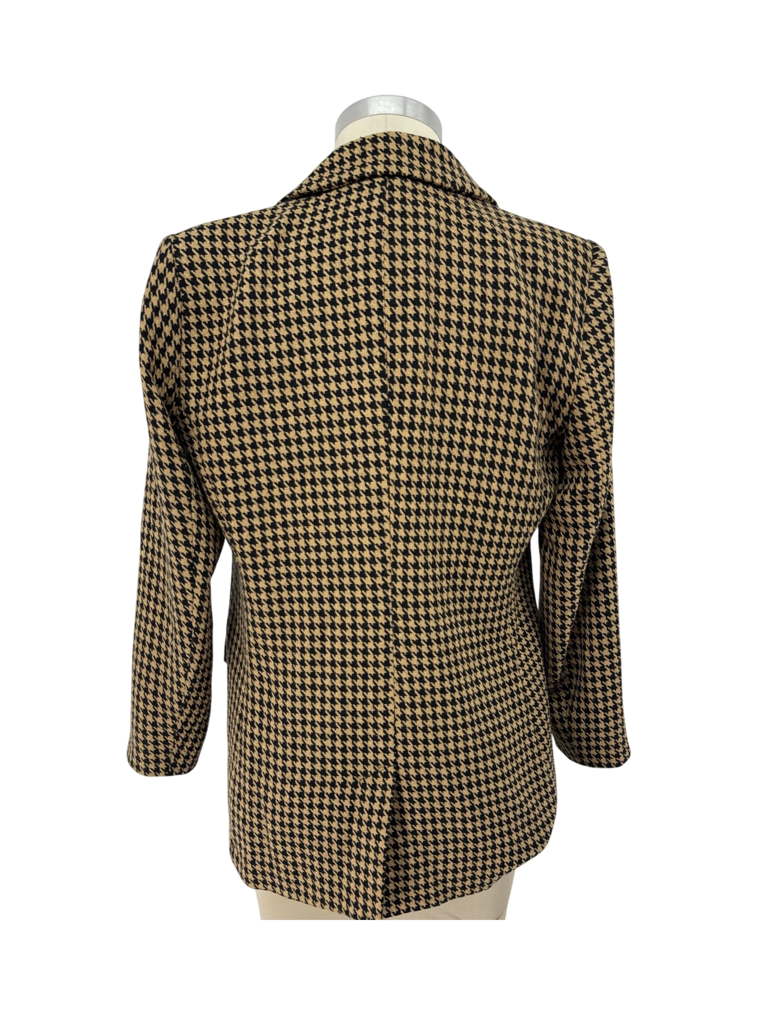 Elevate your wardrobe with this stylish Nine West Blazer. This pre-owned blazer features a classic houndstooth pattern in shades of black and brown. The blazer is crafted from a blend of polyester, acrylic, rayon, nylon and wool for a comfortable and durable wear. Perfect for the fall, winter, and spring seasons, this versatile piece can be dressed up or down. In size M, it is a timeless addition to any fashion-forward closet.