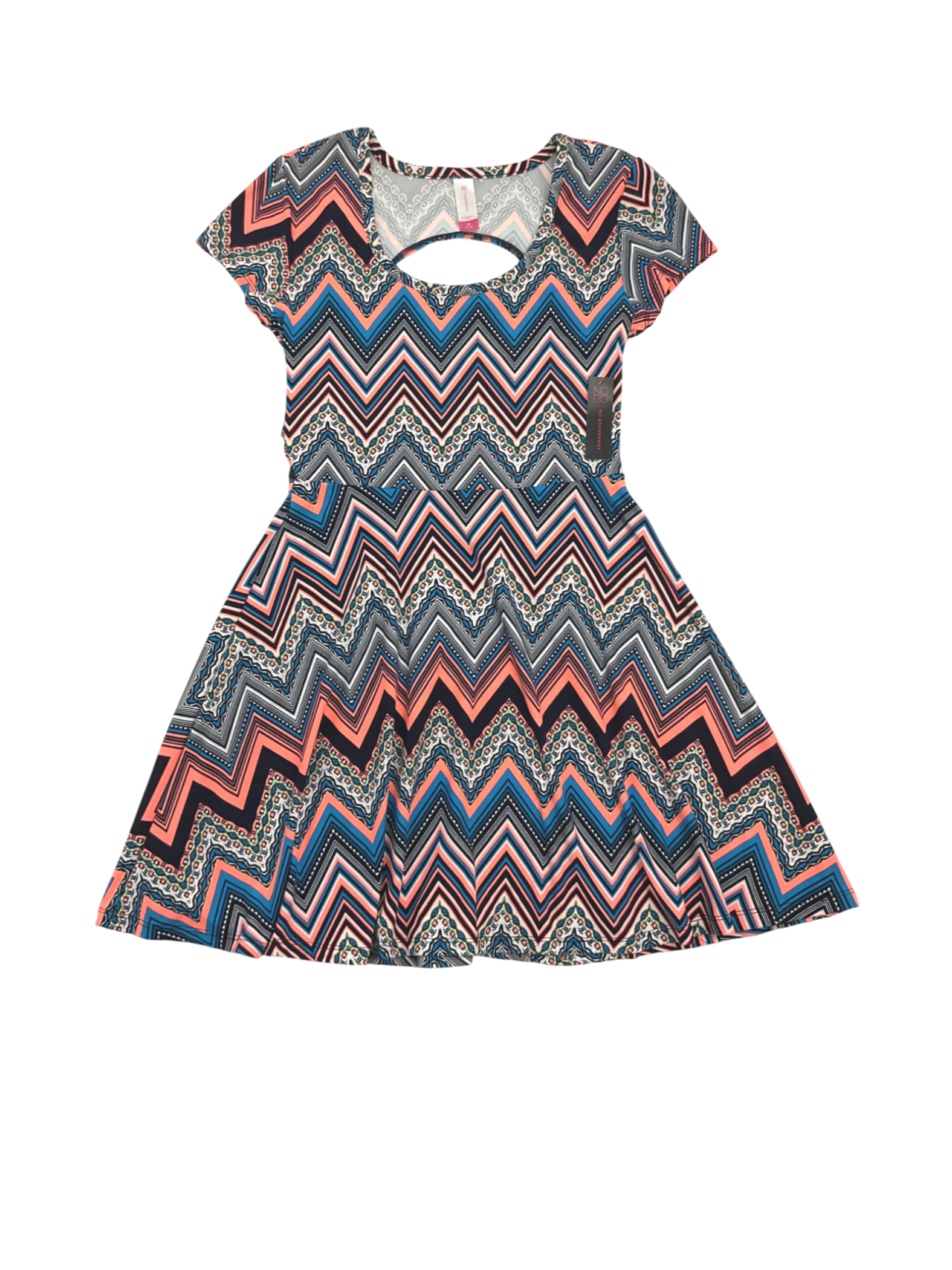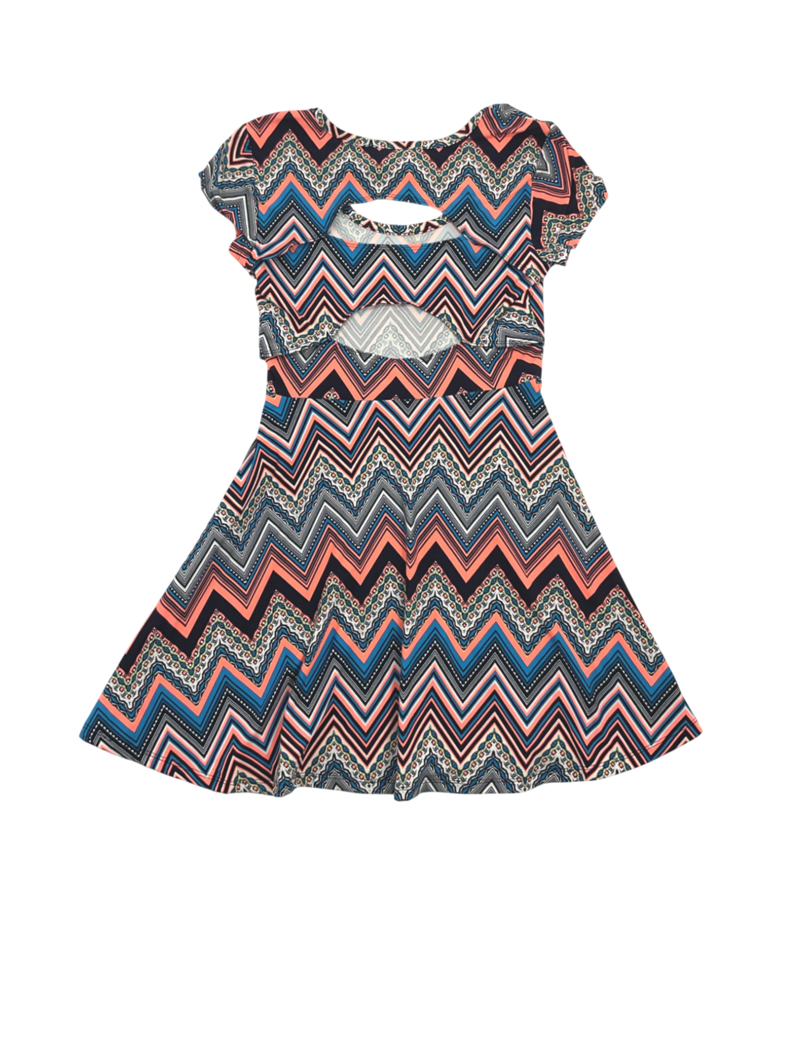 No Boundaries multi colored patterned short sleeved girls dress with a cut out back kids size M.