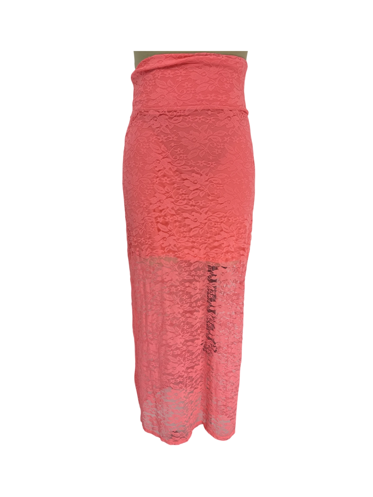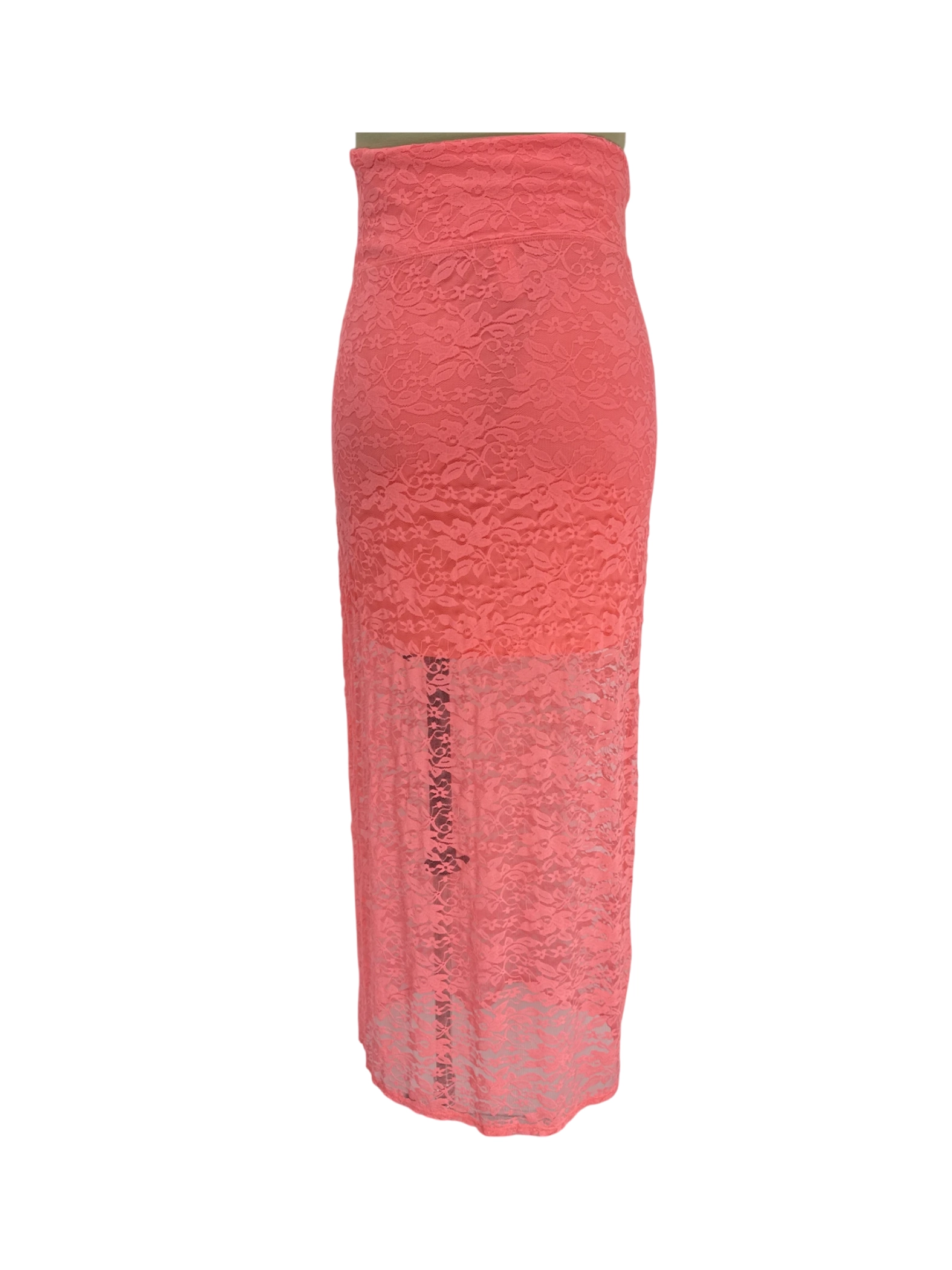 This pre-owned no boundaries maxi skirt is a stunning addition to any wardrobe. Featuring a vibrant coral lace overlay, the skirt exudes elegance and sophistication, perfect for warm weather. The pencil style silhouette offers a flattering fit, while the comfortable blend of materials ensures all-day wearability. Ideal for a summer day or night out, this skirt combines style and comfort effortlessly. A stylish and versatile piece that complements any occasion.