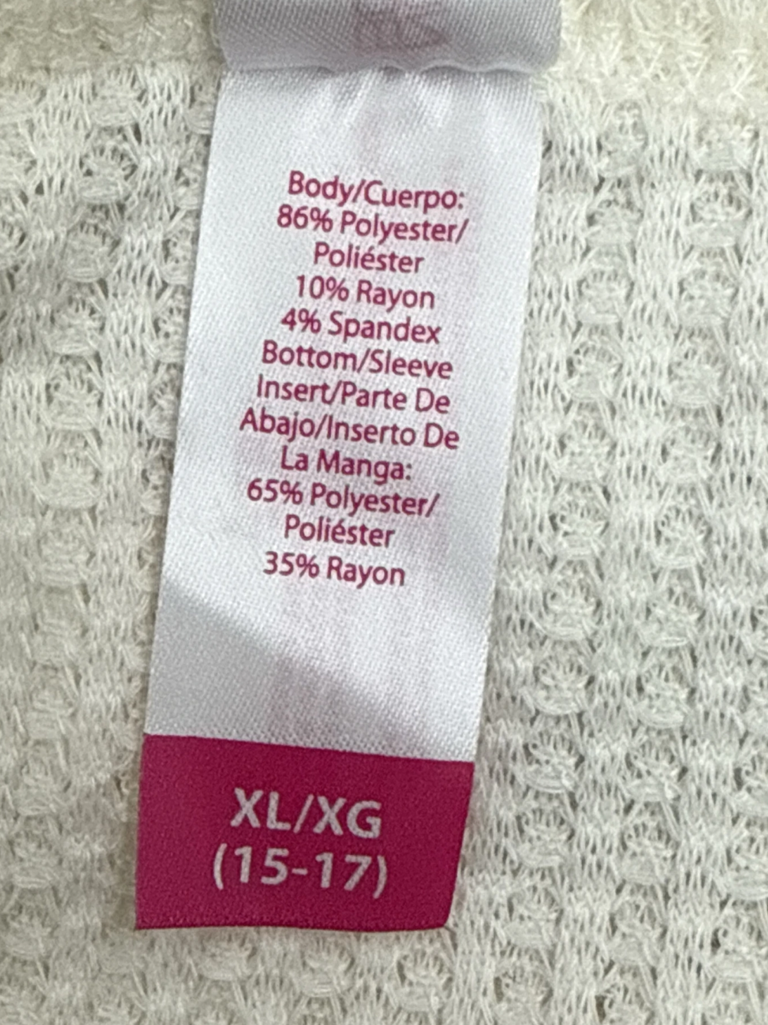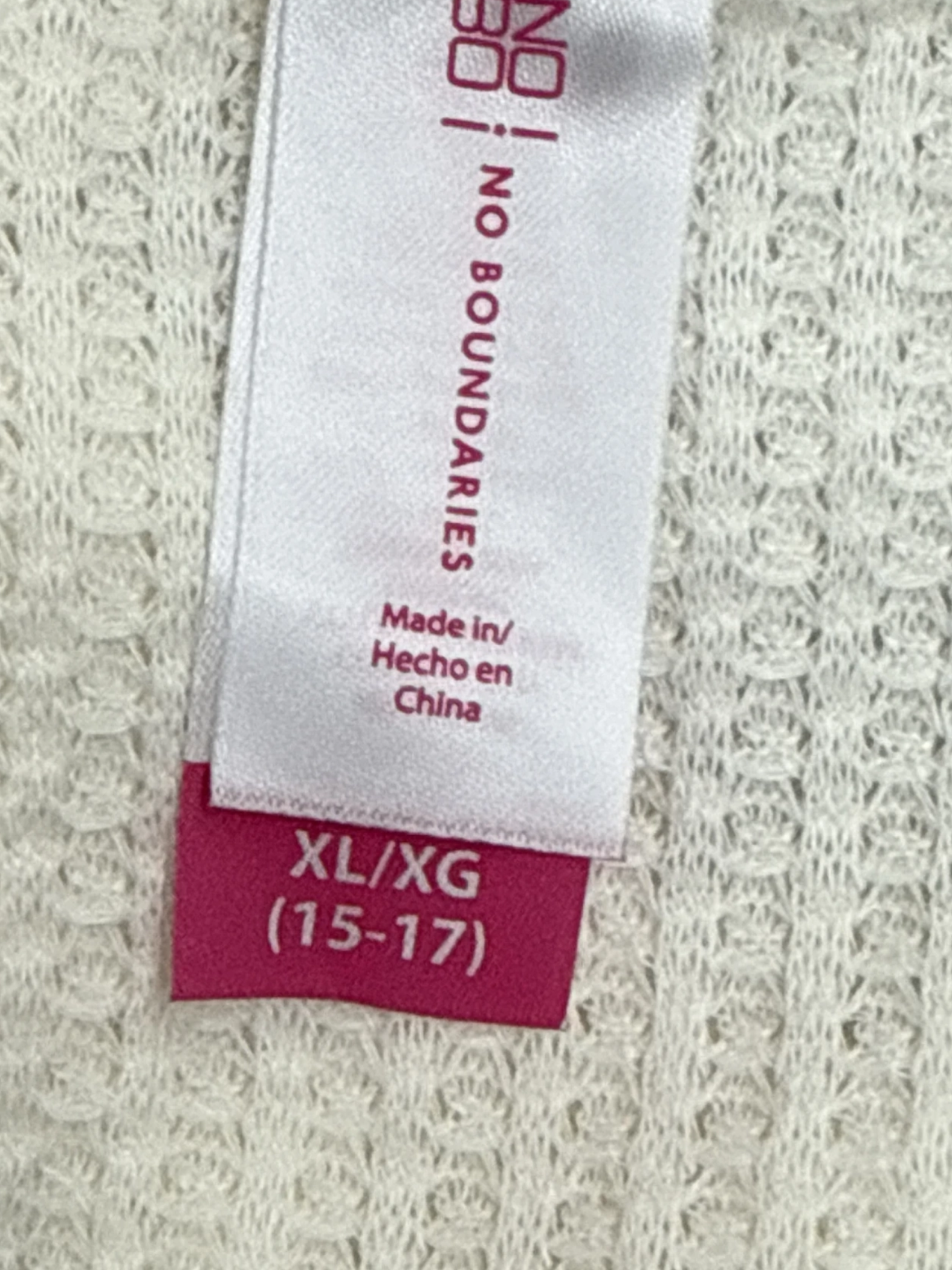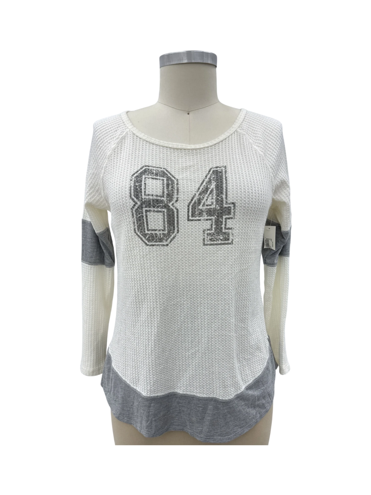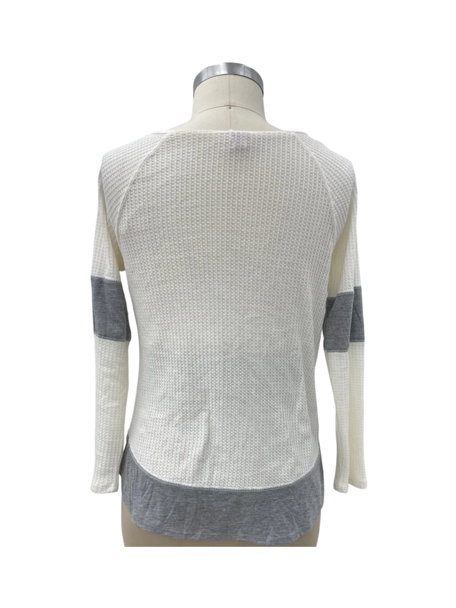 Elevate your casual wardrobe with this stylish pre-owned No Boundaries top. This top features a chic color block design with a white waffle knit base and gray accents. Perfect for adding a touch of sporty flair to your everyday look. The long sleeves offer versatility. This top is a great addition to any wardrobe.