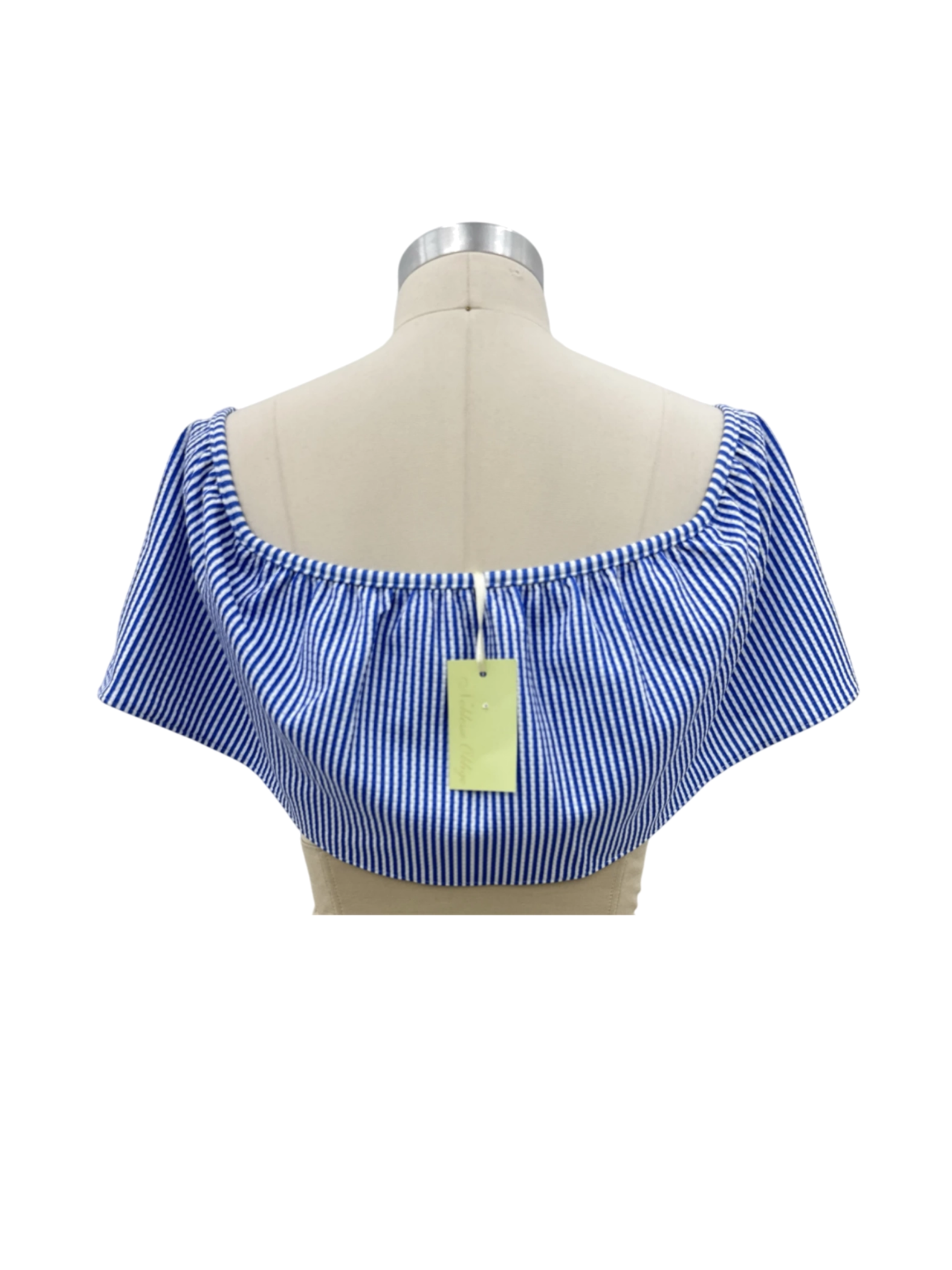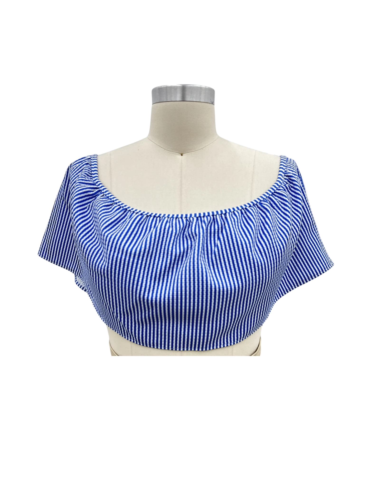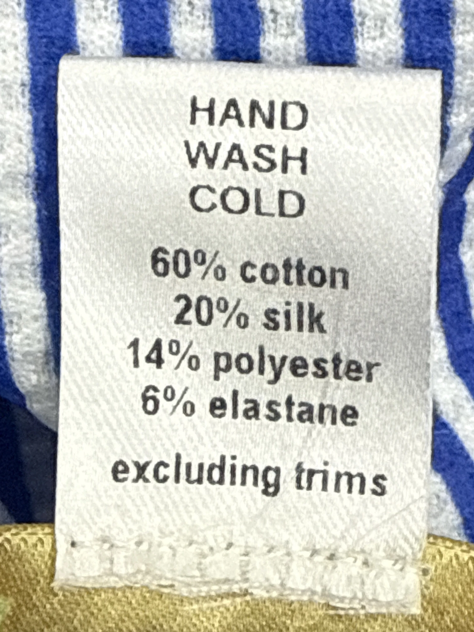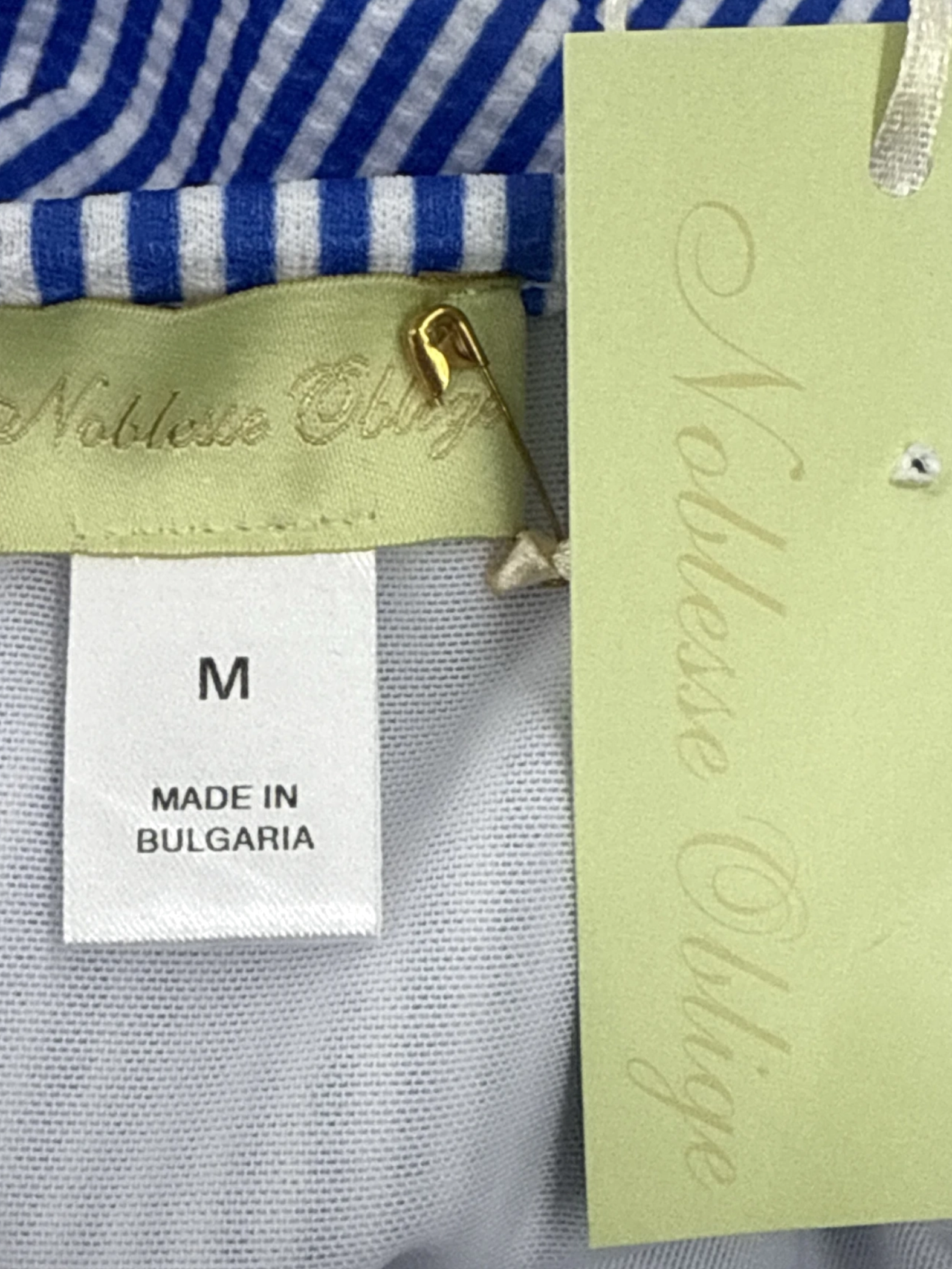 This pre-owned Noblesse Oblige bikini top in size M features a stylish blue and white striped pattern, perfect for a summer day. The top is made of a comfortable blend of cotton, silk, polyester, and elastane, offering a flattering fit. A chic and versatile addition to your swimwear collection, ideal for lounging by the pool or at the beach. Get a touch of elegance with this second-hand gem!