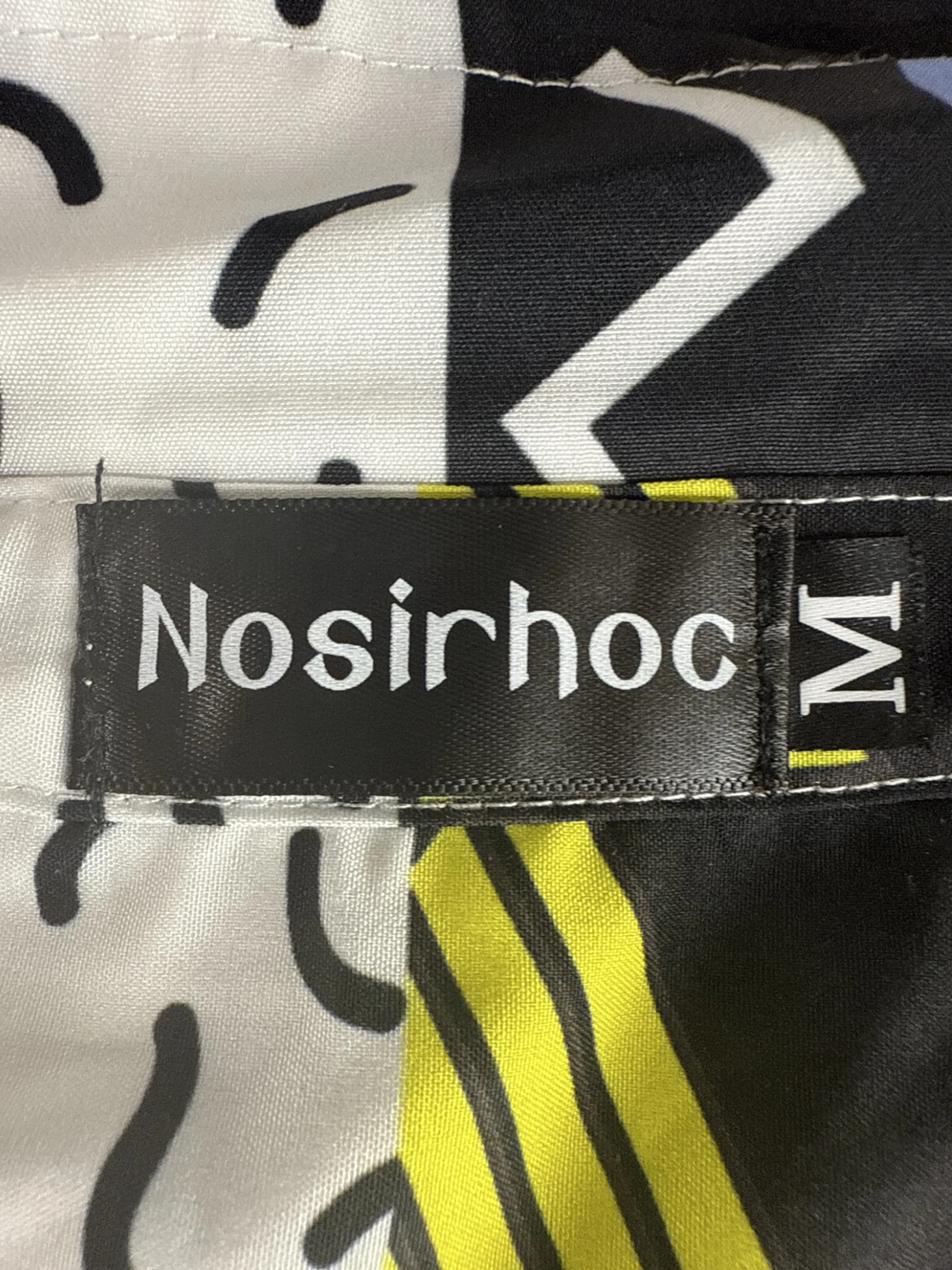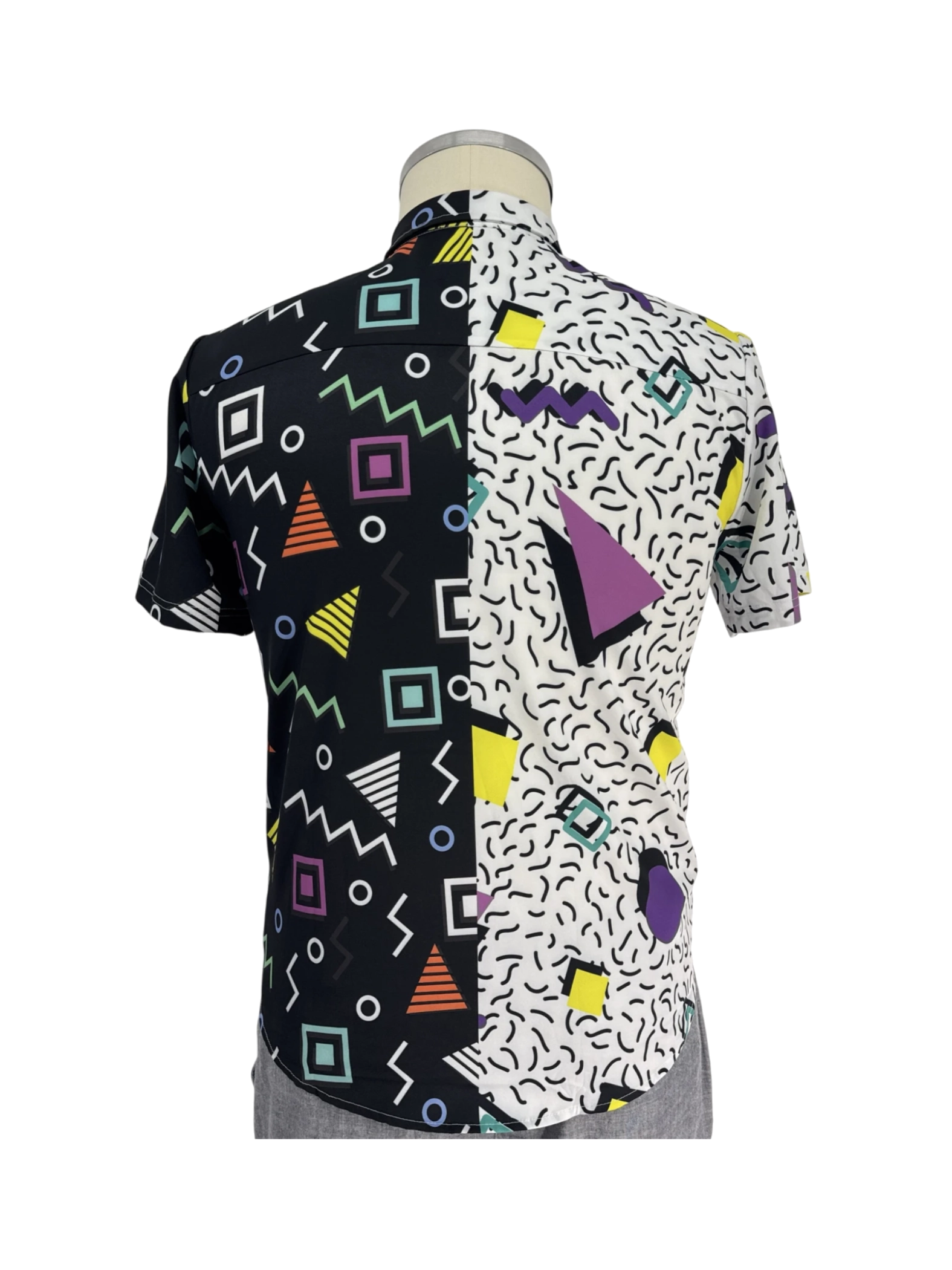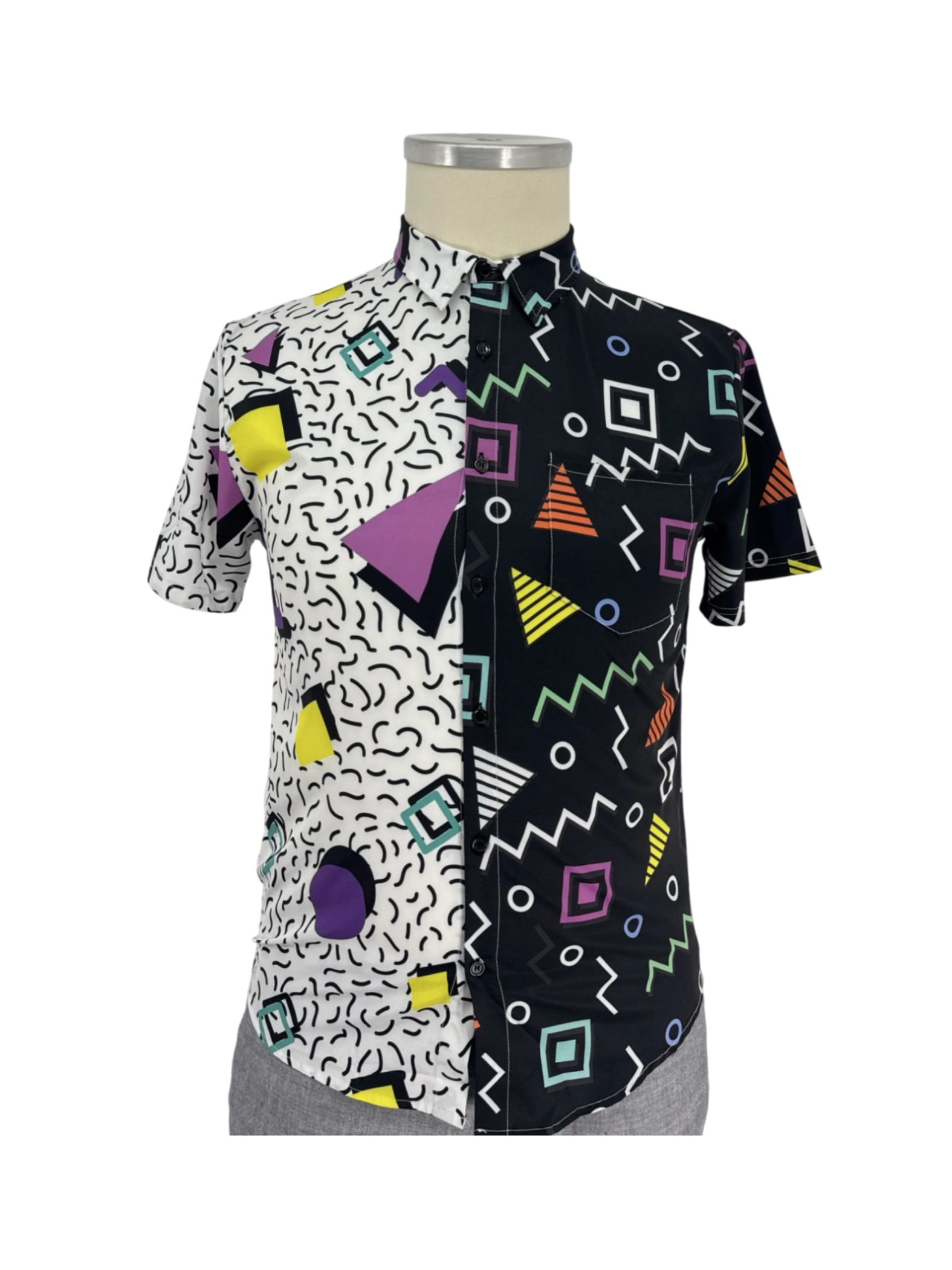 Embrace the retro vibes with this pre-owned Nosirhoc short-sleeve shirt. Featuring a striking split design with bold geometric patterns in black, white, and vibrant colors, this shirt is a statement piece. The button-up closure and classic collar offer a timeless appeal. Perfect for adding a pop of 80s or 90s flair to your wardrobe, this shirt is a must-have for anyone looking to make a bold fashion statement.
