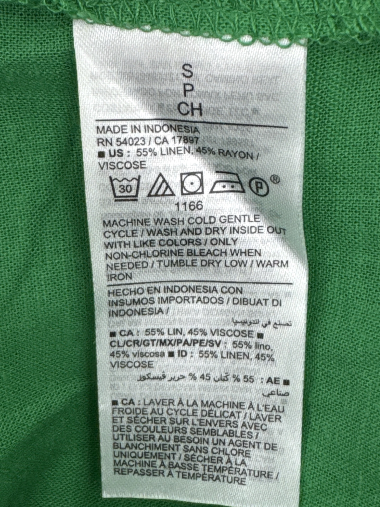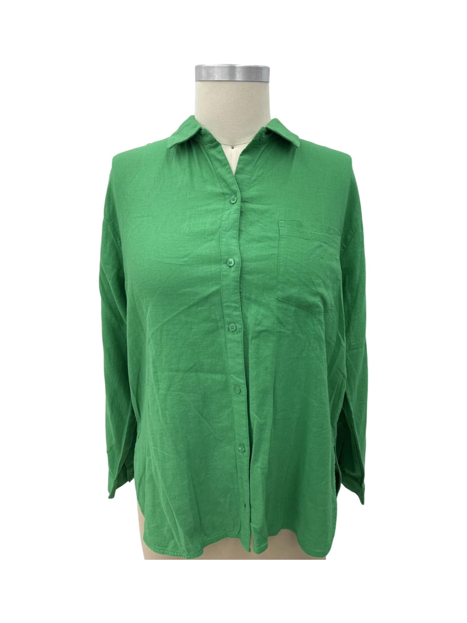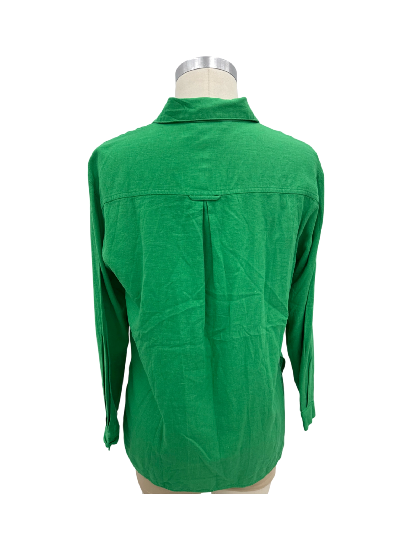 This pre-owned Old Navy green long-sleeve shirt is the perfect addition to your wardrobe. It features a classic button-down design with a collar, offering a versatile style suitable for various occasions. Crafted from a comfortable linen blend, this shirt provides a relaxed fit and breathability. Its vibrant green color makes it a great choice for both casual and semi-formal wear. A stylish and sustainable choice.