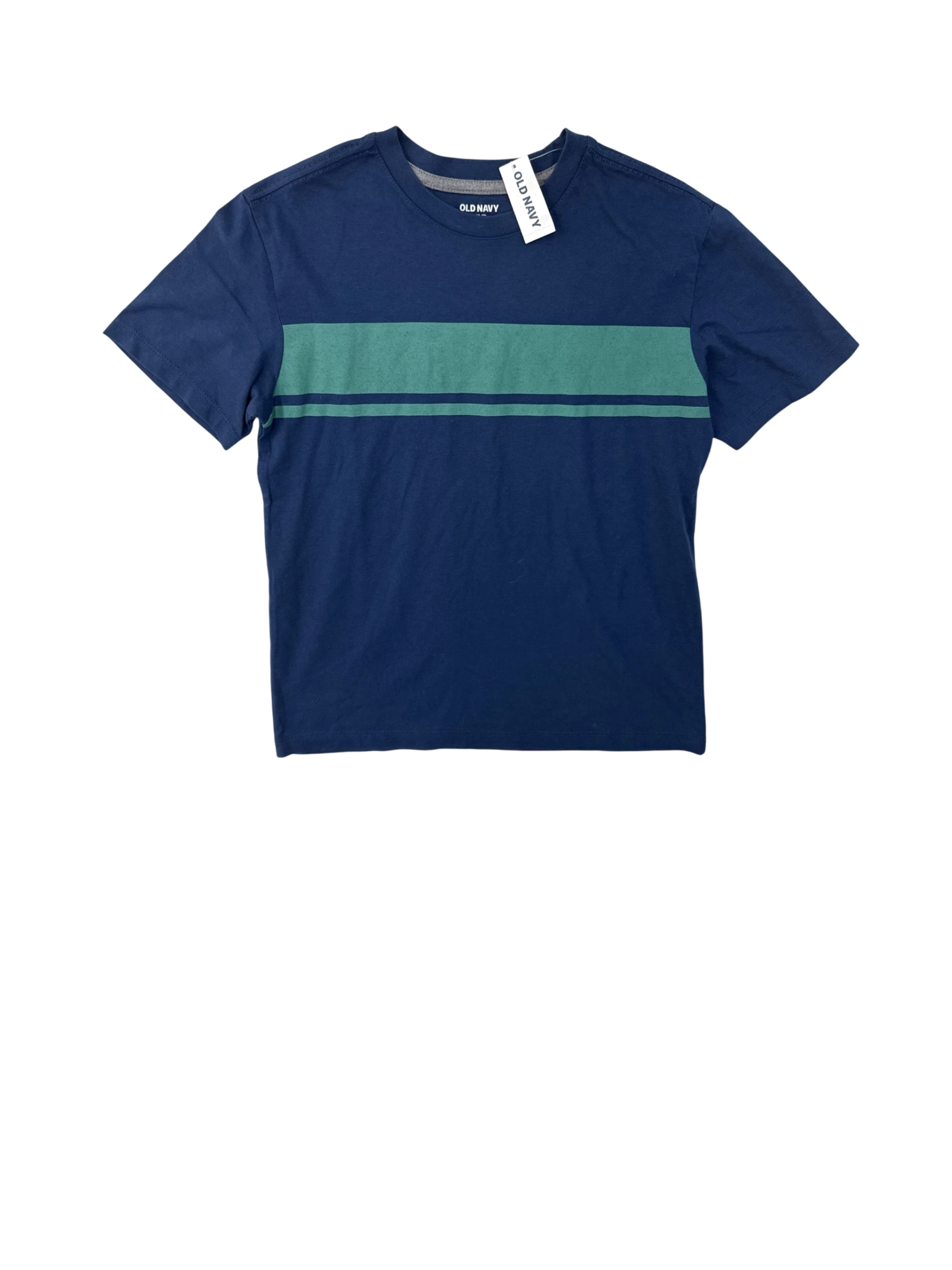 This stylish, pre-owned Old Navy boys' T-shirt is a must-have for any young fashion enthusiast. Featuring a classic crew neck and short sleeves, this tee is perfect for everyday wear. The navy blue fabric is accented with a vibrant green stripe, adding a pop of color. Made from a comfortable blend of cotton and polyester, this shirt offers both style and durability. Perfect for casual outings or layering, this Old Navy tee is a great addition to any wardrobe.