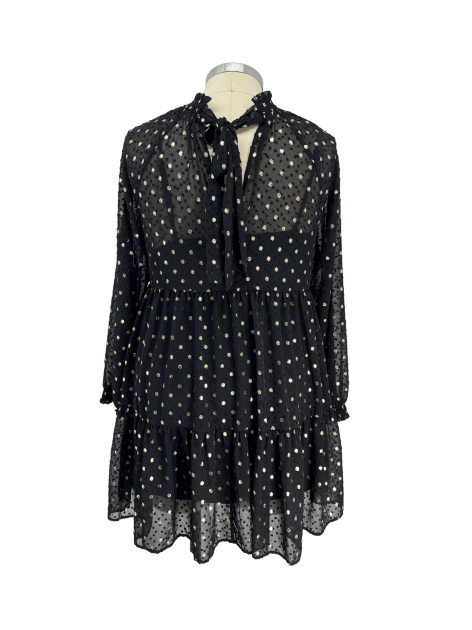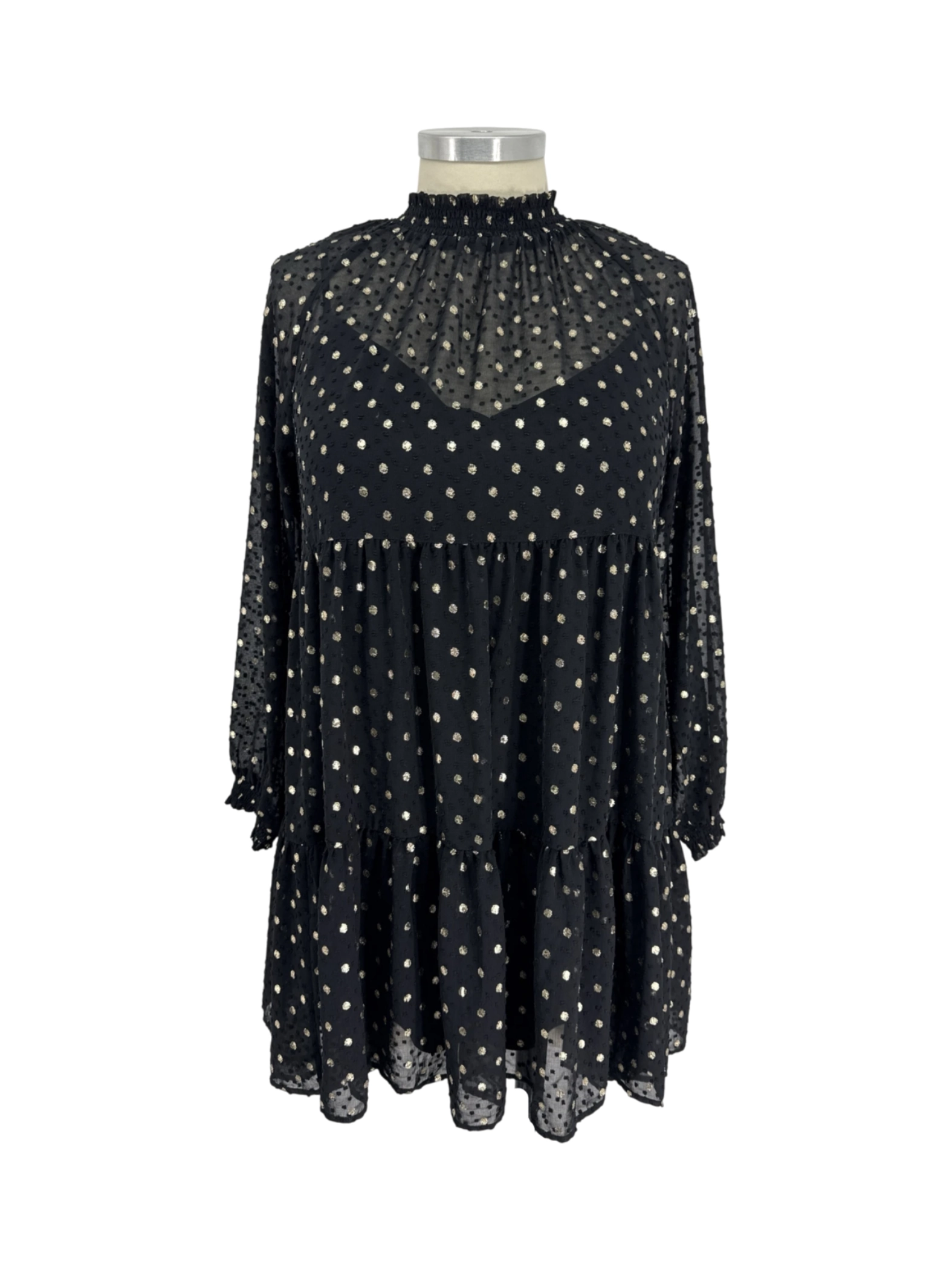 Elevate your wardrobe with this pre-owned ON•34TH dress. This stylish A-line dress features a flattering silhouette and is adorned with a playful dot pattern on a black base. Crafted from recycled polyester, the dress offers a comfortable and sustainable choice. The long sleeves and classic neckline make it perfect for cooler seasons. This versatile dress is ideal for a casual outing or a dressed-up occasion, offering both comfort and style.
