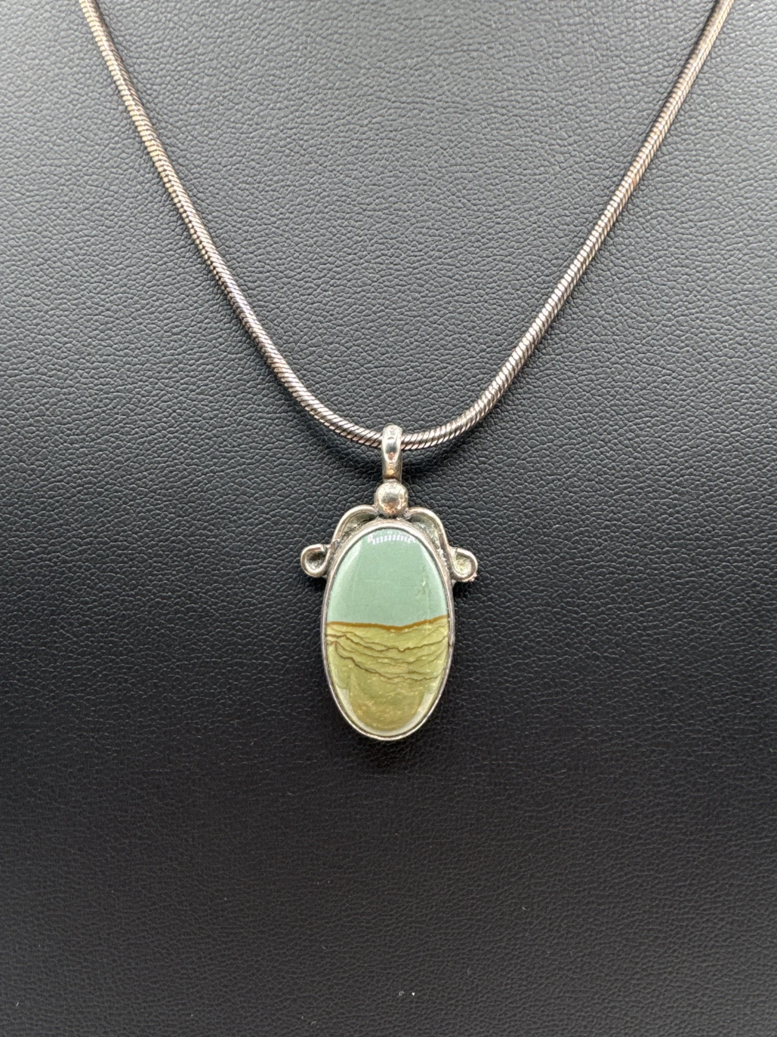 Oval asymmetrical pendant necklace with sea foam aquamarine gemstones in 925 silver, 16 inches long.