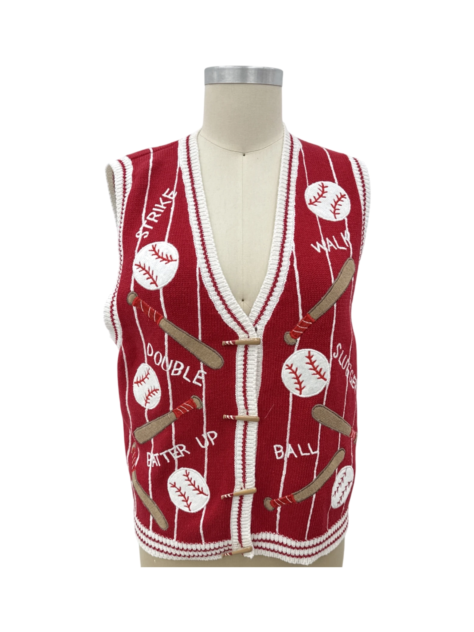 Vintage PBJ Sport vest in red with white stripes and baseball-themed embroidery. This pre-owned, sleeveless vest features a V-neck and a button-up closure. Perfect for adding a touch of sporty retro style to your outfit. The vest has a comfortable fit and is made from a blend of cotton and ramie, making it a great layering piece for the fall season.