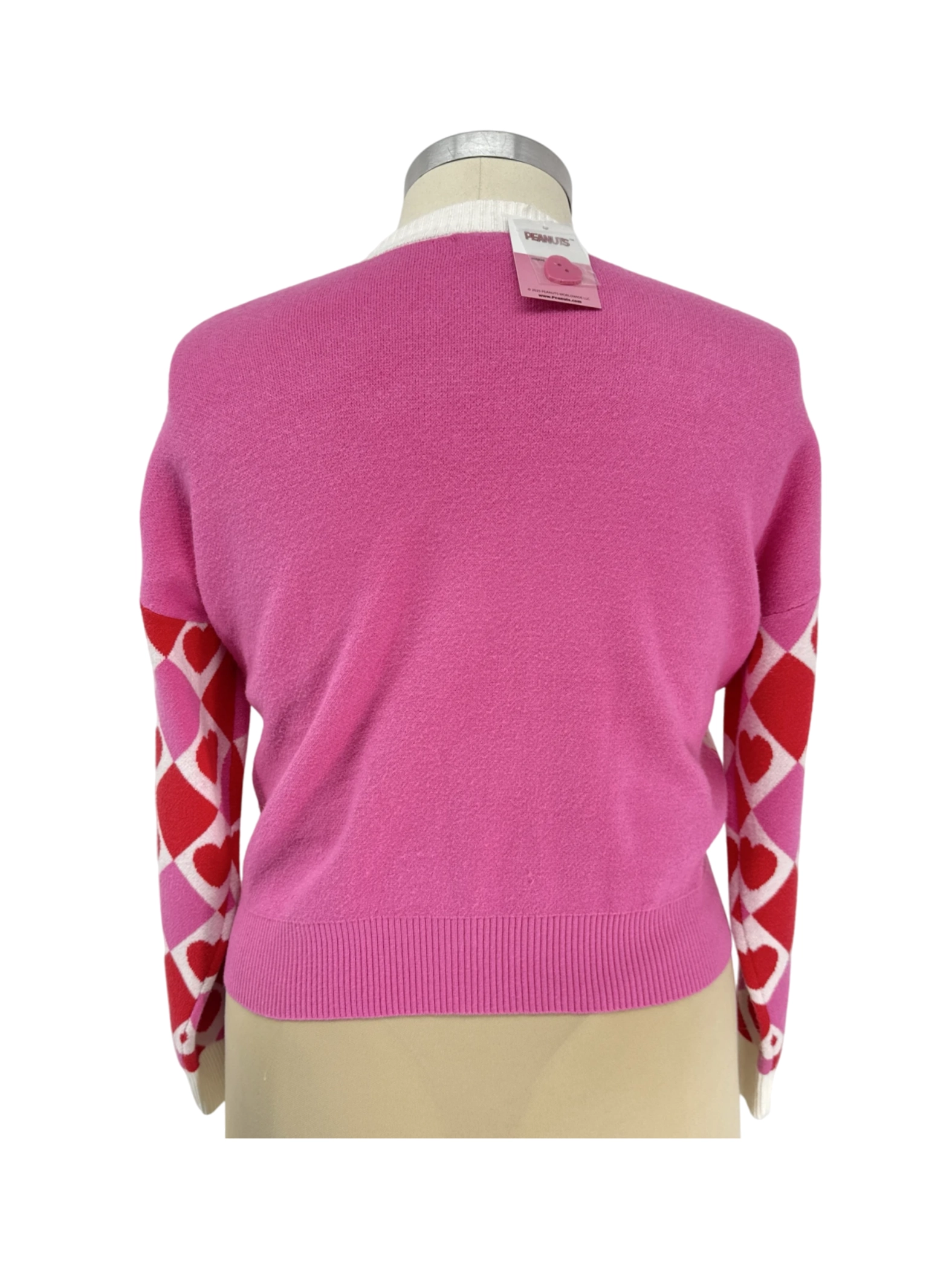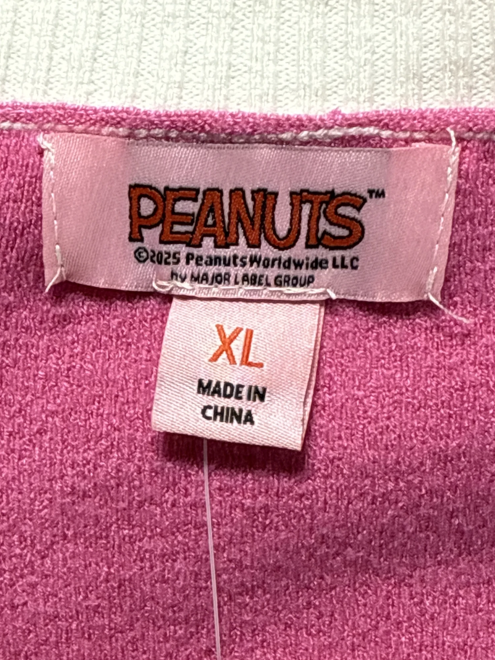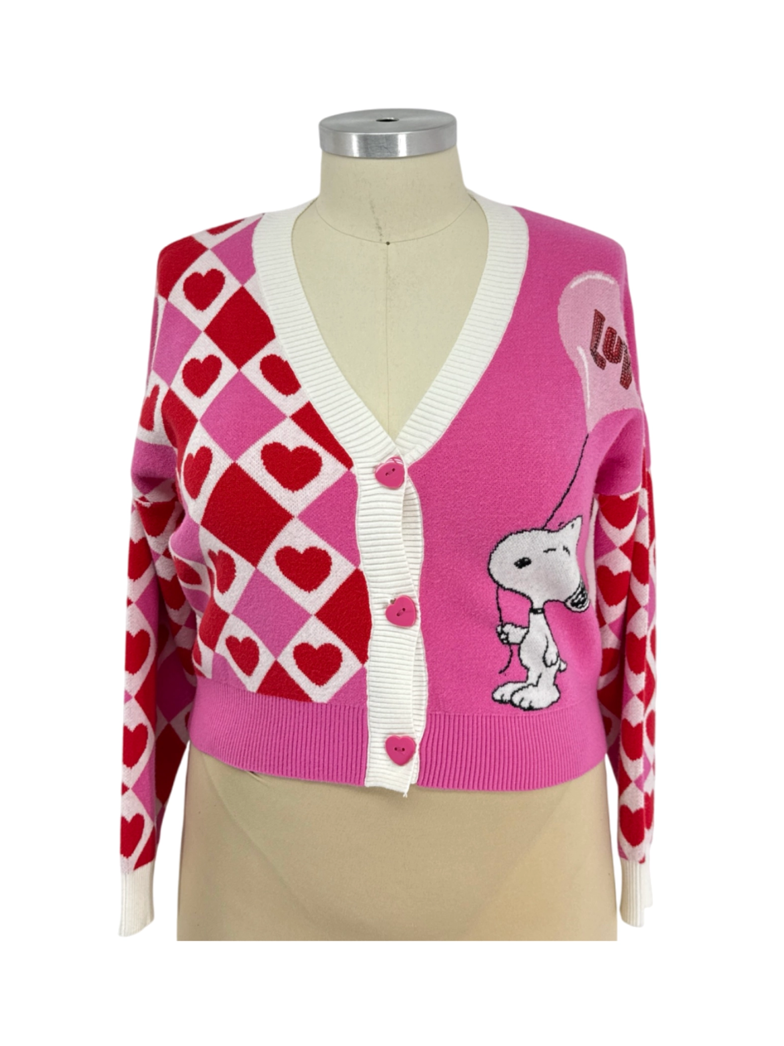 This adorable pre-owned Peanuts cardigan sweater is a must-have for any fan! Featuring Snoopy and heart pattern, it's a perfect blend of comfort and style. Made with a soft blend of rayon, polyester, and nylon, this sweater is perfect for adding a touch of whimsy to your fall and winter wardrobe. With a flattering V-neck and button-up closure, this cozy sweater is ready to add personality to any outfit, showing off your love for the beloved Peanuts characters.