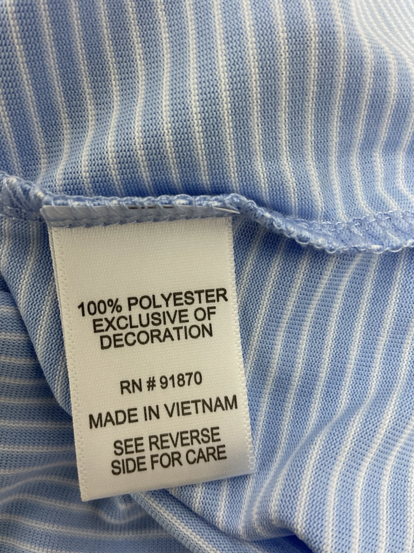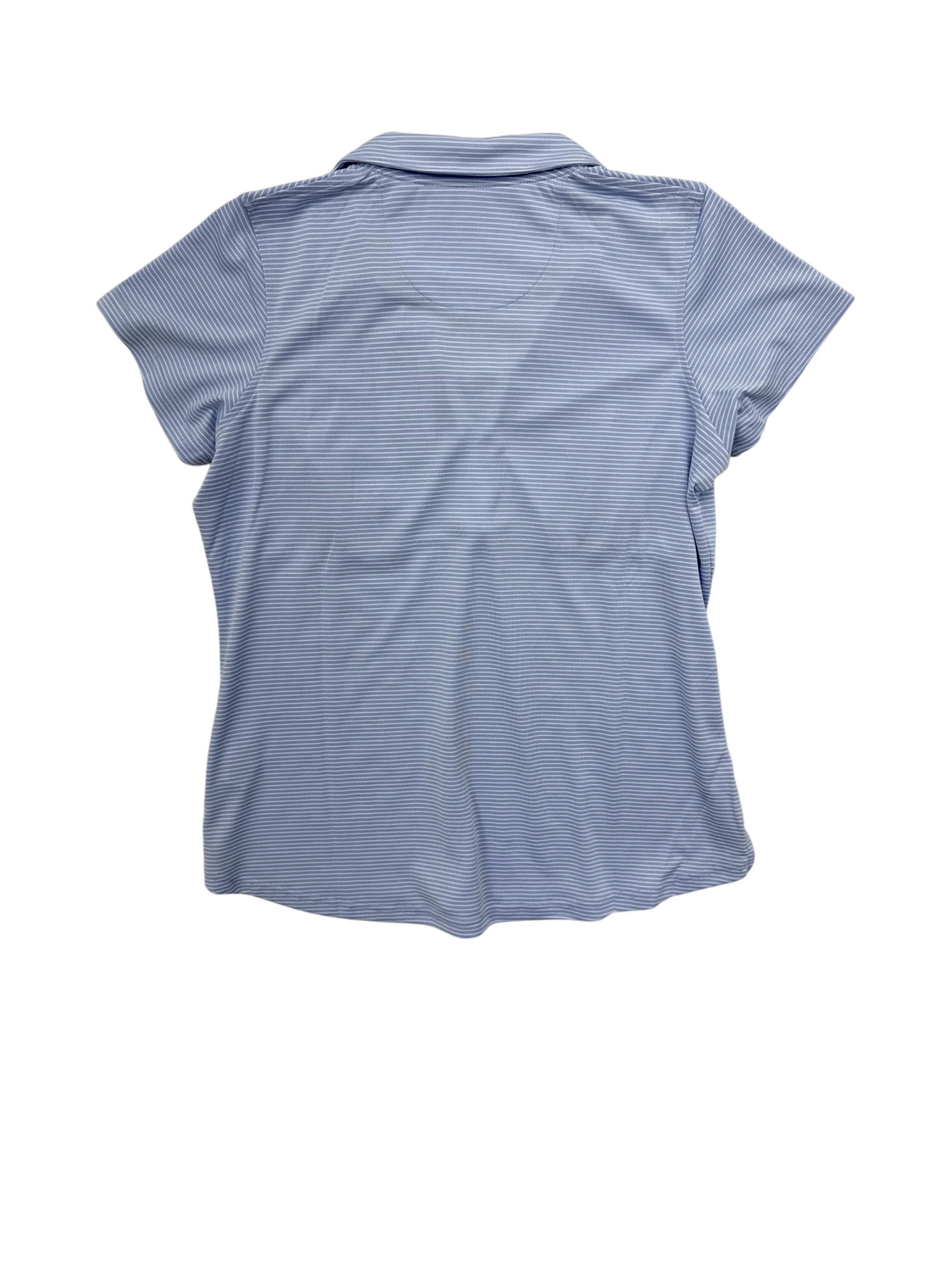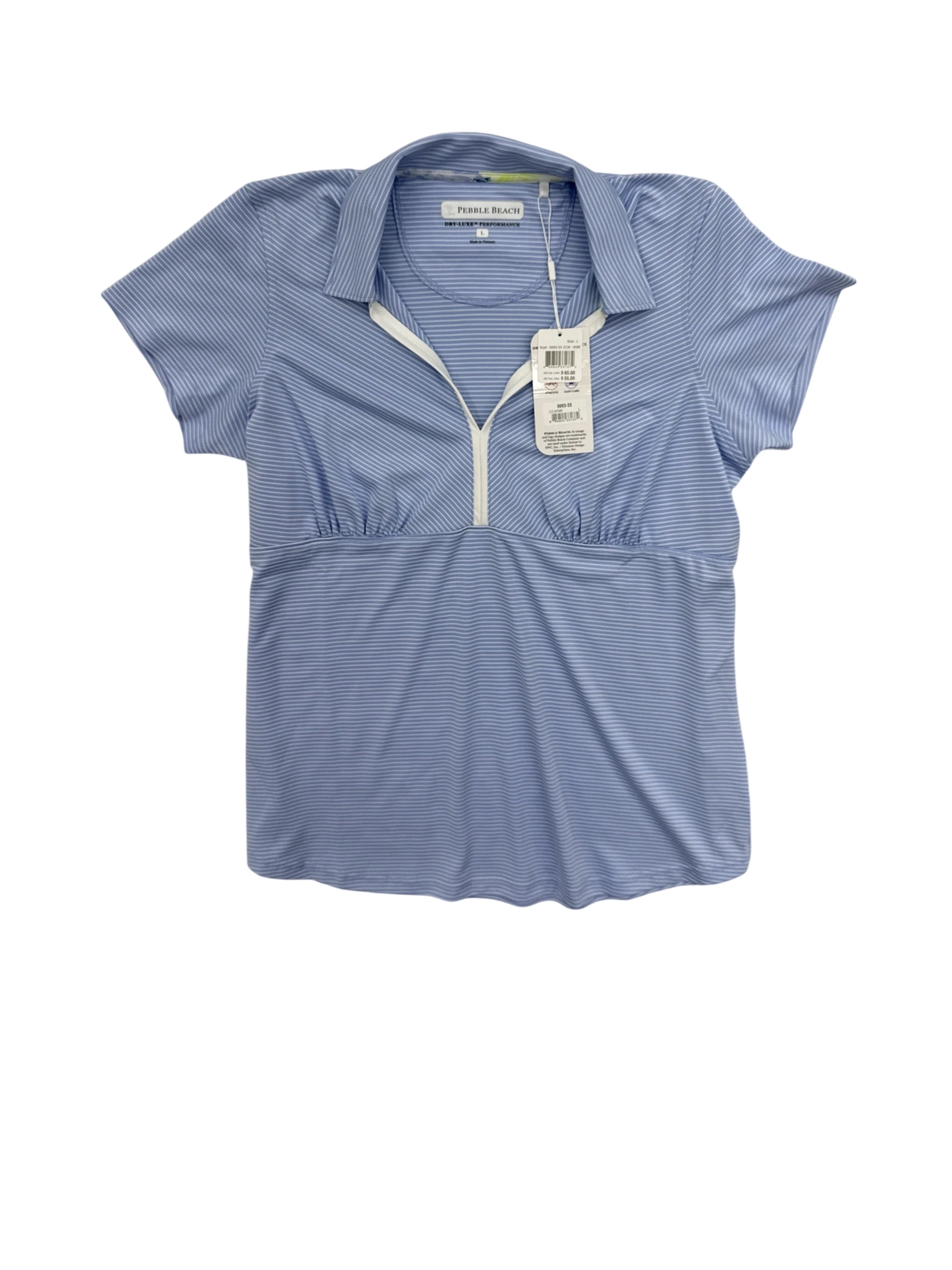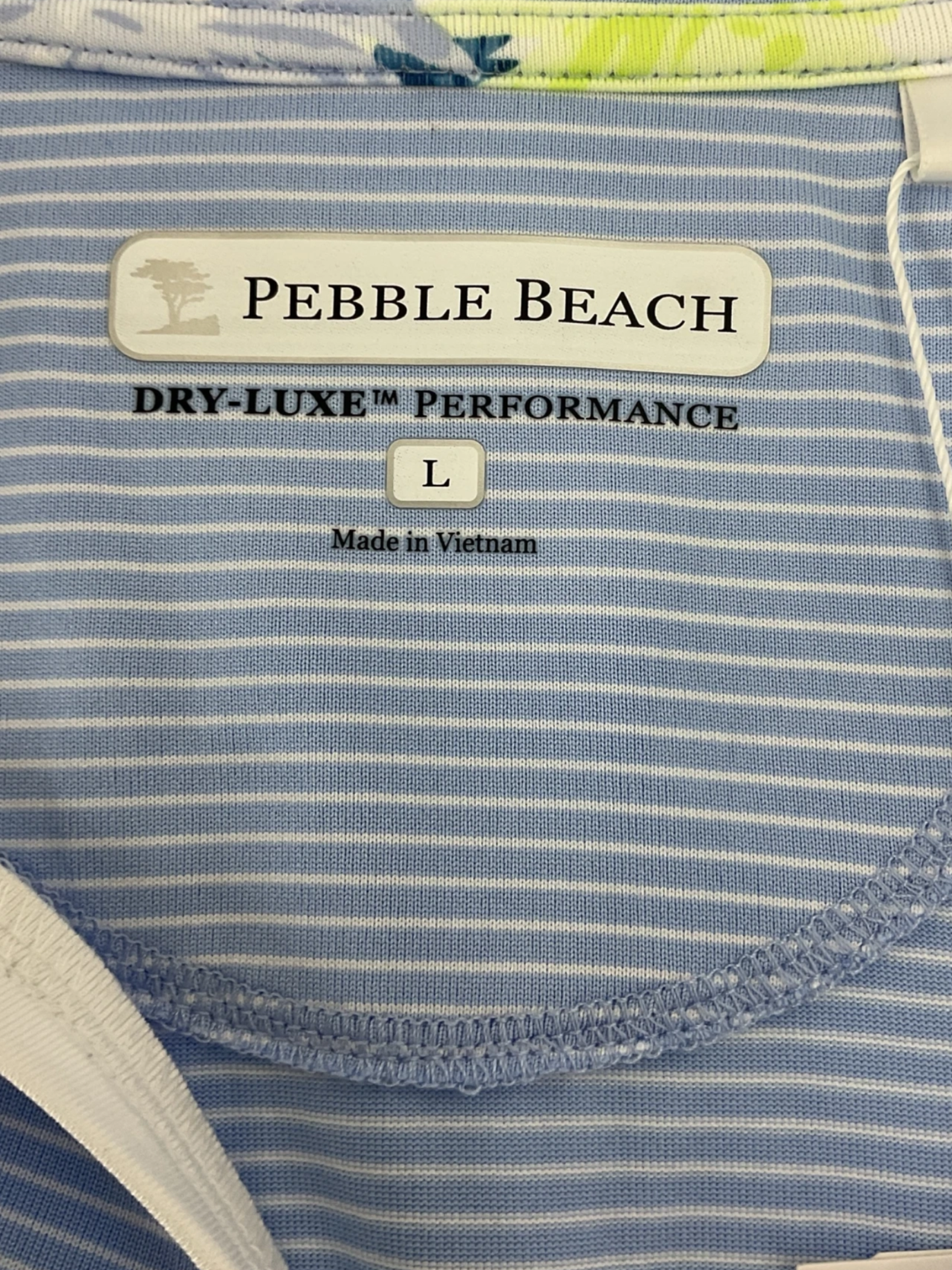 Elevate your golf game with this pre-owned Pebble Beach women's polo shirt. Made from 100% polyester, this shirt offers superior comfort and breathability. Featuring a stylish striped pattern in a lovely blue hue, this polo is perfect for warm weather. It's a size L and in great condition. Whether you're on the course or enjoying a casual day, this top combines performance and style seamlessly.