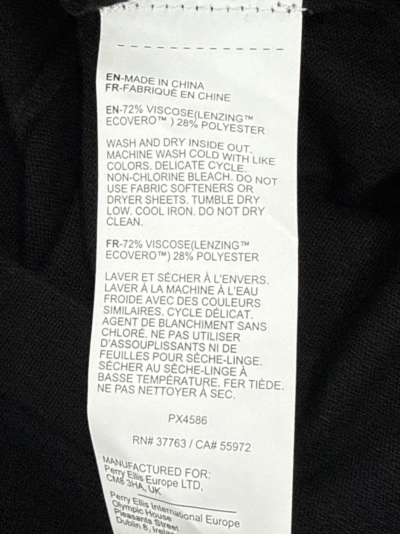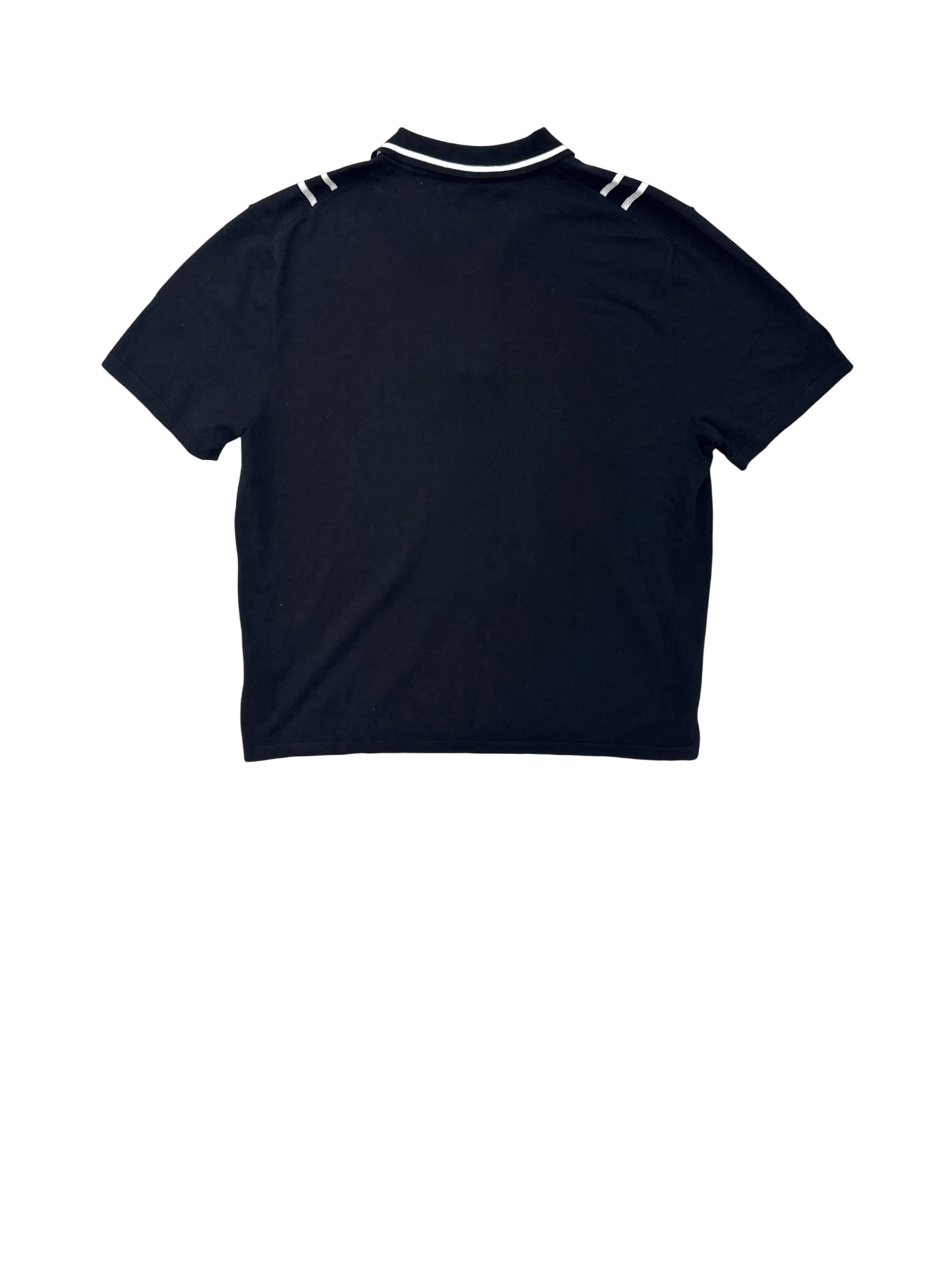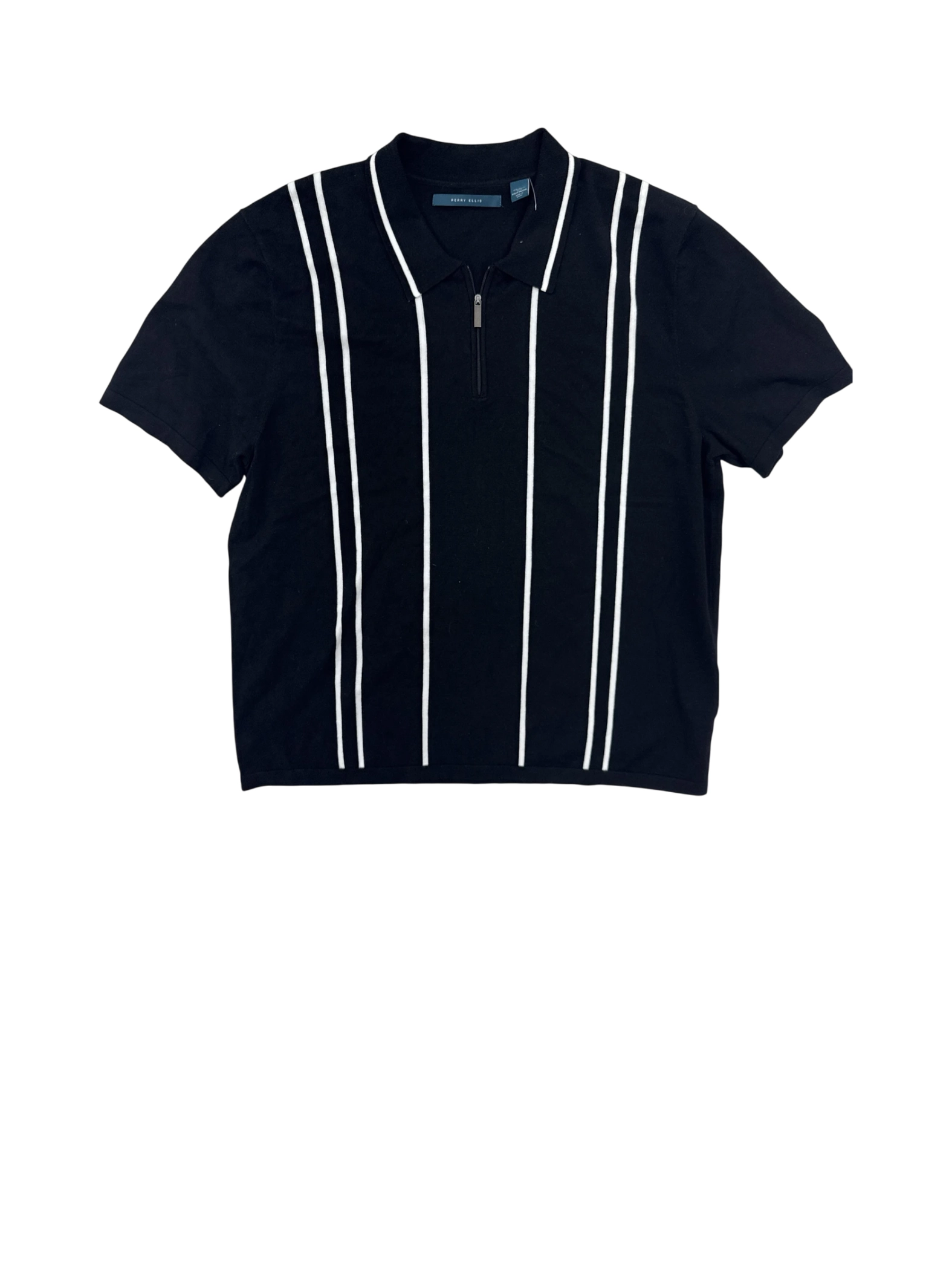Elevate your casual style with this pre-owned PERRY ELLIS polo shirt. This stylish top features a sleek black base accented with crisp white stripes, creating a modern and versatile look. Crafted from a blend of viscose and polyester, this polo offers both comfort and durability. The shirt features a classic collar, a convenient zipper closure, and short sleeves, perfect for warm weather. Ideal for a smart casual look, this PERRY ELLIS polo is a timeless addition to any wardrobe.