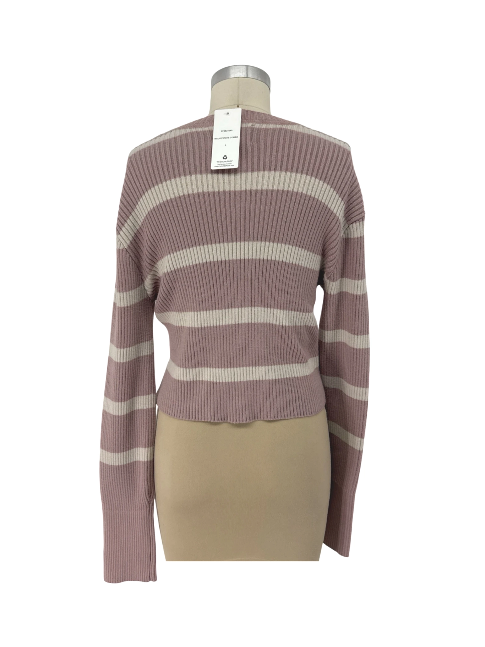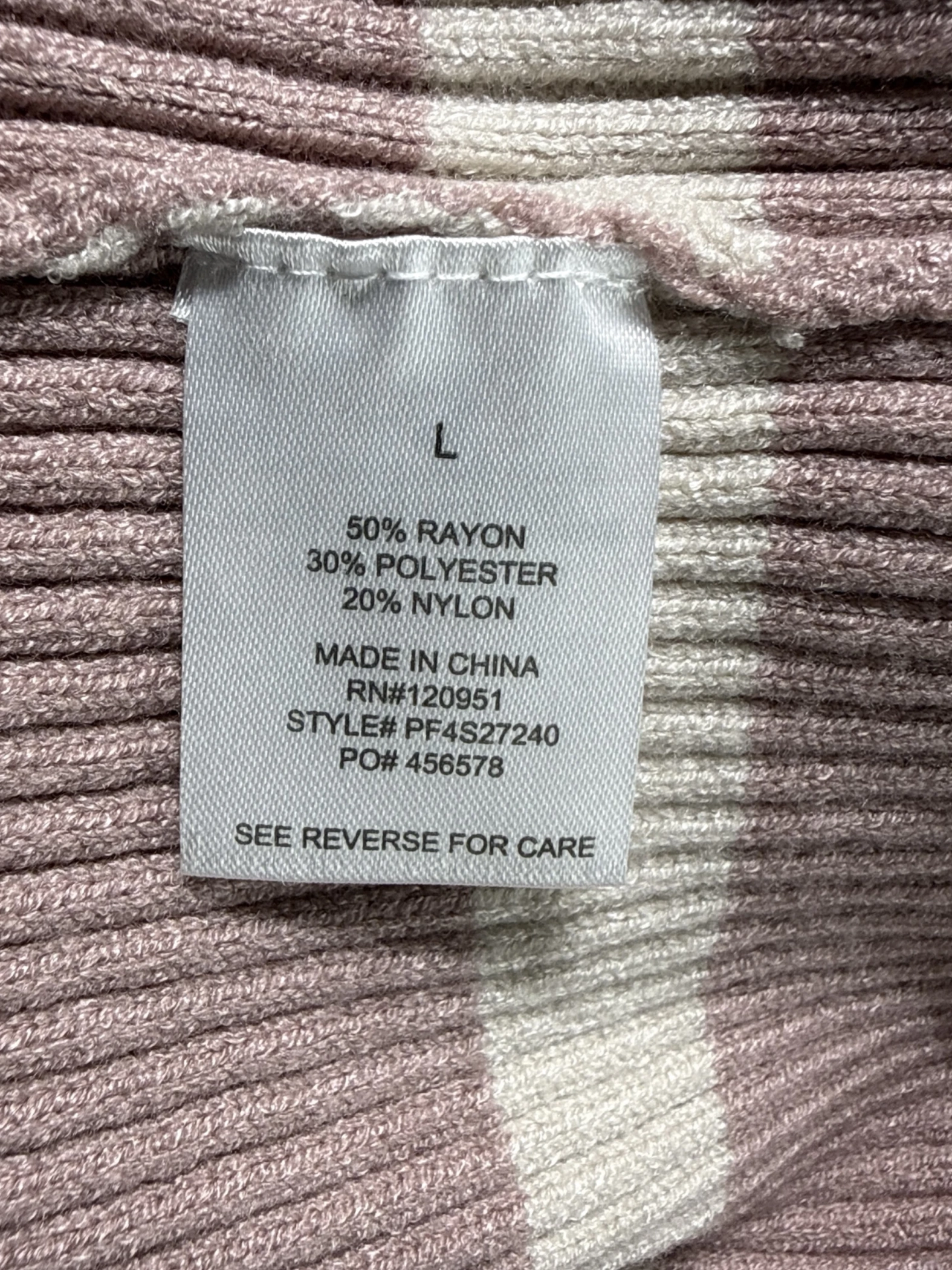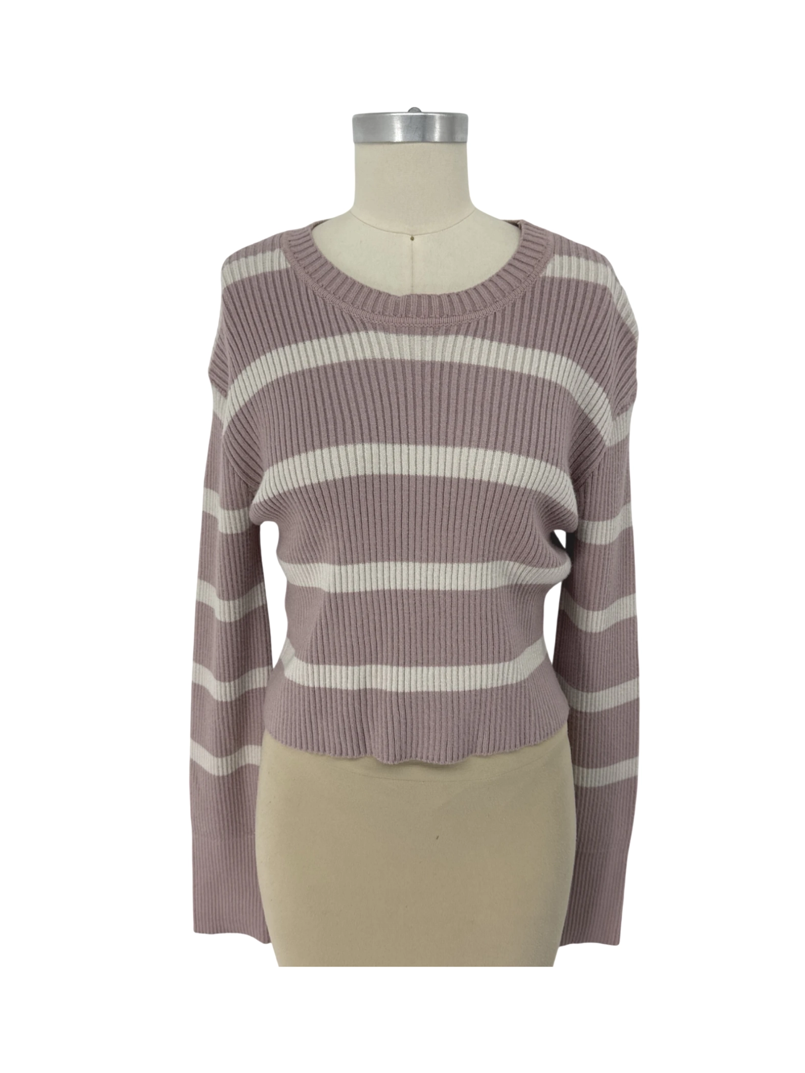 Elevate your wardrobe with this pre-owned PINK ROSE sweater. Crafted with a flattering striped design, this sweater offers a cozy yet stylish look. It features a classic round neckline, perfect for layering. Ideal for transitional weather, this sweater combines comfort and style. Made from a blend of Rayon, Polyester, and Nylon. Embrace a timeless piece that adds versatility to your closet.