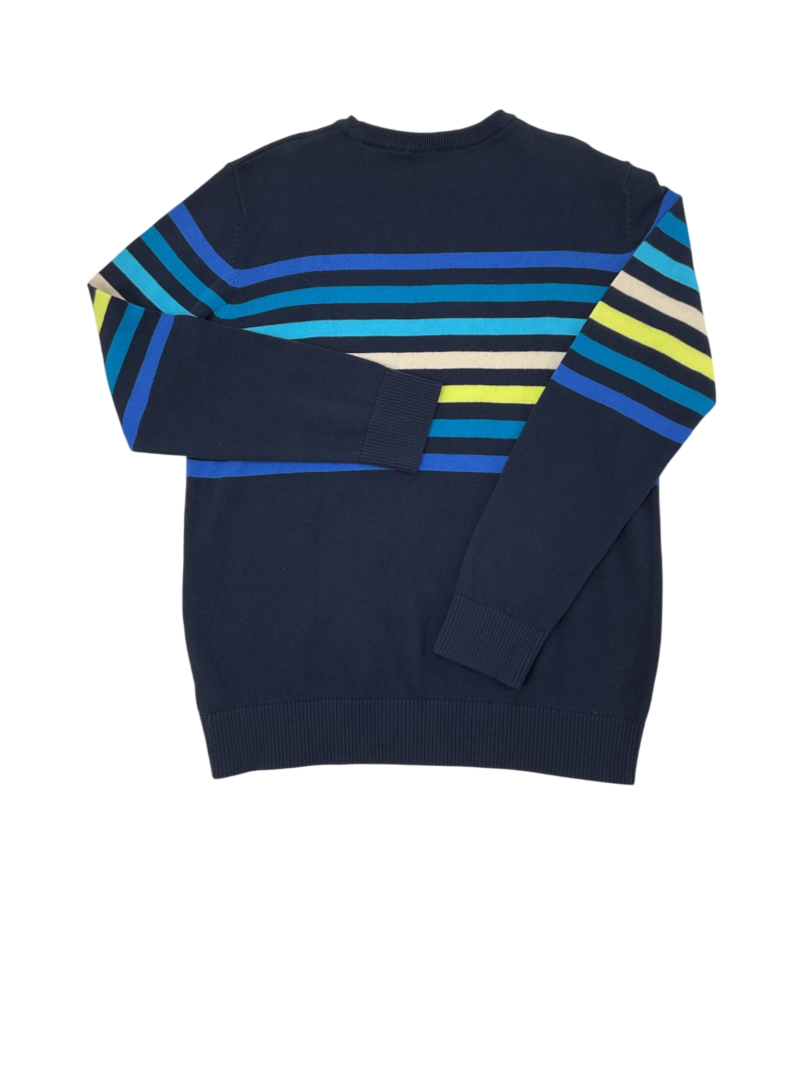 A navy sweater for a boy with multicolored stripes in size 14 from the brand Place.