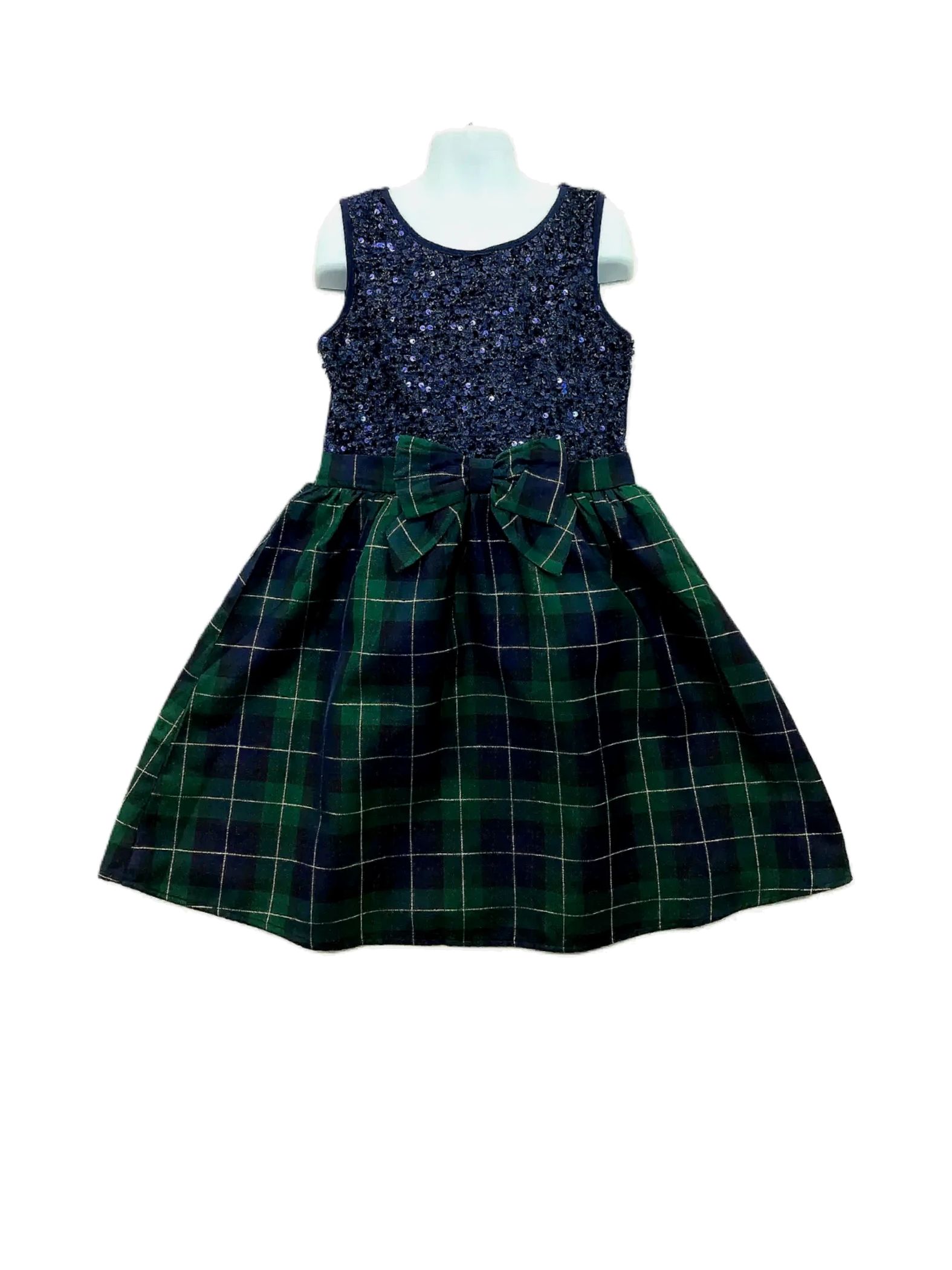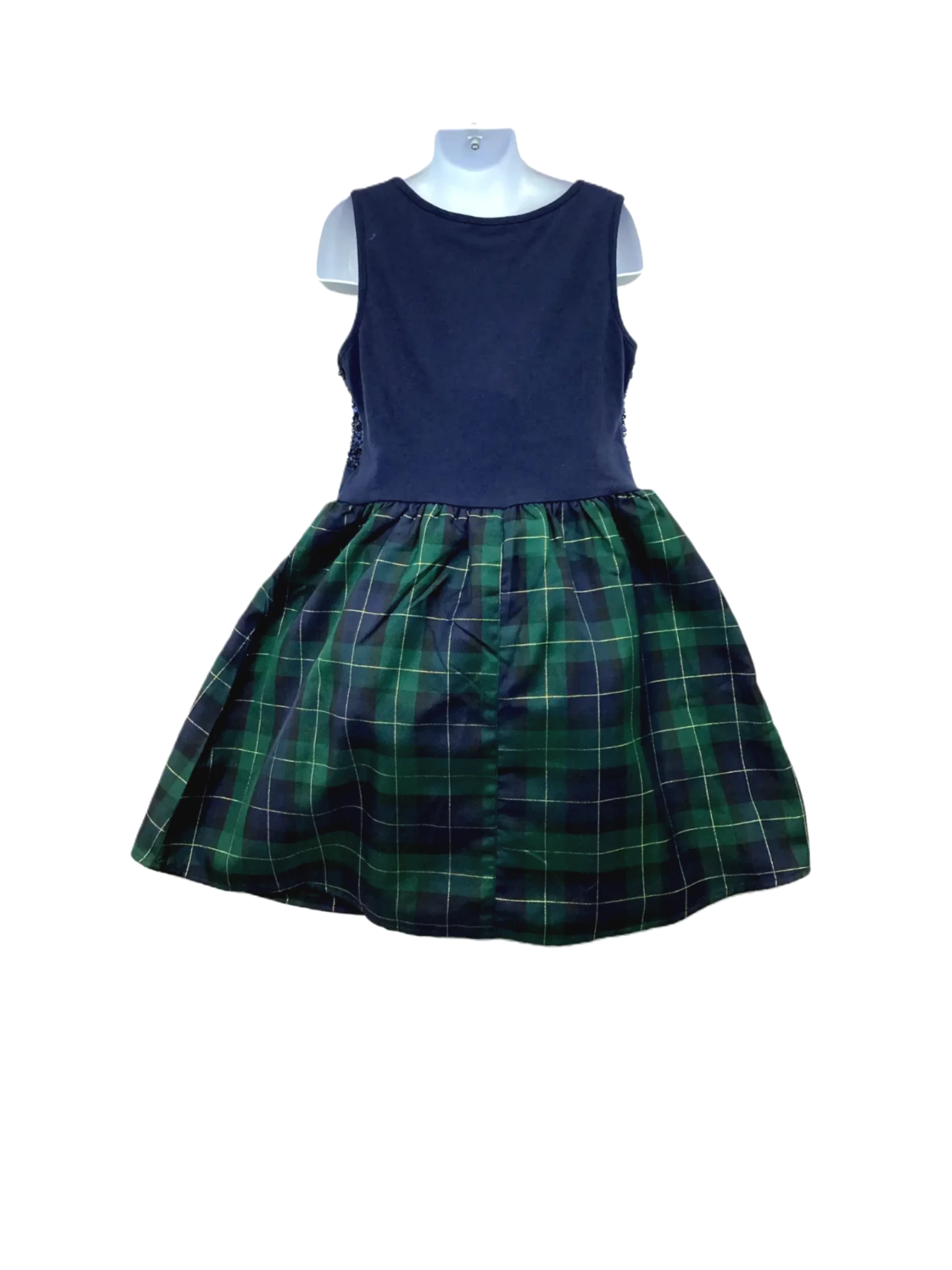 This is a green and blue knit-to-woven dress with sequin plaid design for girls in size 8.