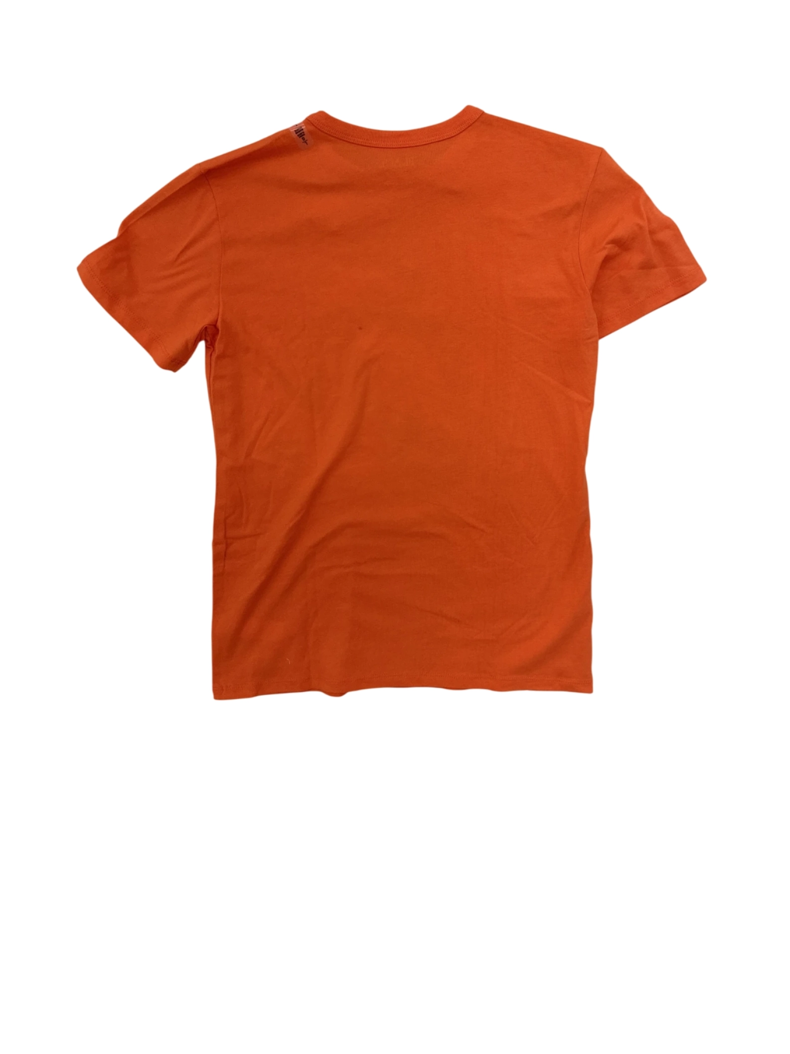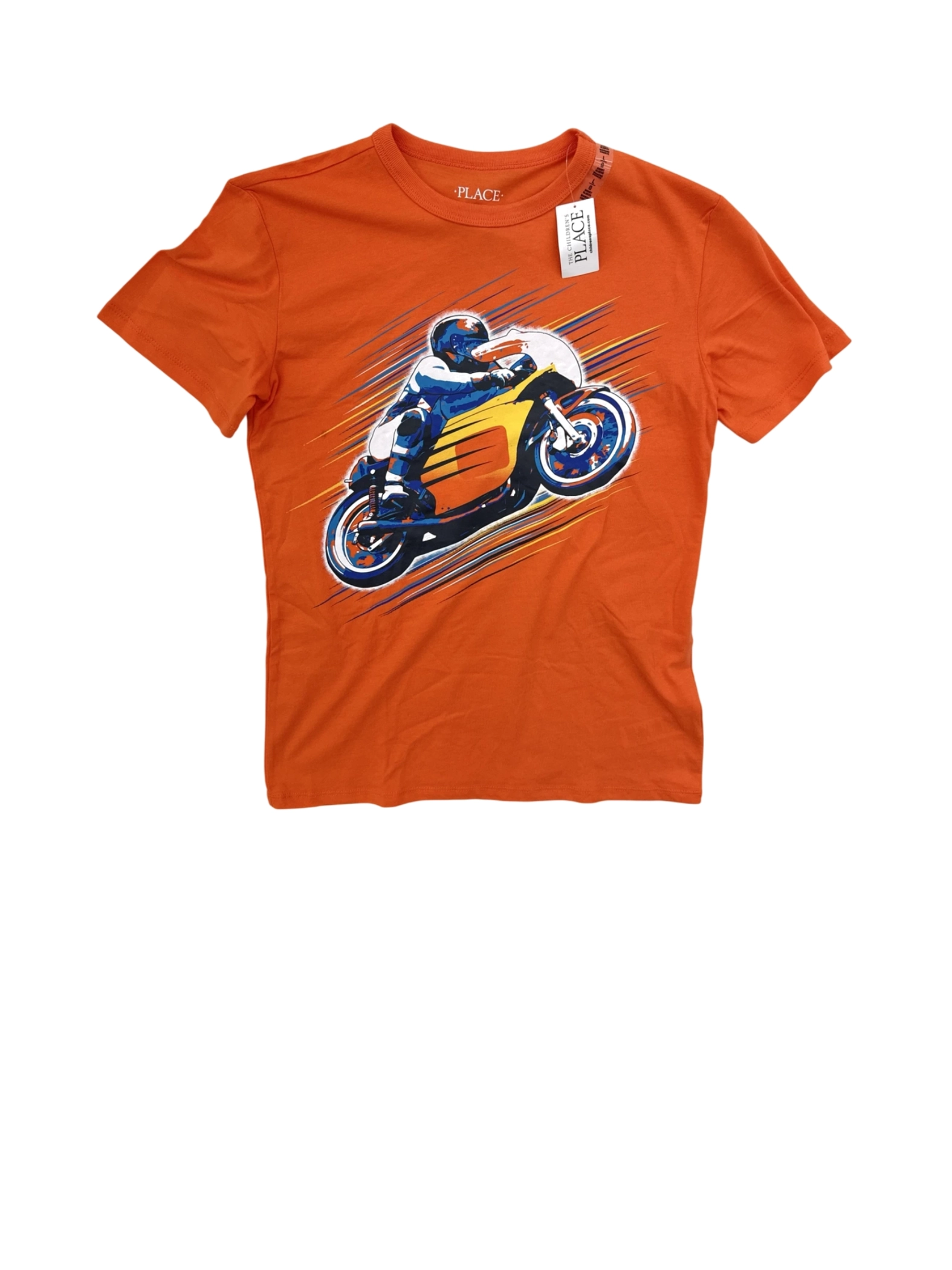 This vibrant pre-owned boys' t-shirt from Place is a must-have for young motorsport enthusiasts. Featuring a dynamic graphic of a motorcycle racer, this tee is made from a comfortable cotton-polyester blend. The short-sleeve design and crew neck make it perfect for warm weather. This stylish shirt is in great condition, ready for new adventures. Get a great value on this trendy piece!