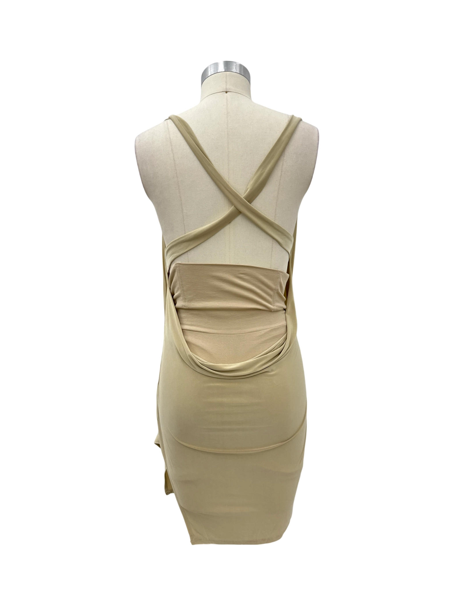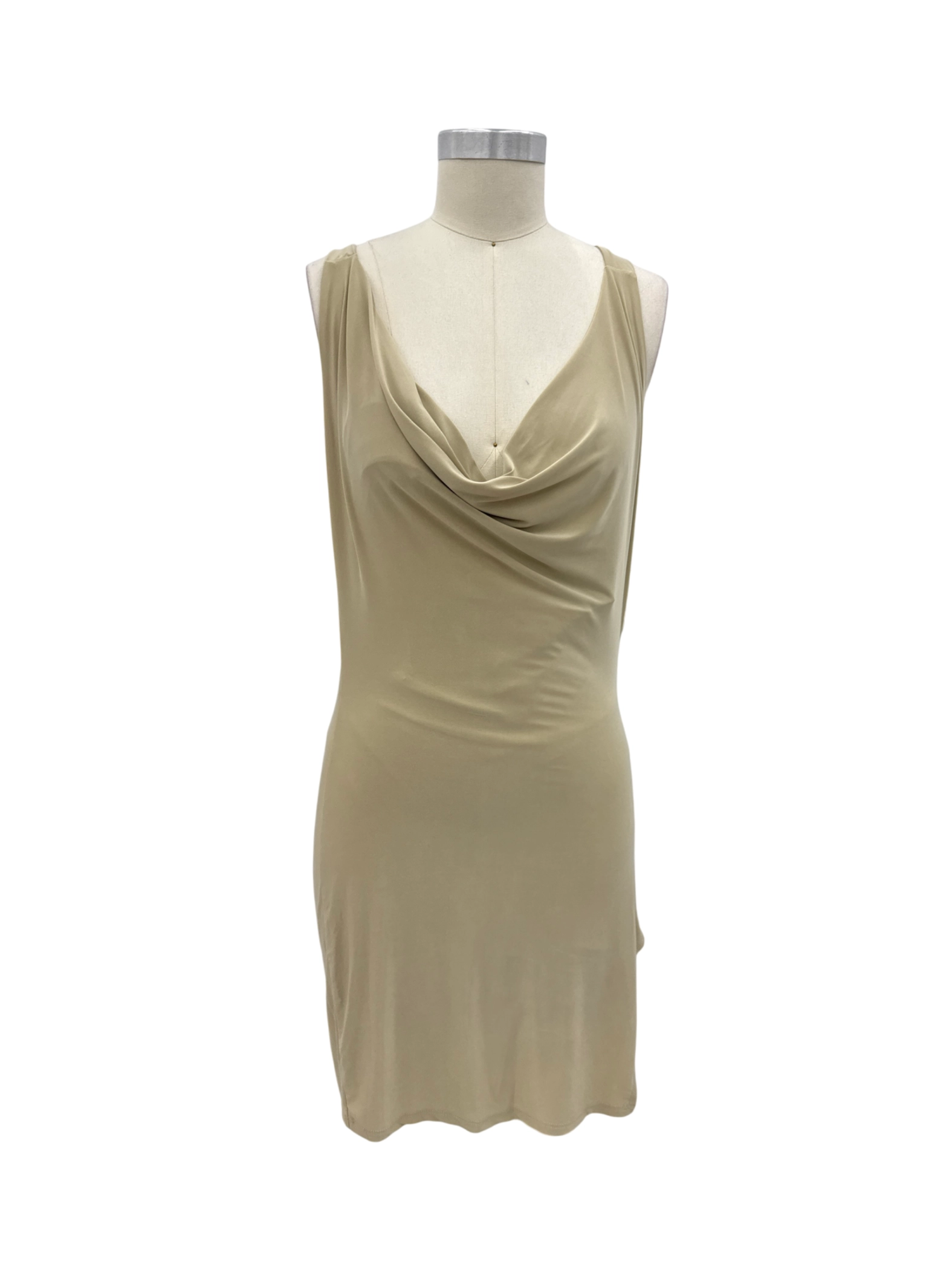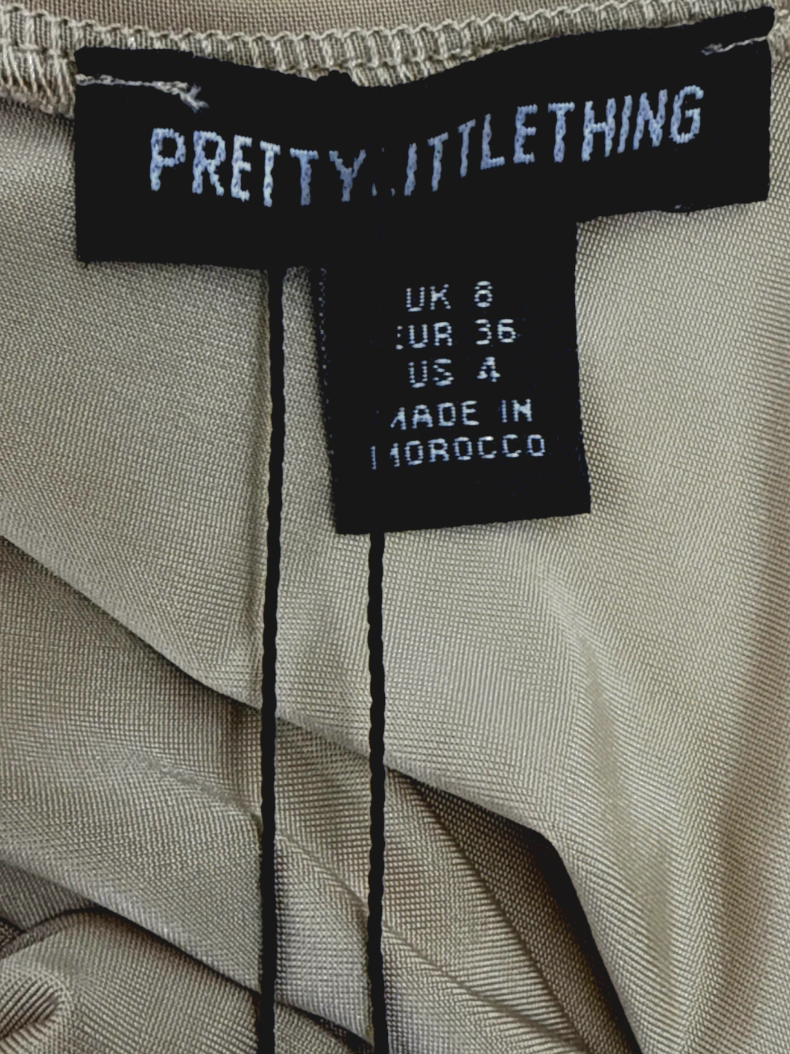 This PRETTY LITTLE THING dress is a stylish and versatile addition to your wardrobe. The dress features a flattering cowl neck, sleeveless design, and bodycon fit, perfect for warm weather. Crafted from a blend of polyester and spandex, this dress offers a comfortable and flattering fit. Its mini skirt length adds a touch of sophistication, making it suitable for casual outings. Its neutral color makes it easy to pair with various accessories. It's a second-hand item, offering great value for a trendy piece.